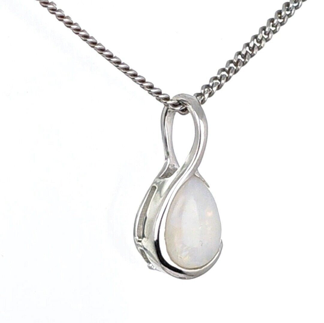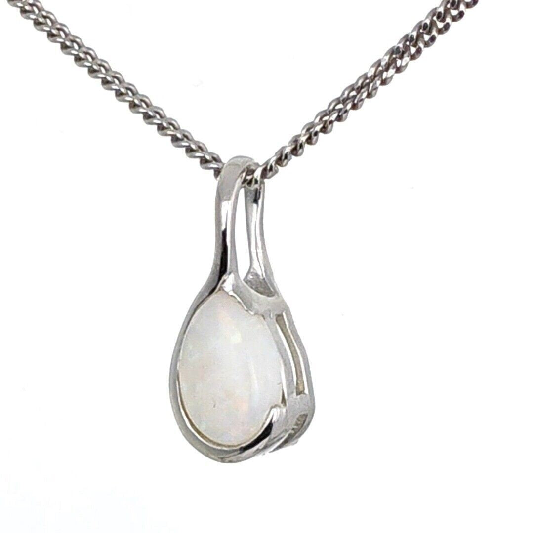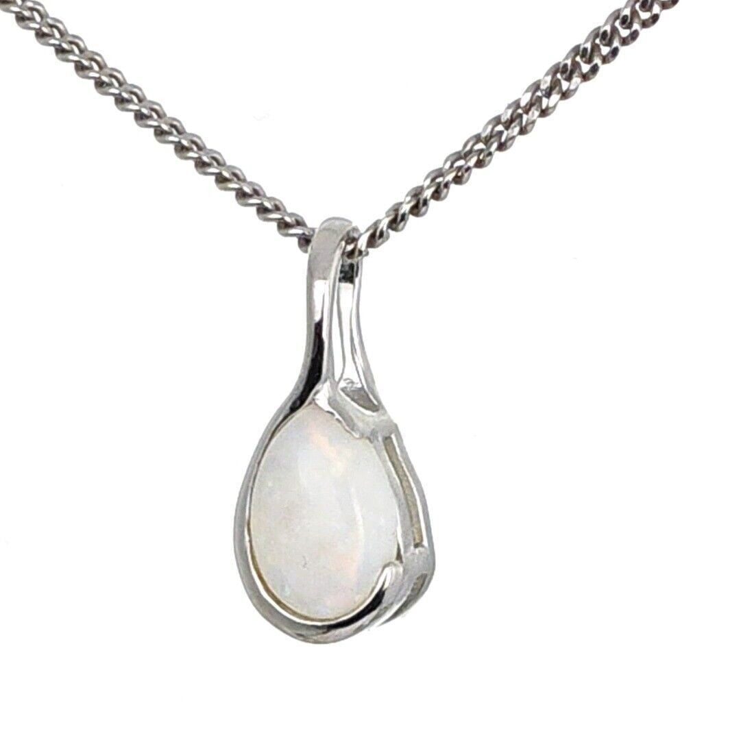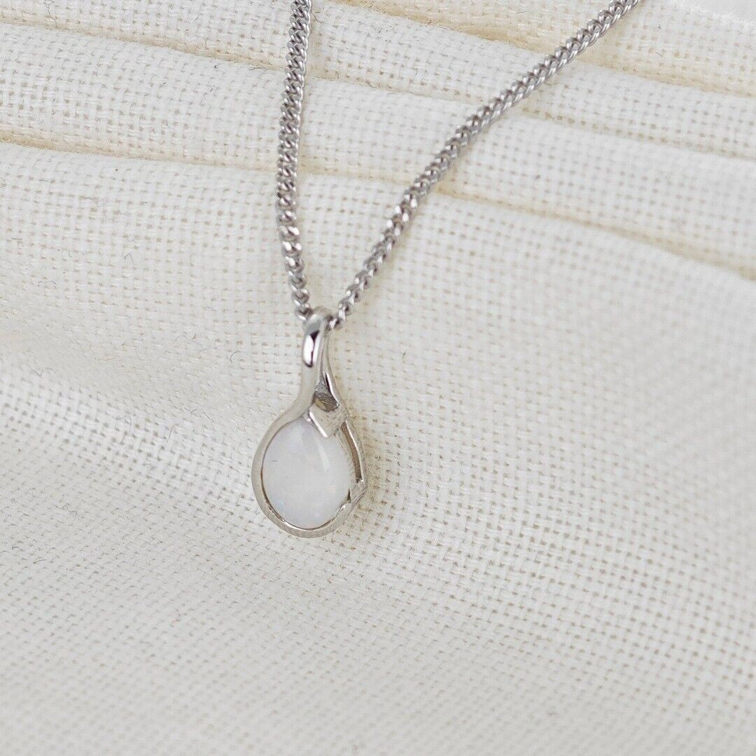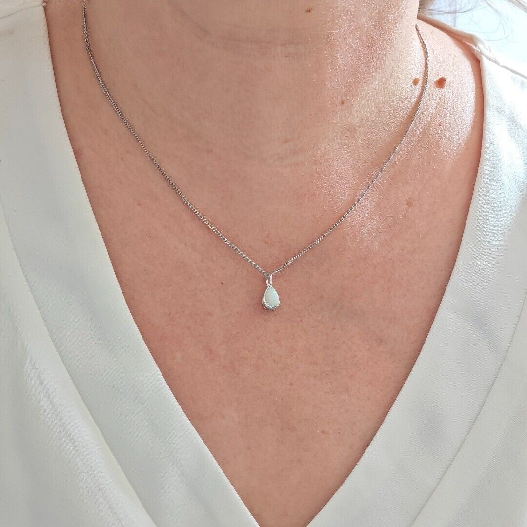 Elegant opal necklace. Natural Australian white opal set in a raised rub over setting made of sterling silver to allow light to the back of the stone and show off its natural sparkle. The stone measures 7x5 mm.
