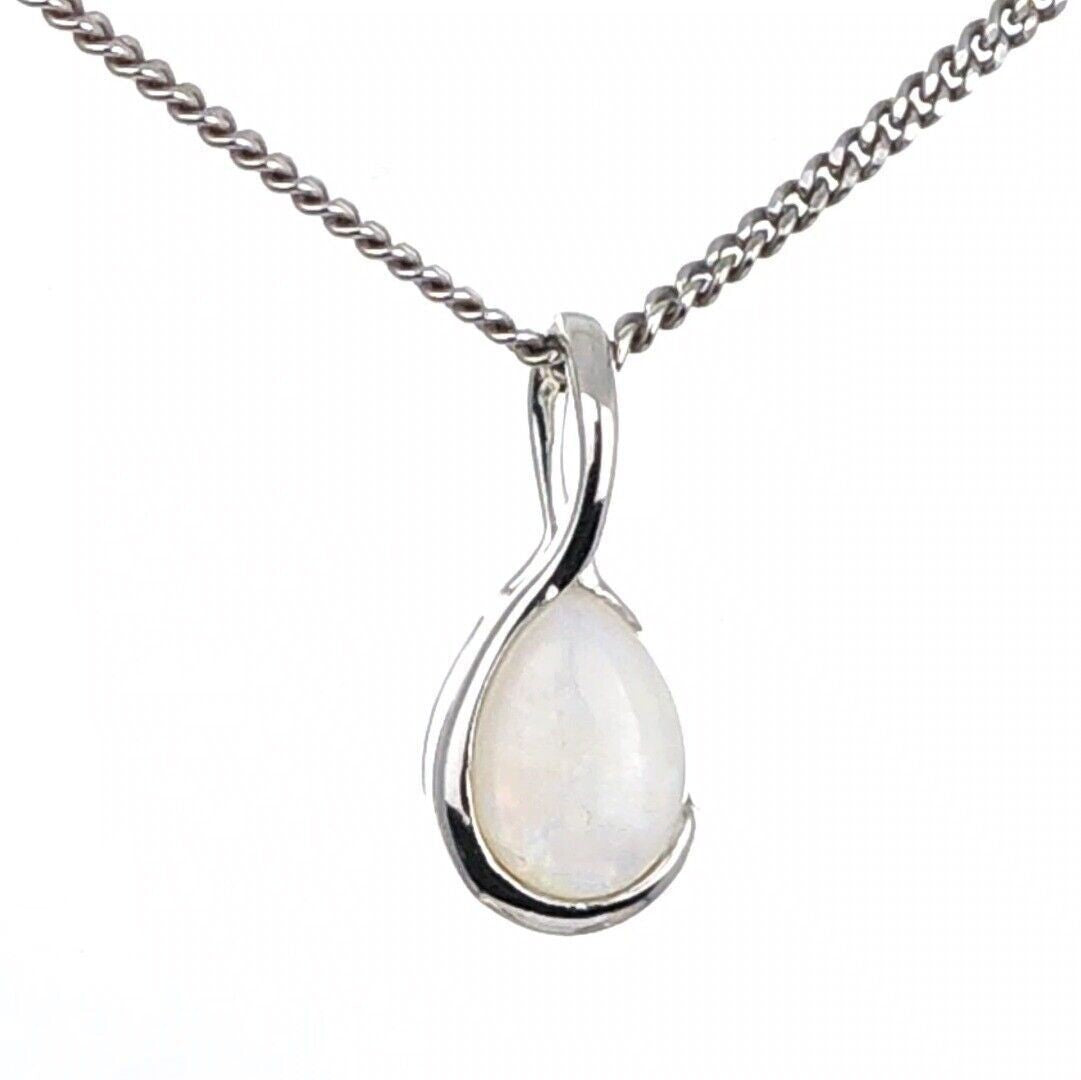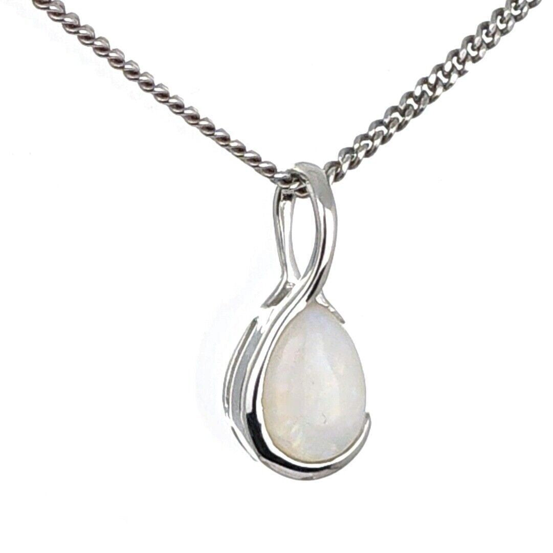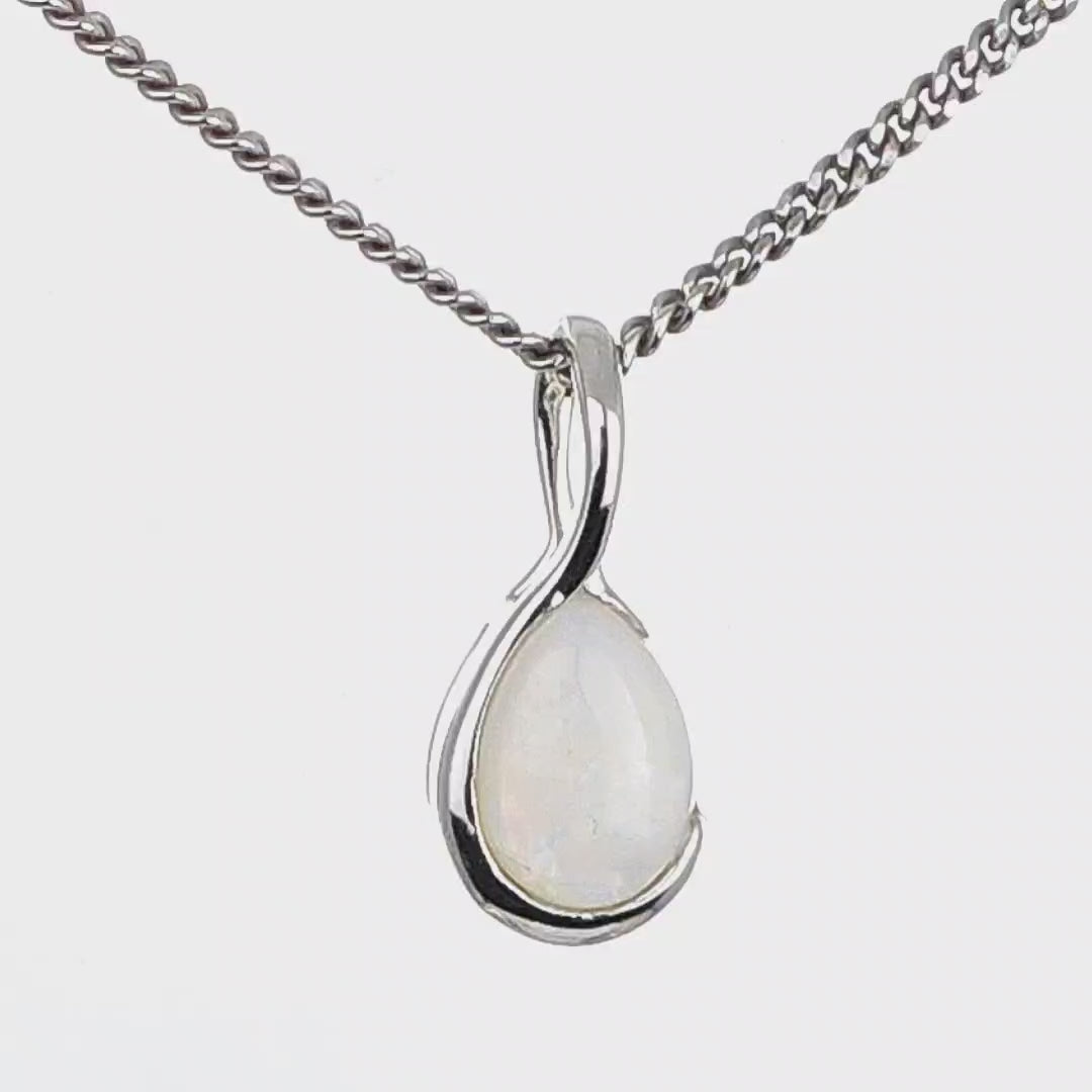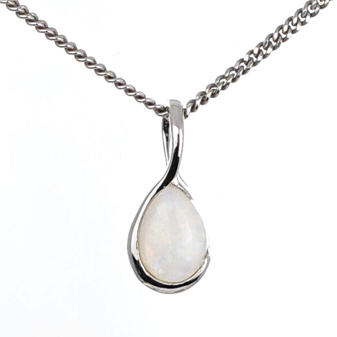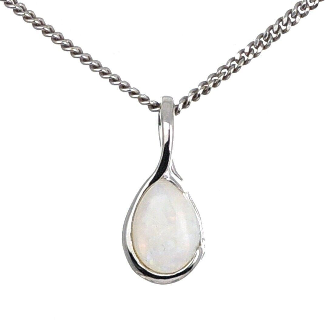 Elegant opal necklace. Natural Australian white opal set in a raised rub over setting made of sterling silver to allow light to the back of the stone and show off its natural sparkle. The stone measures 7x5 mm.