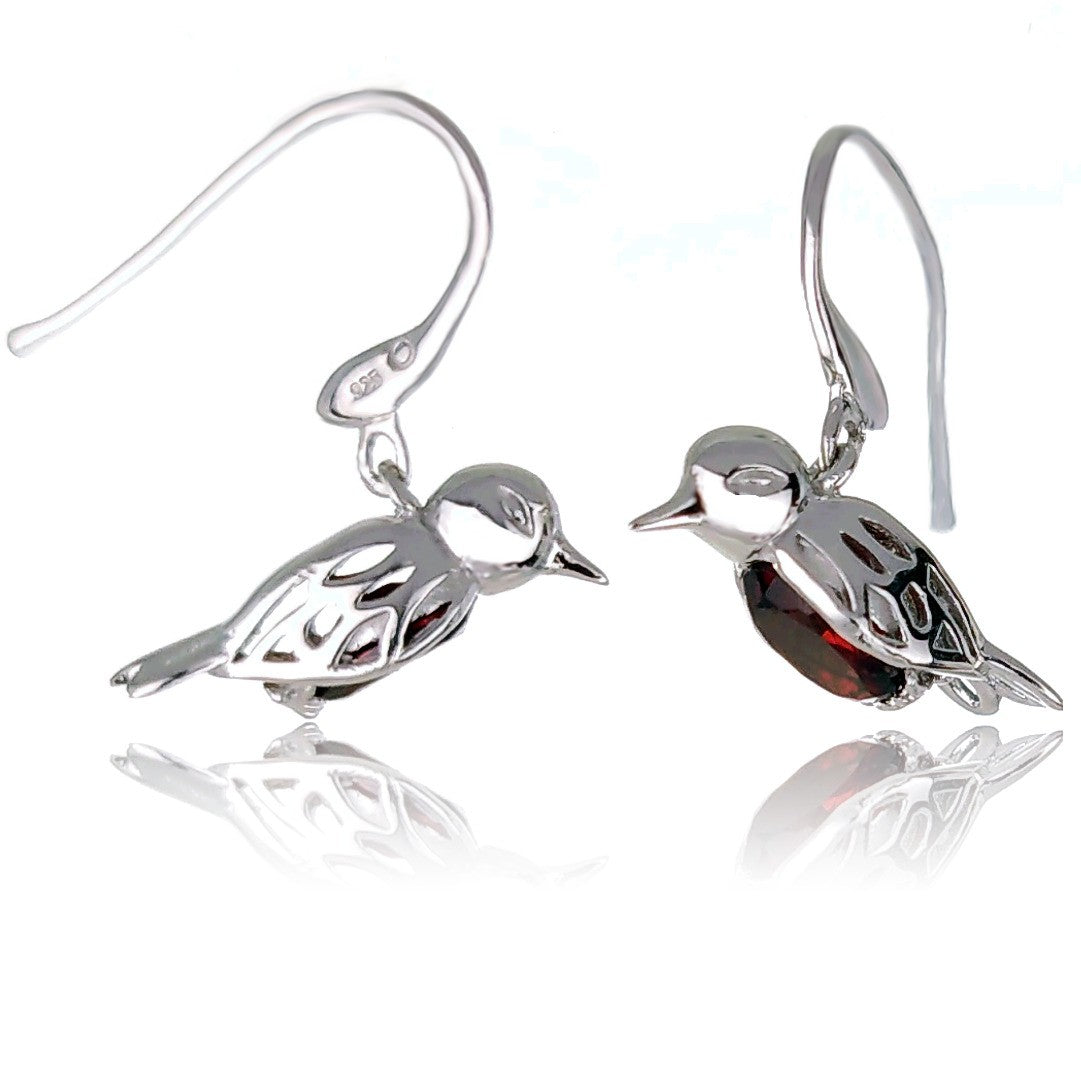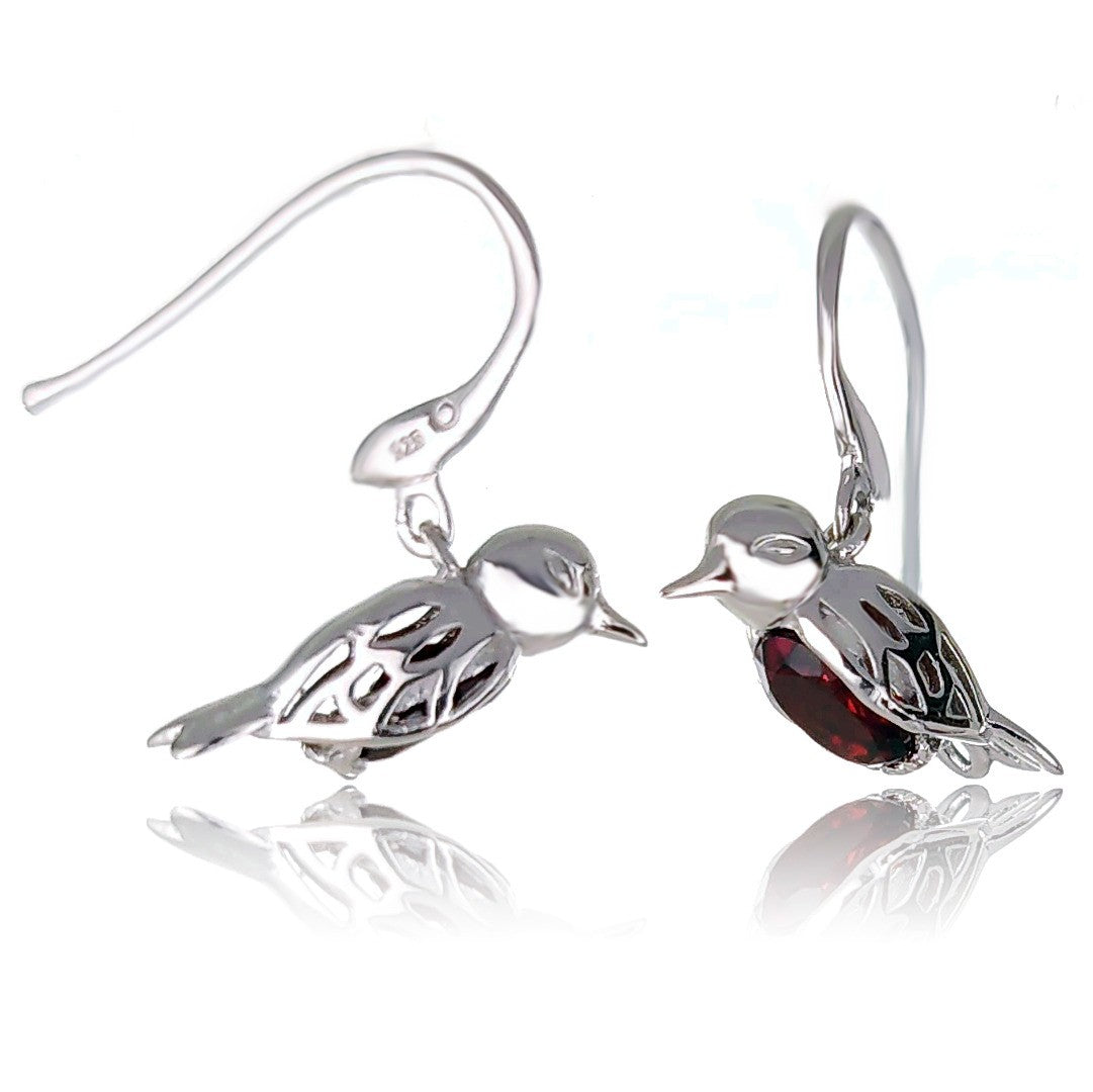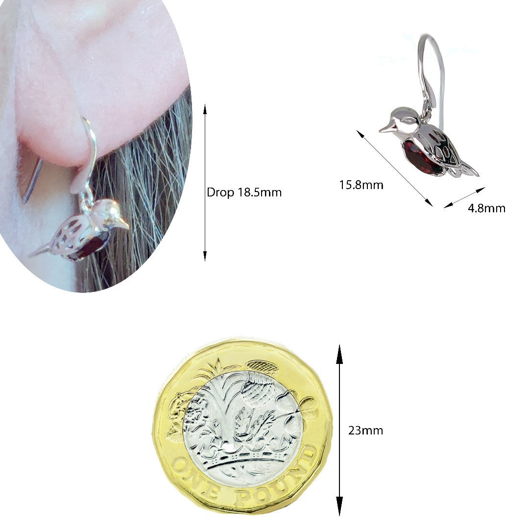 Robin Red Breast Earrings Sterling Silver Real Garnet Dangle Personalised Christmas Gift January Birthstone