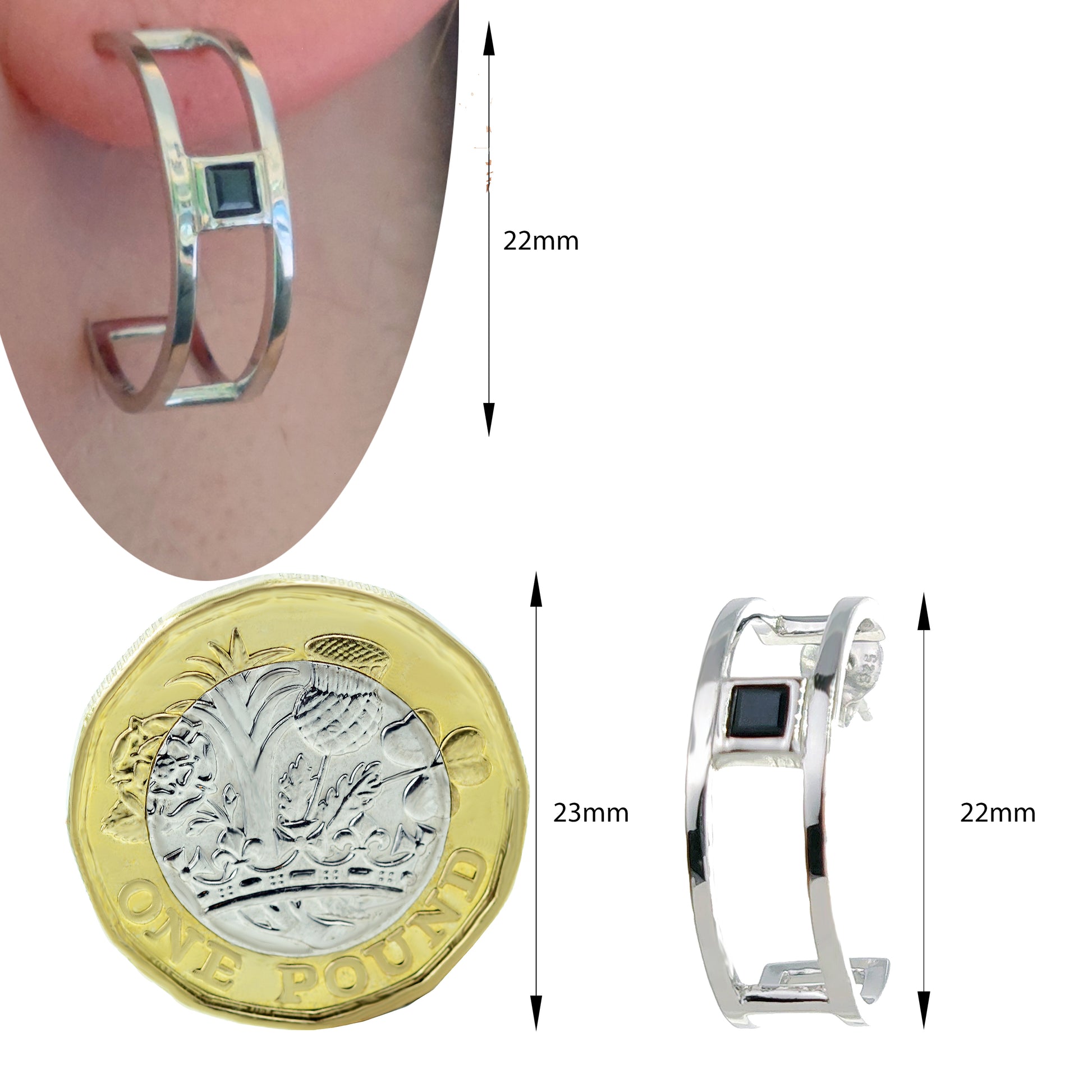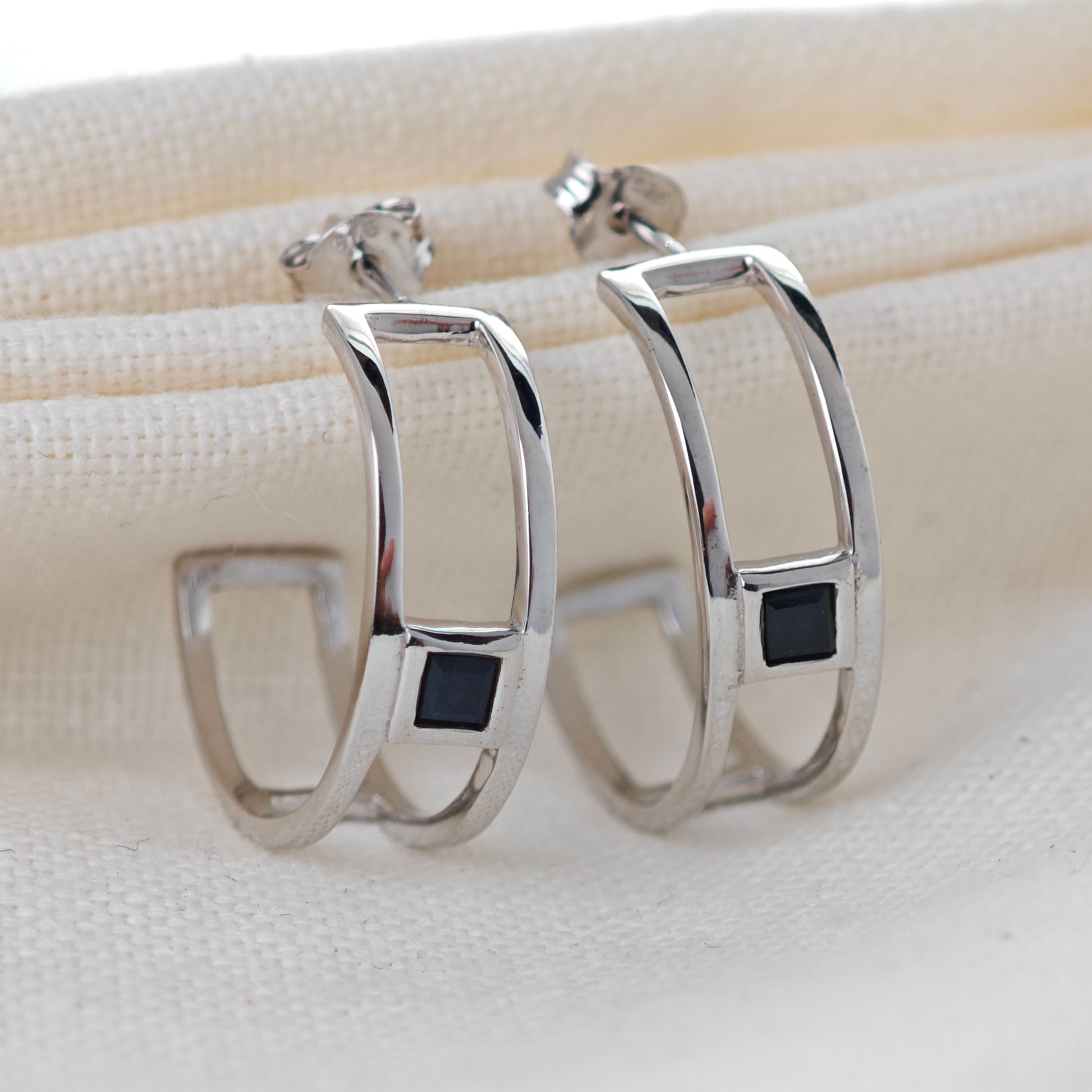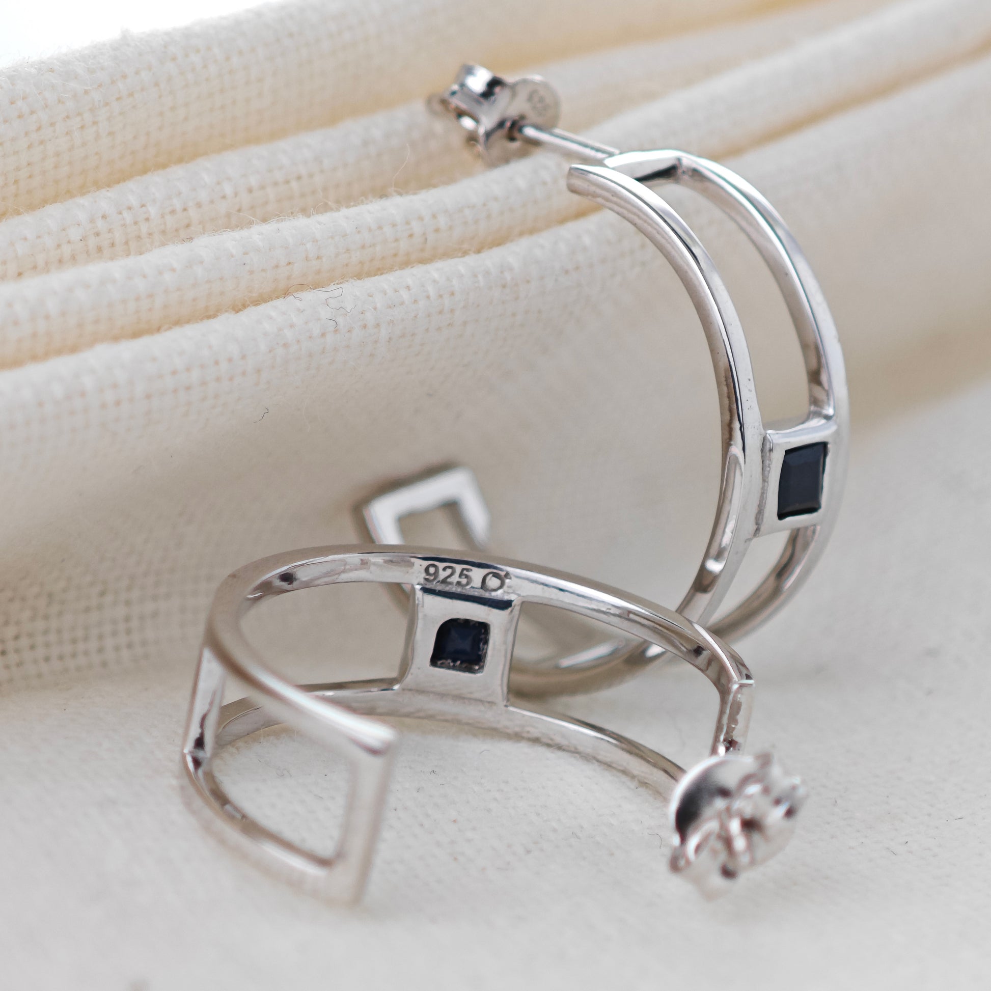 Elegant sterling silver contemporary hoop look earrings are finished with a rhodium plate to give a bright shine. They are each set with a square natural Australian sapphire.