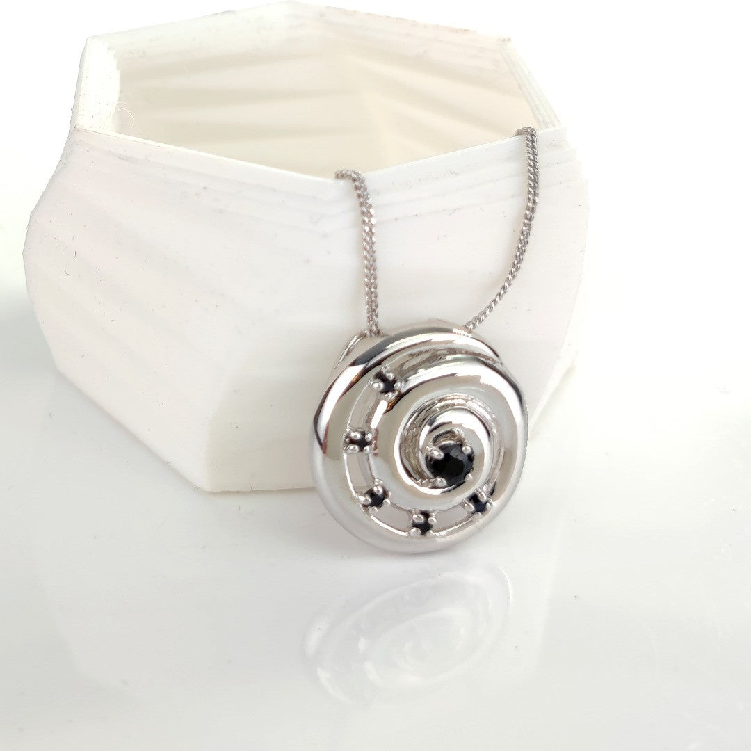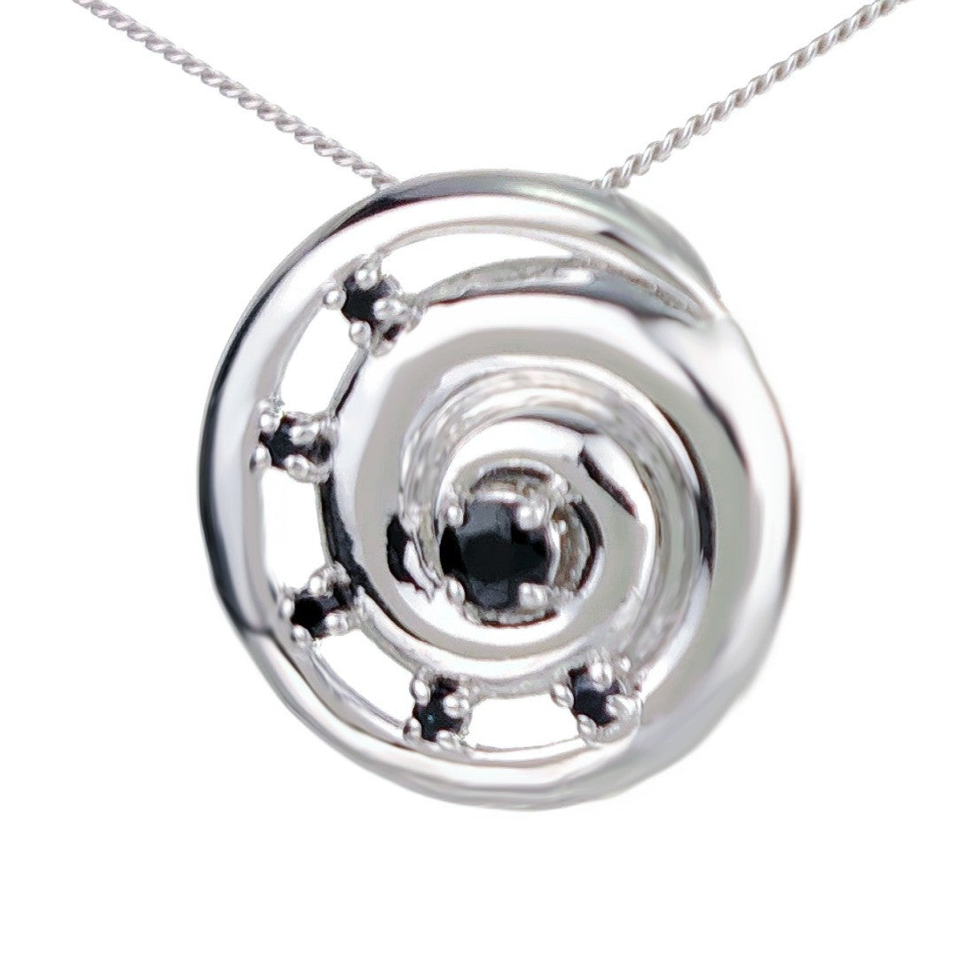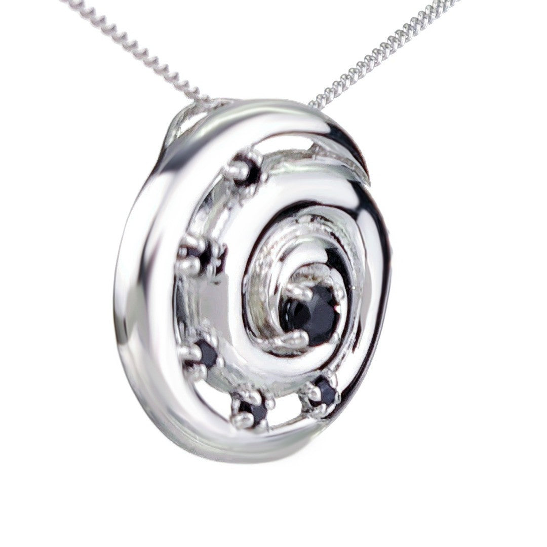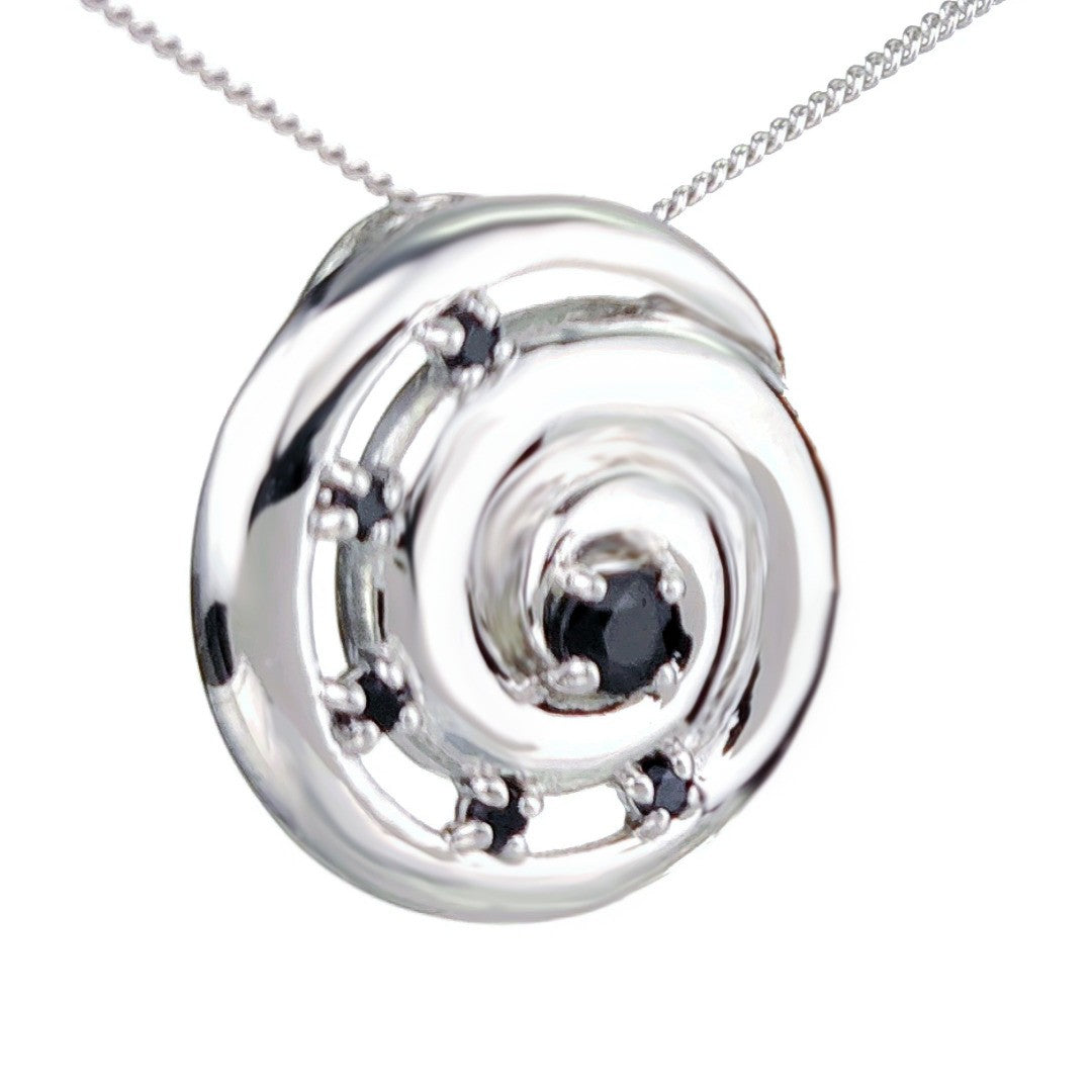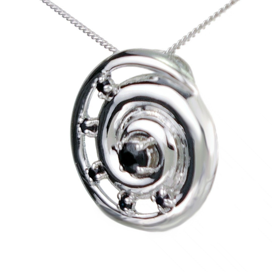 Elegant ammonite statement pendant set with six natural Australian inky blue sapphires. The central sapphire is 4mm and surrounding stones each 2mm diameter giving a total carat weight of 0.59ct.