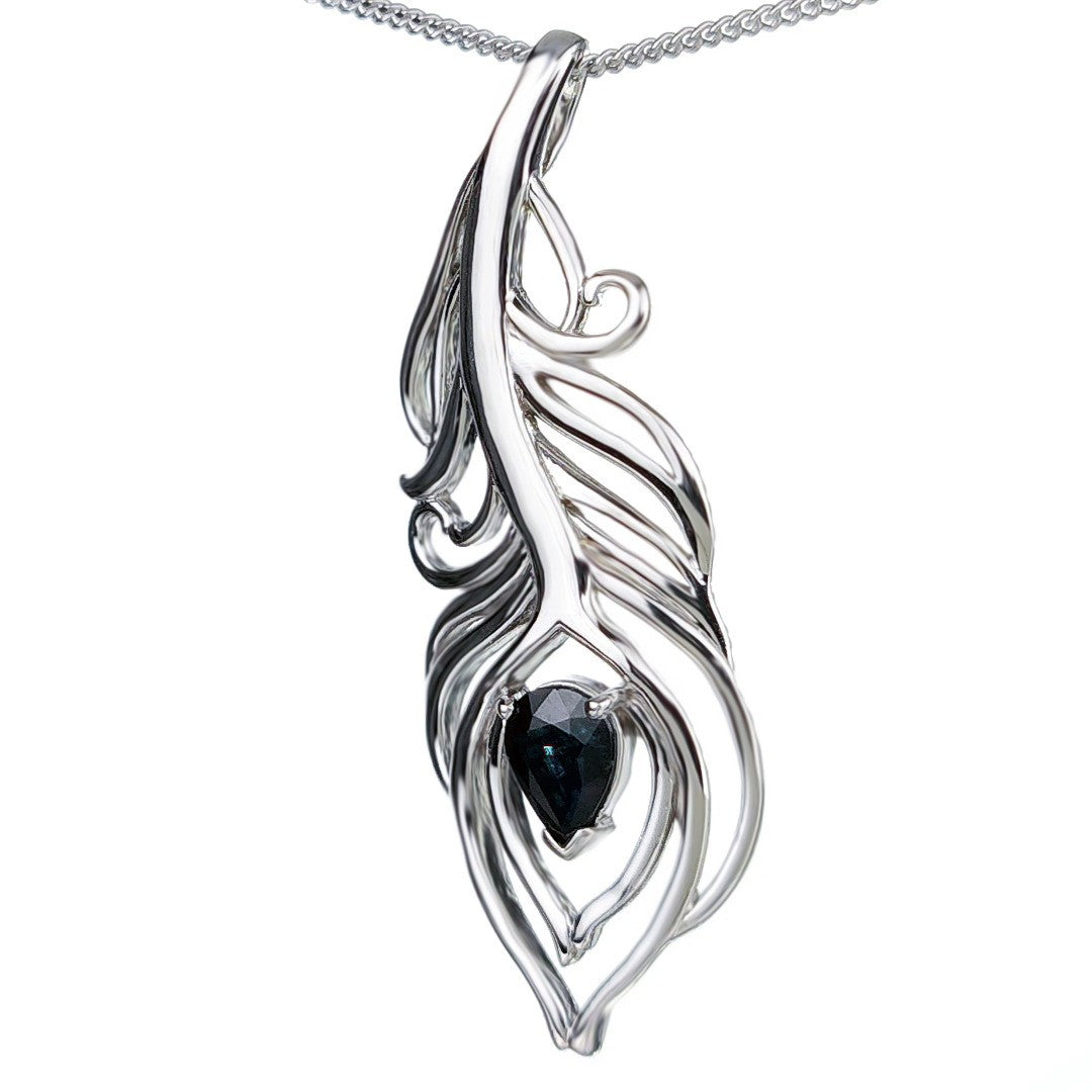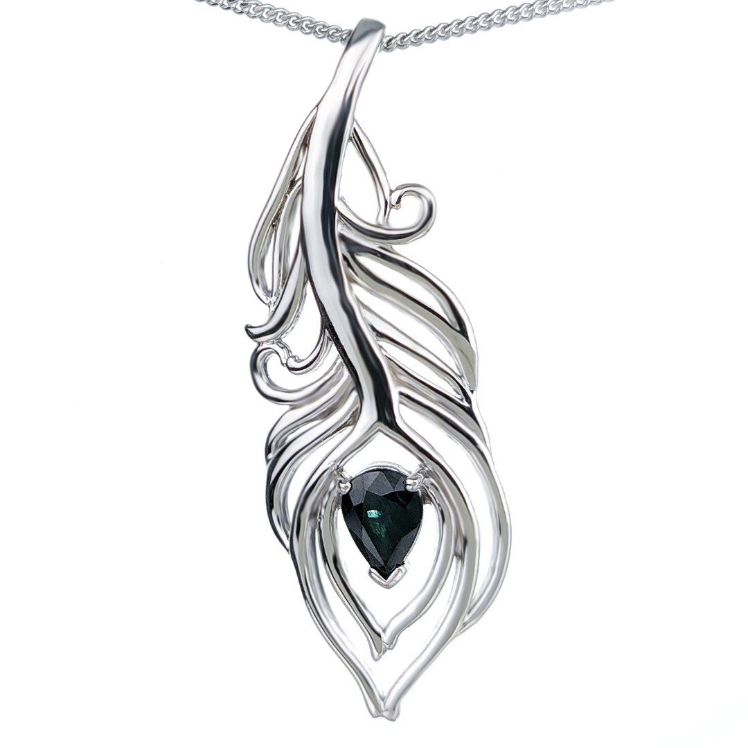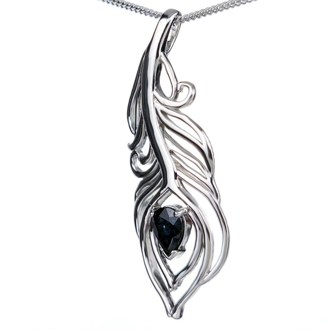 Elegant peacock feather statement pendant set with a pear shaped natural Australian inky blue sapphire. The sapphire is 7mm long by 5mm giving a total carat weight of 0.75ct.
