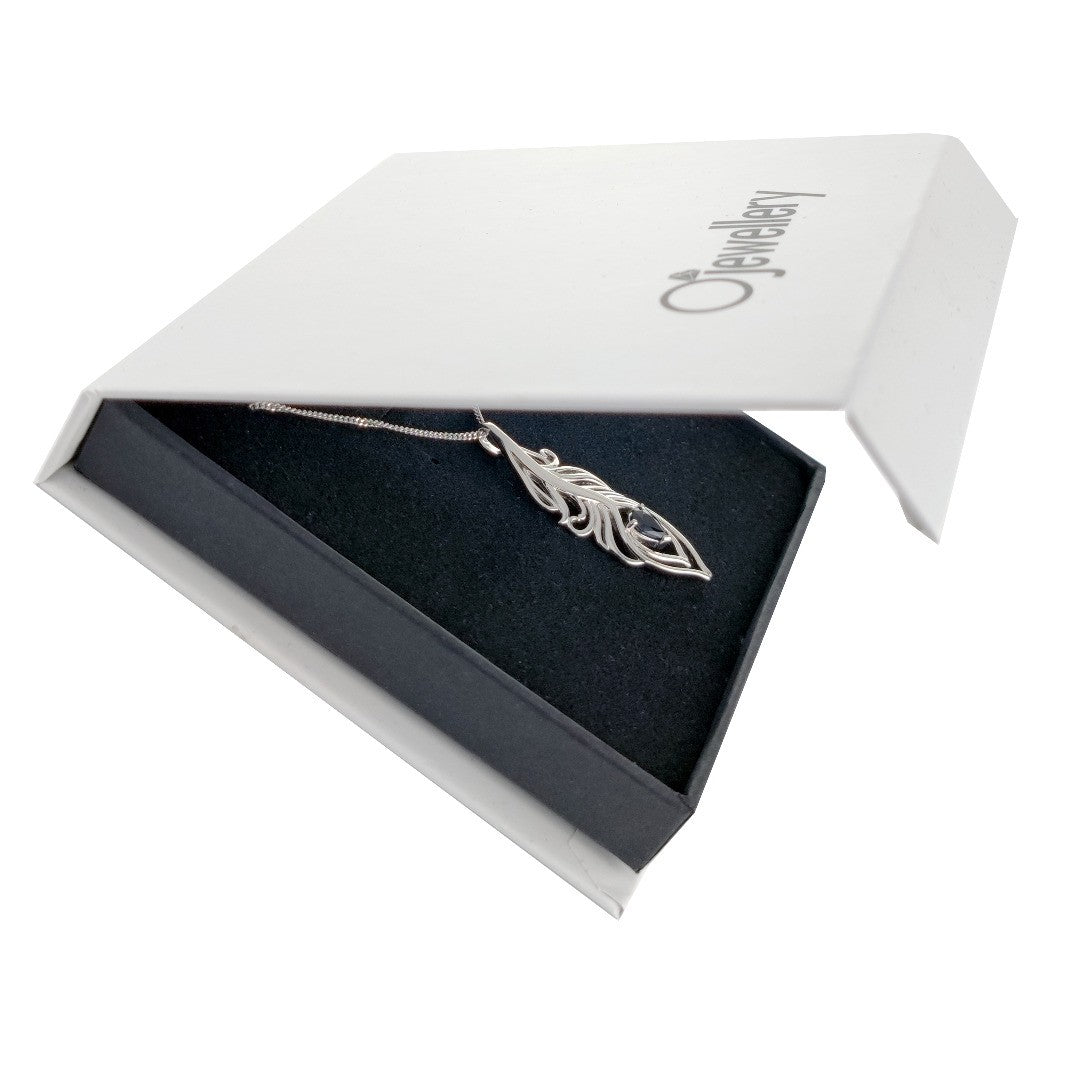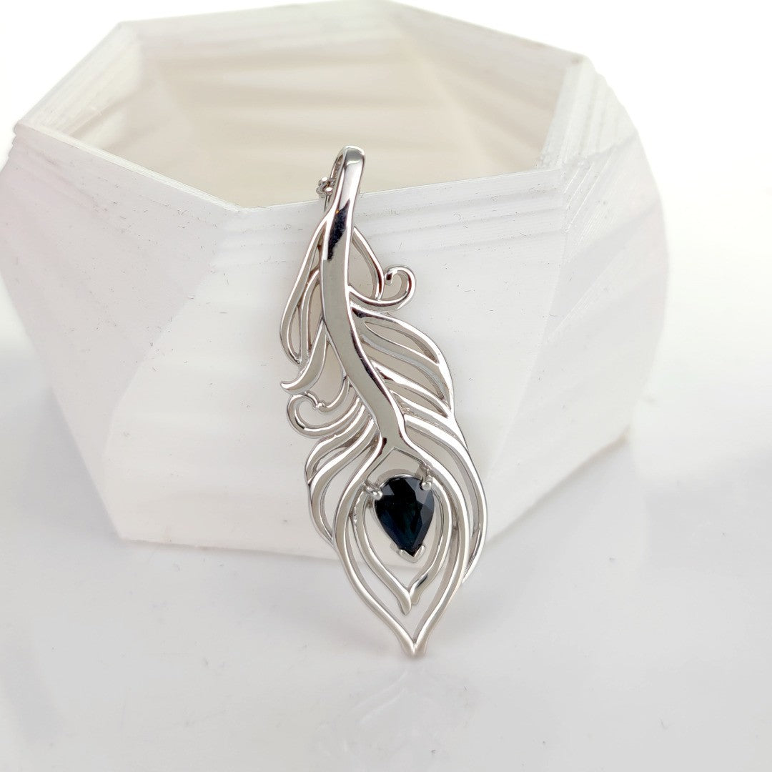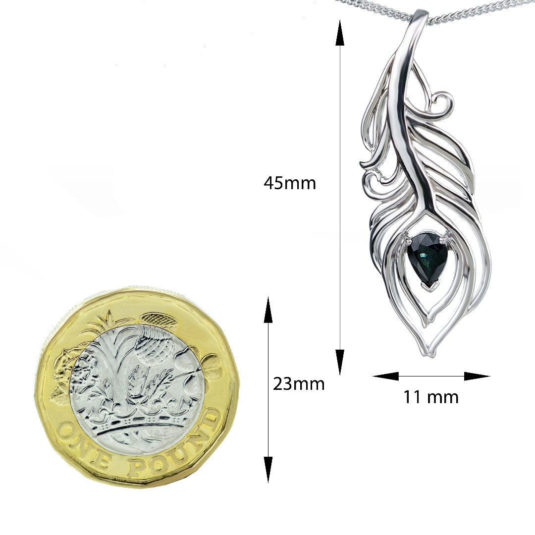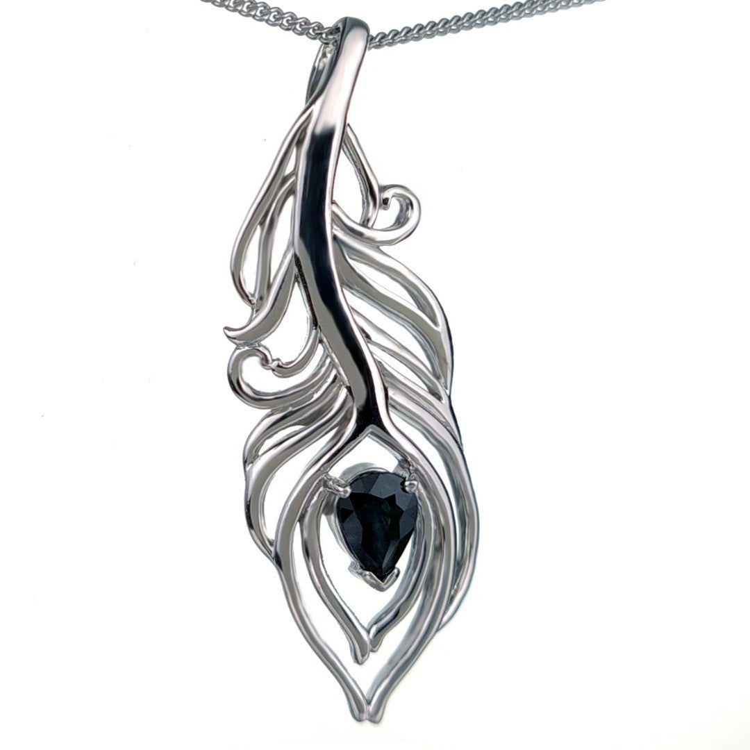 Elegant peacock feather statement pendant set with a pear shaped natural Australian inky blue sapphire. The sapphire is 7mm long by 5mm giving a total carat weight of 0.75ct.