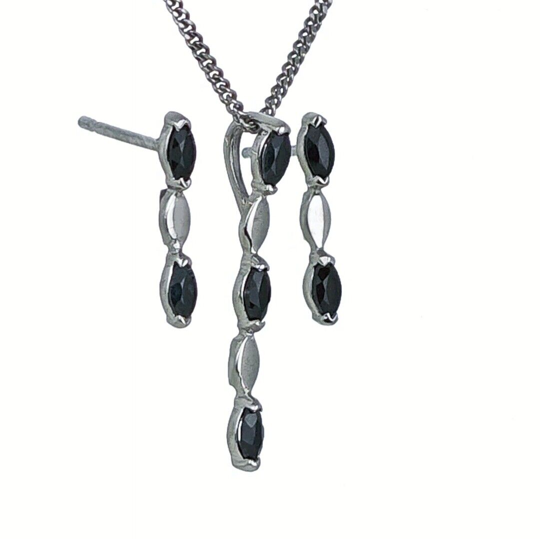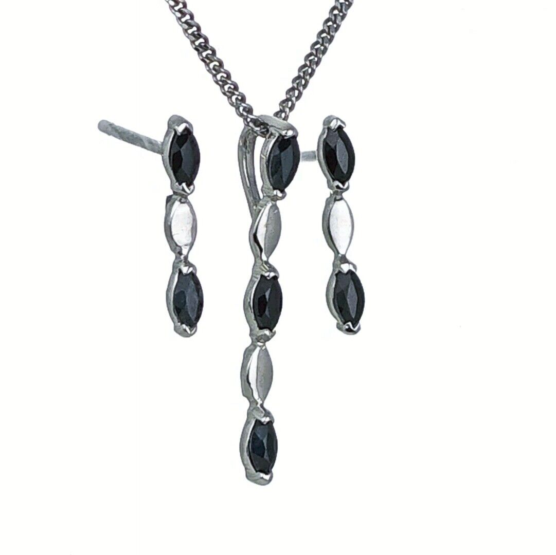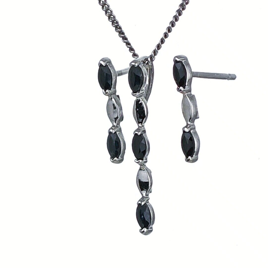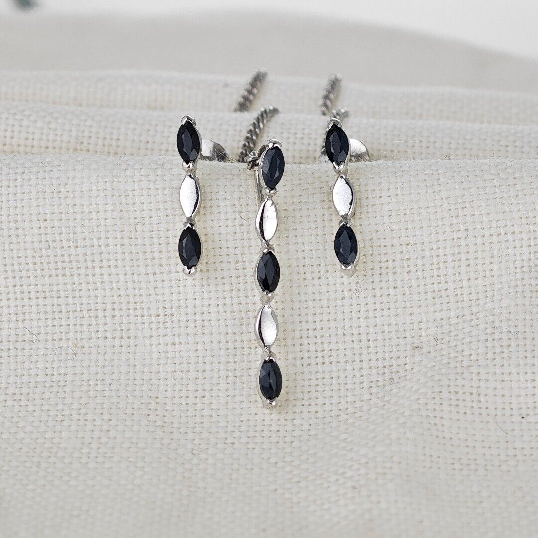 Elegant marquise cut Sapphire drop pendant and stud earrings made of sterling silver. The natural inky blue sapphires are from Australia. Each stone measures 4 x 2mm