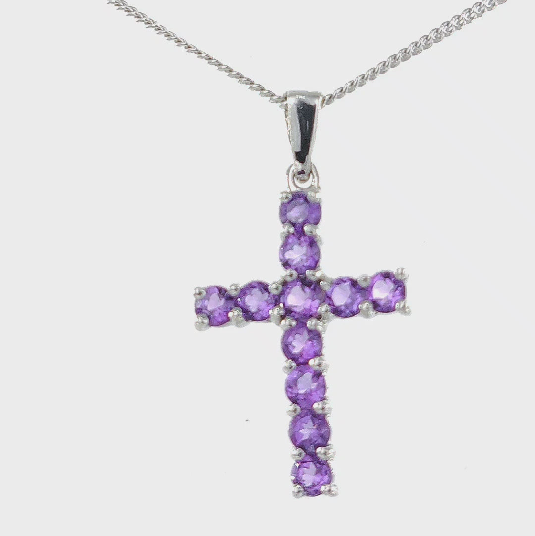Elegant rhodium plated sterling silver cross pendant set with natural African purple amethysts.