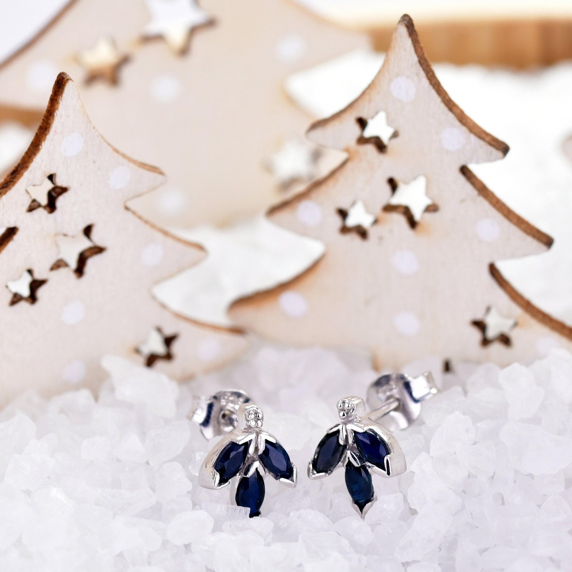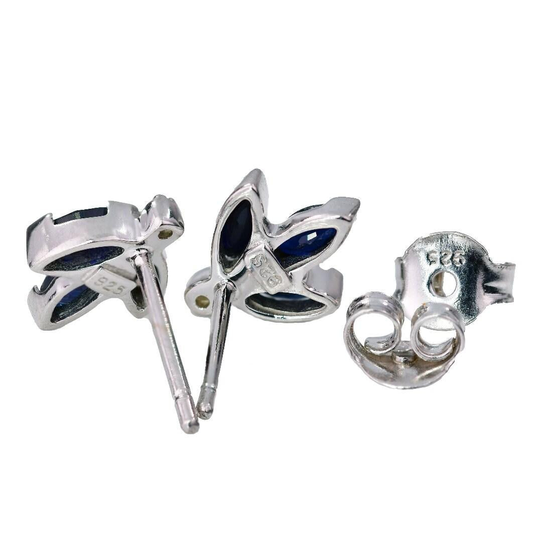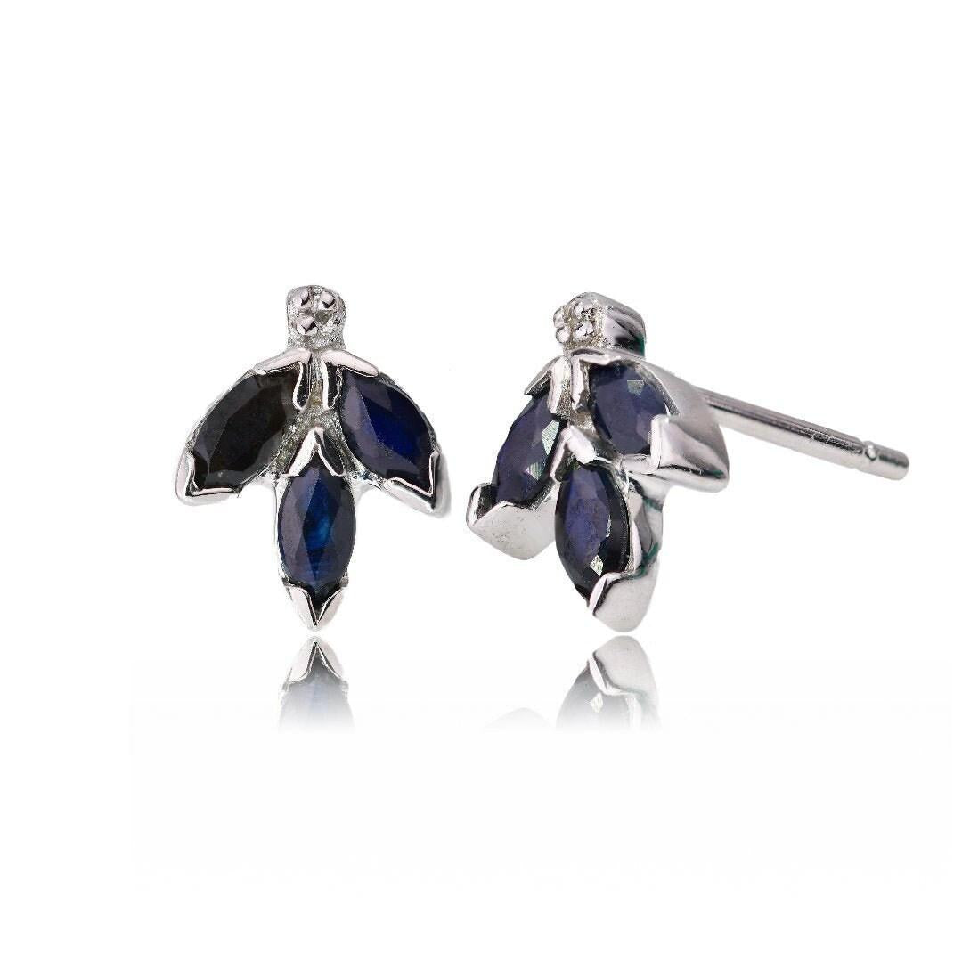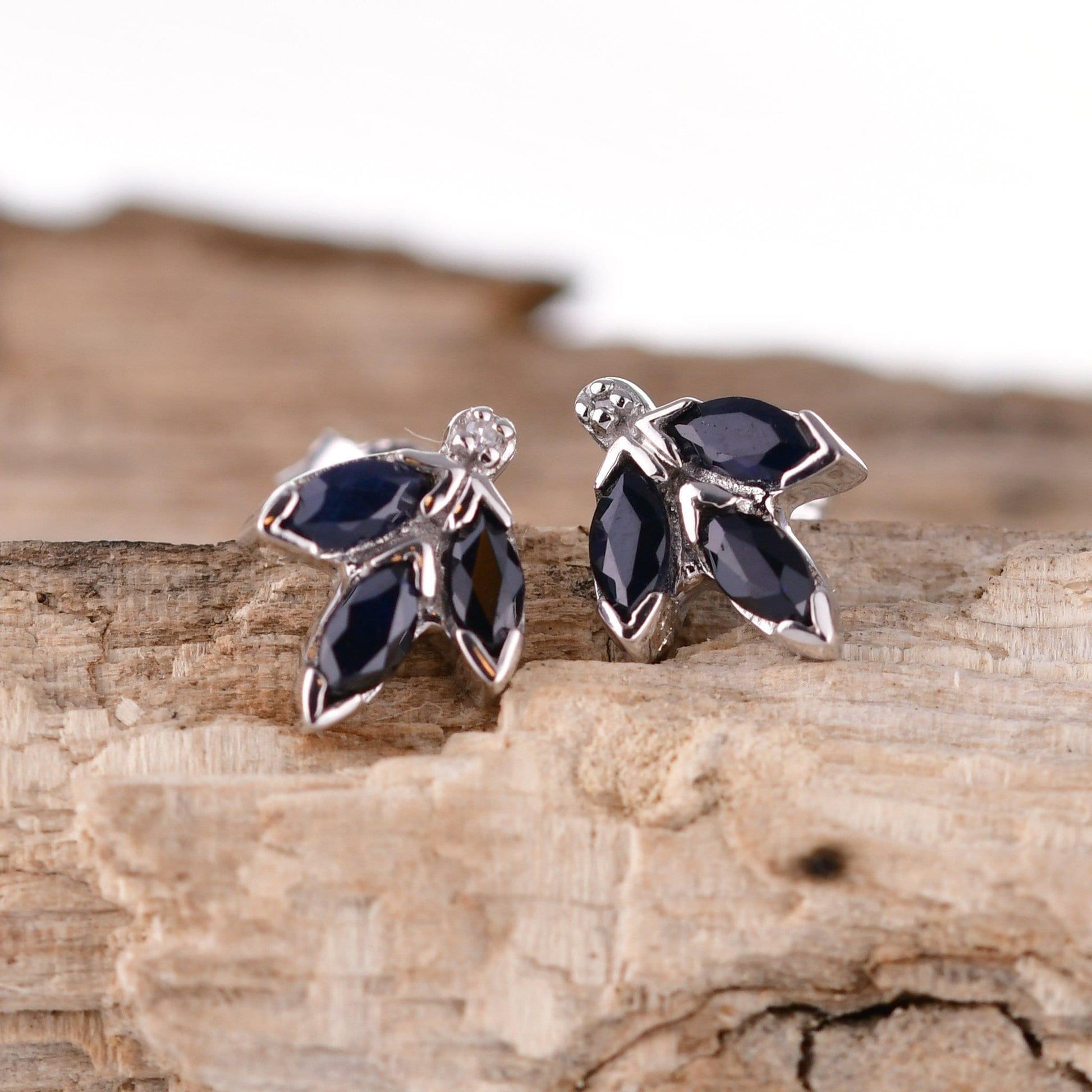 Silver Diamond Earrings Stud Sapphire Ink Blue Marquise Leaf Womens