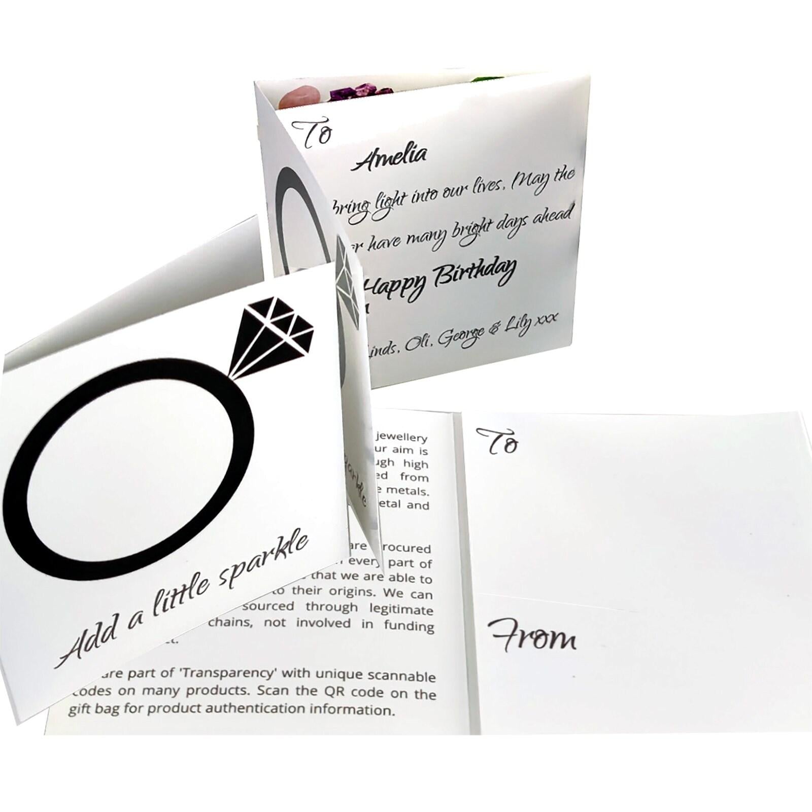 Supplied in an Ojewellery presentation box, within a ribbon handled gift bag, complete with product information authenticity card with space for a gift message and a jewellery cleaning cloth to keep your jewellery in ready to wear condition.