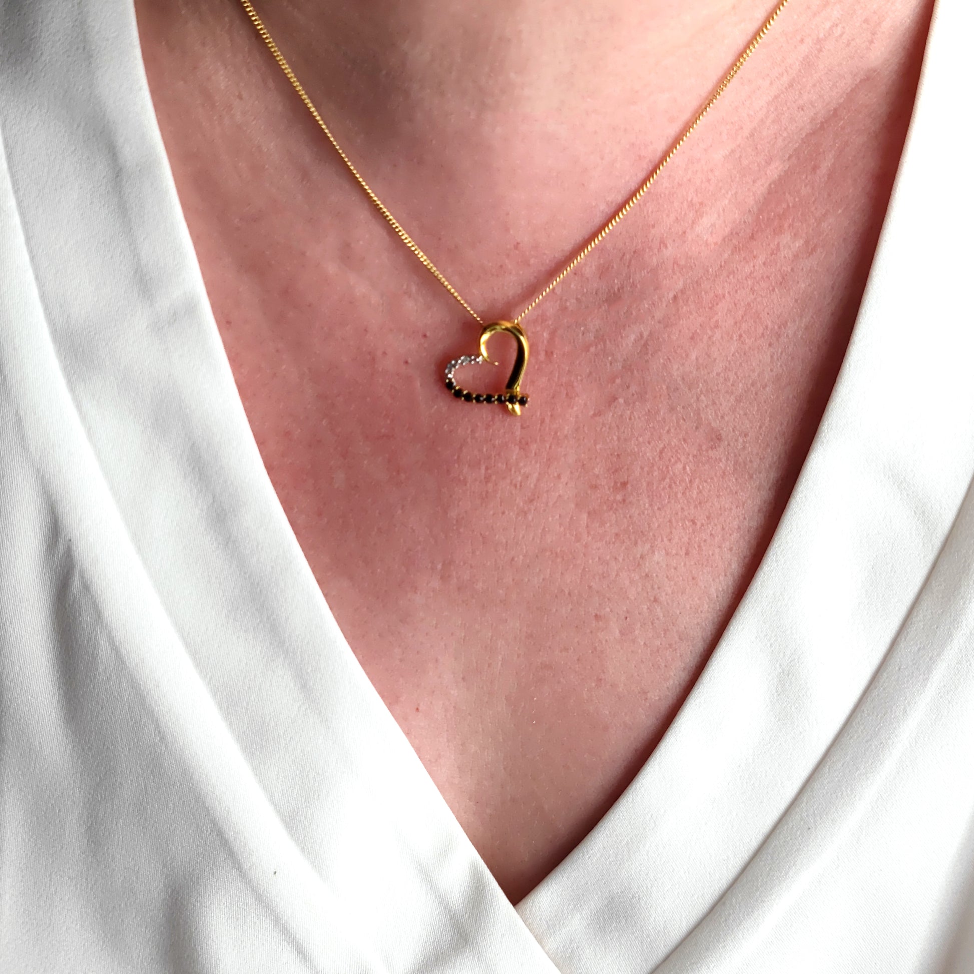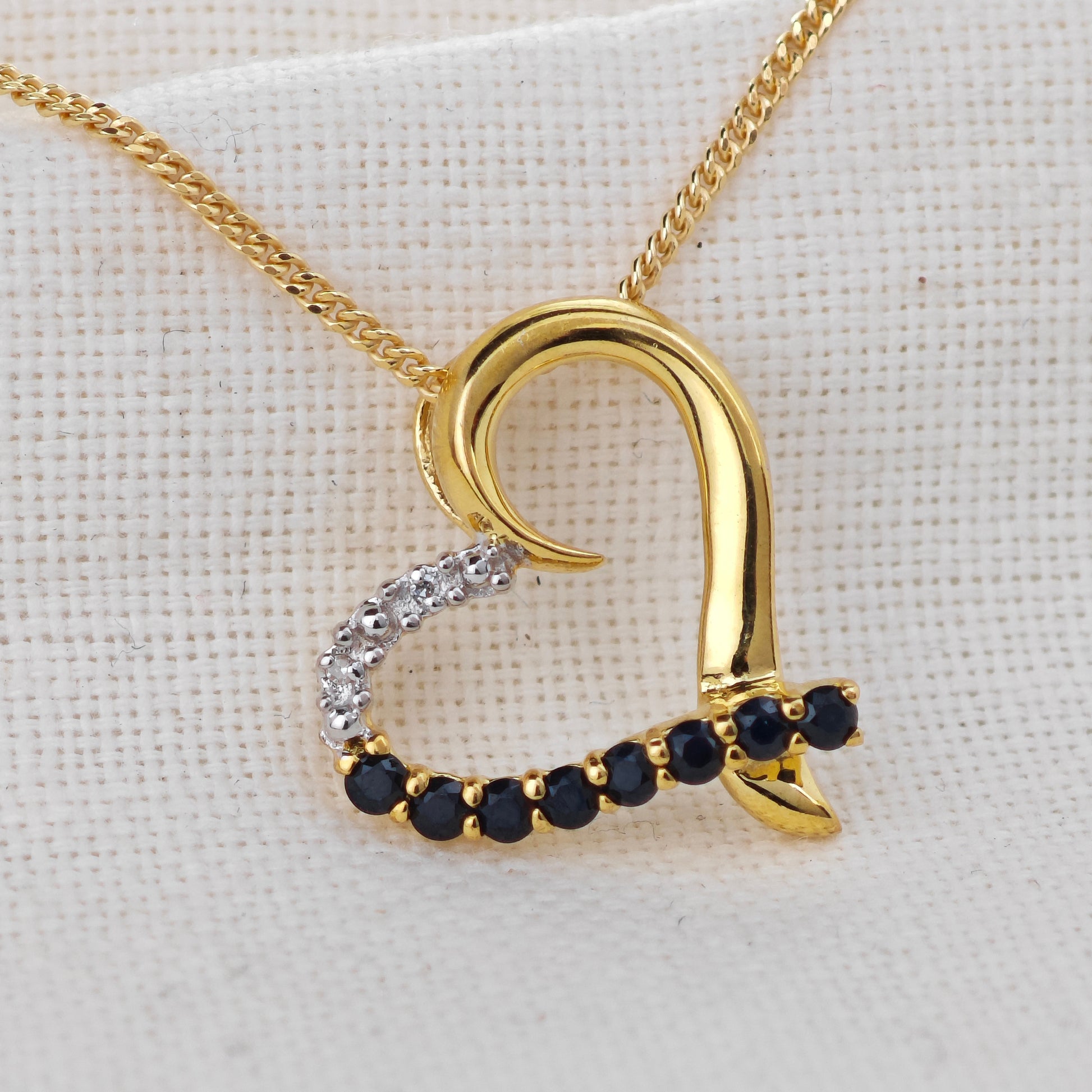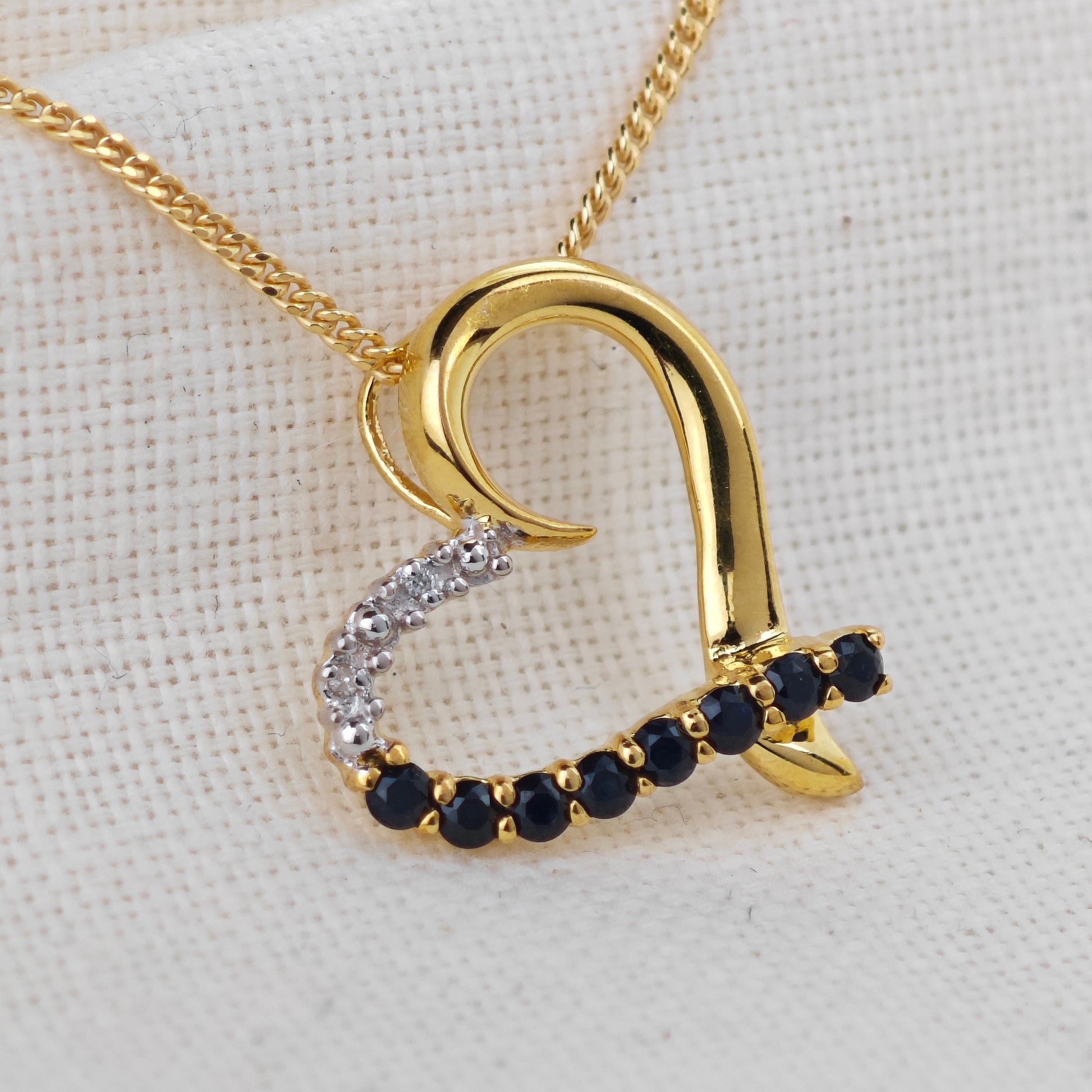 Elegant yellow gold plated sterling silver heart necklace set with sparkling natural near colourless diamonds and inky blue sapphires. The diamonds are illusion set. They are surrounded by silver to reflect the light reflection within the diamond as the wearer moves giving the illusion of larger diamonds.