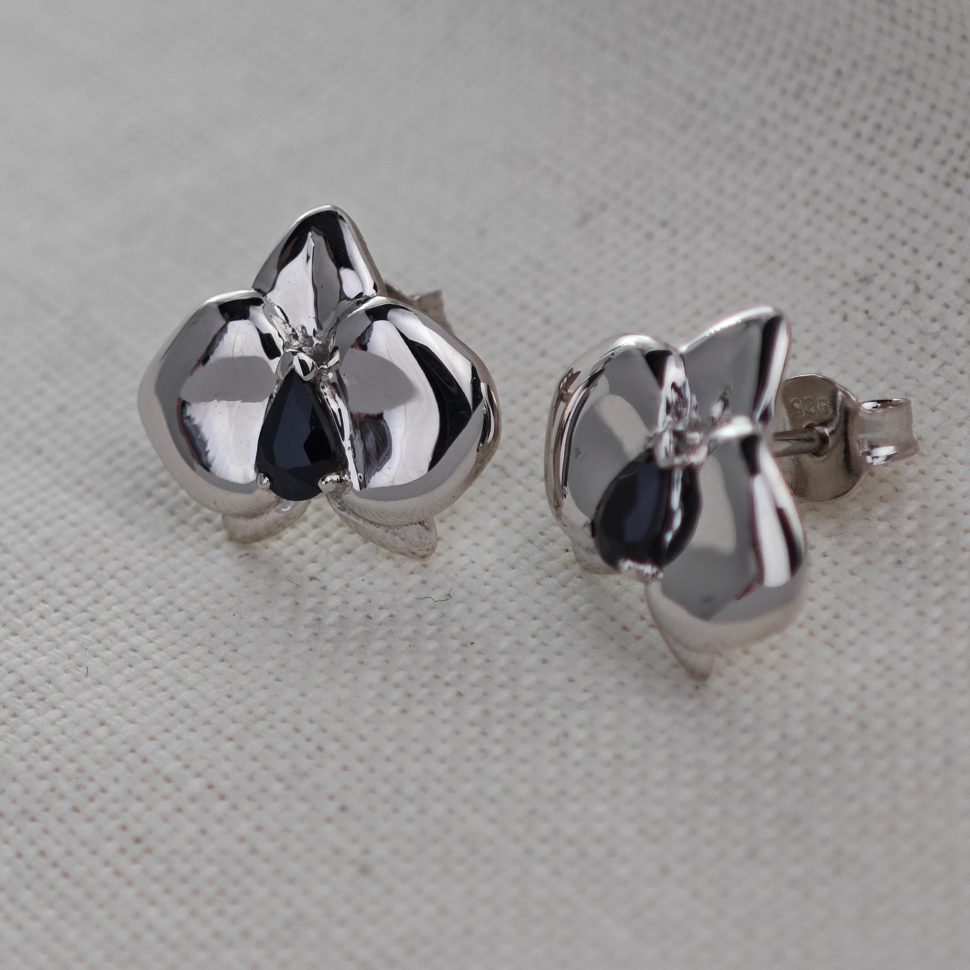 The design of these encapsulates the elegance through a graceful outline of the orchid set with a central set stone representing the inner petals and orchid colour. The stone is secured by two prongs at the base - the stamen and a hood representing the curved inner petal. The gently sculpted highly polished petals are curved slightly to reflect the sparkle of the natural stone.