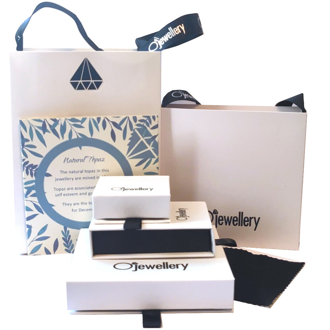 Supplied in an Ojewellery presentation box, within a ribbon handled gift bag, complete with product information authenticity card with space for a gift message and a jewellery cleaning cloth to keep your jewellery in ready to wear condition.