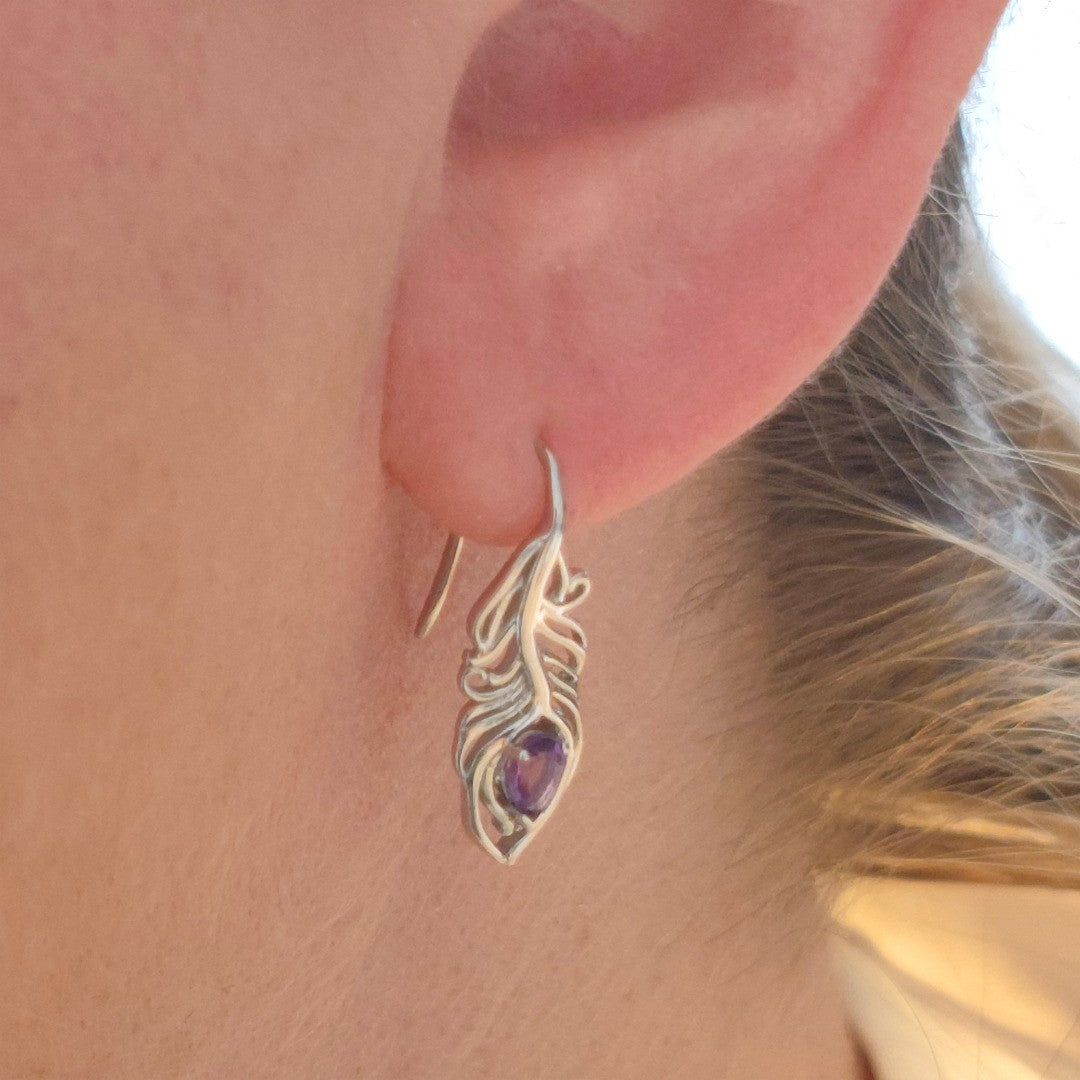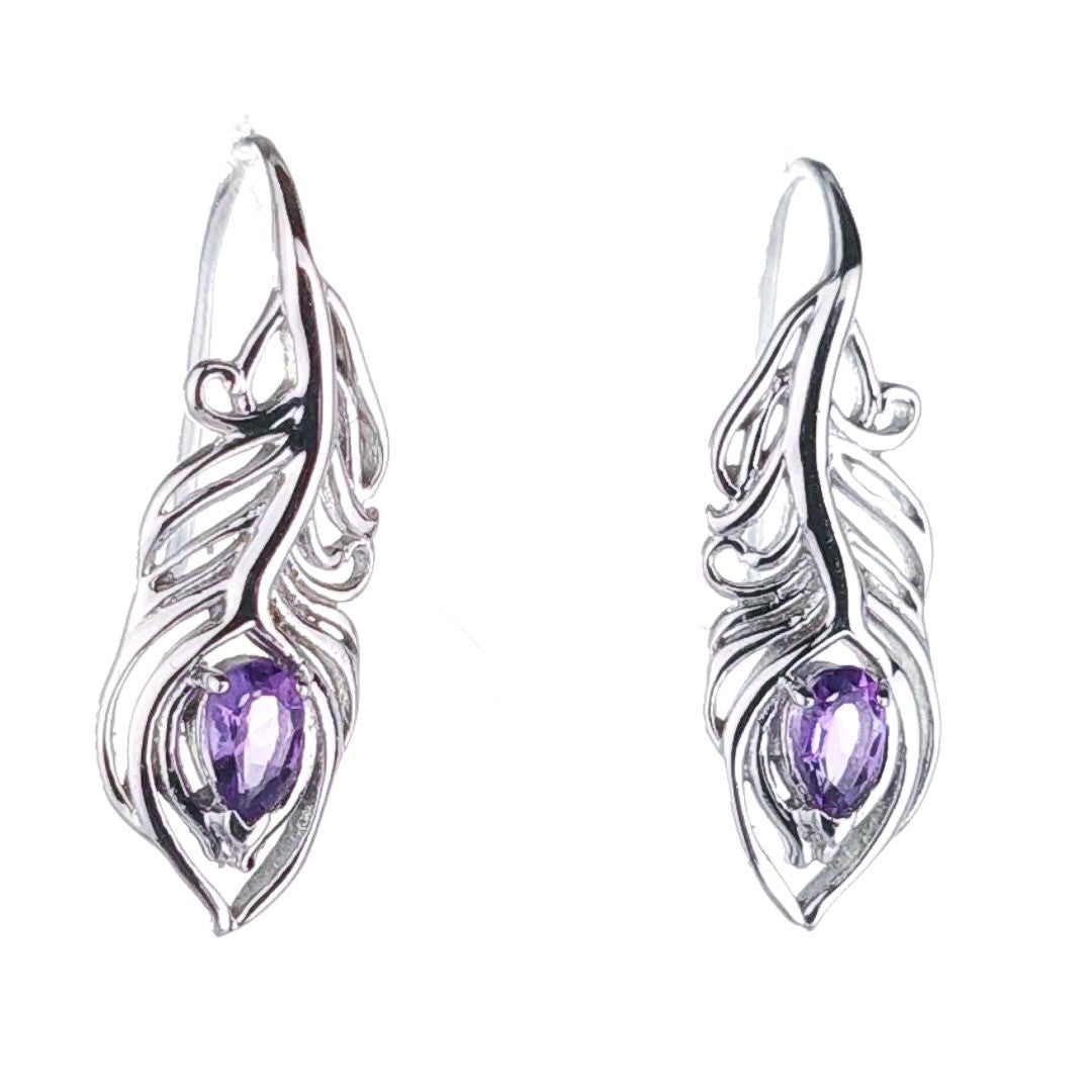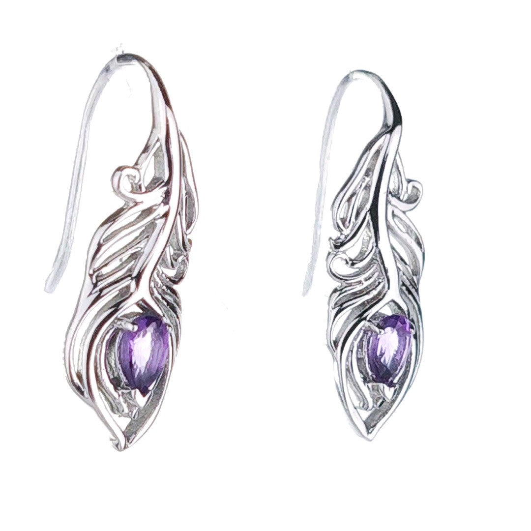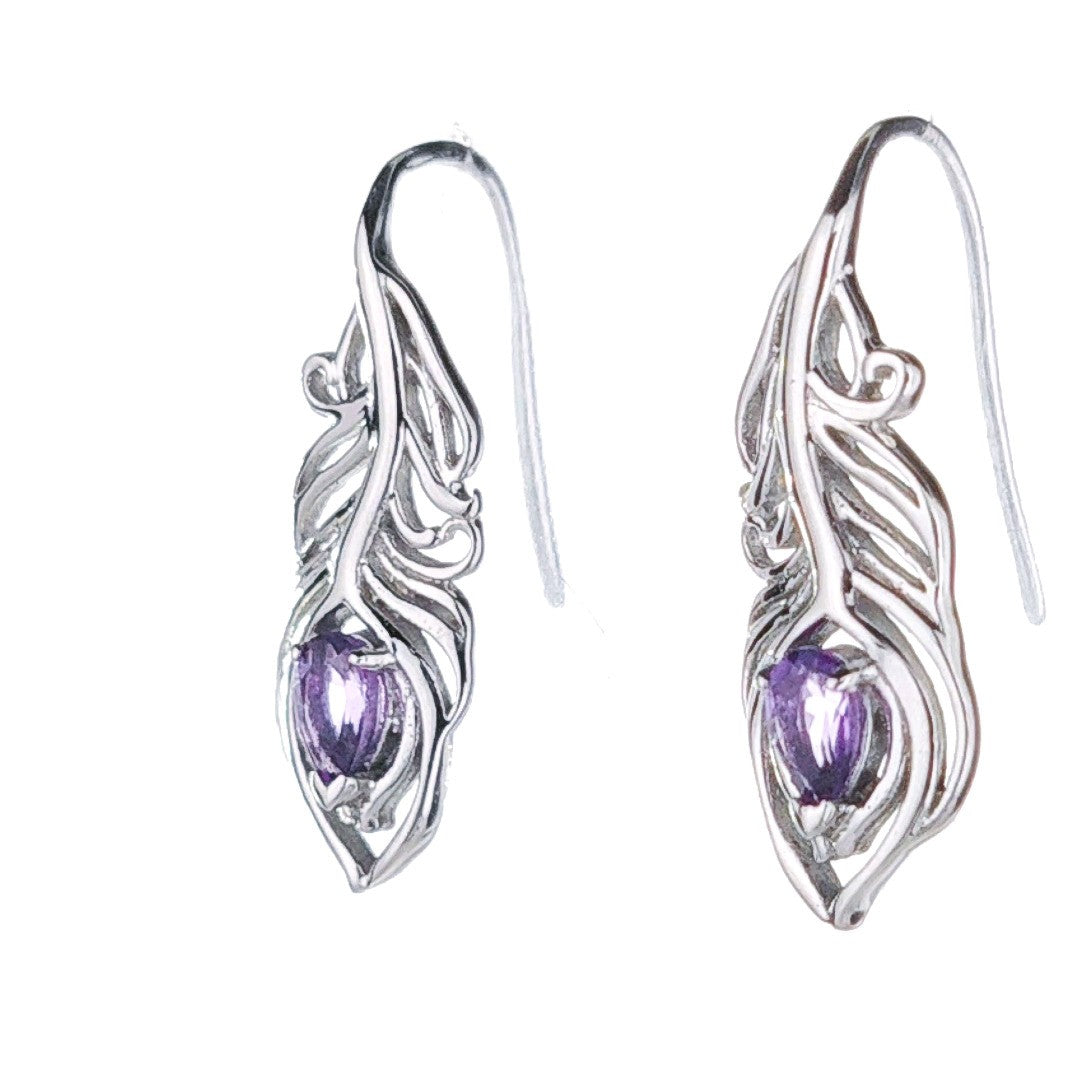 Amethyst Peacock Feather Dangle Earrings Sterling Silver
