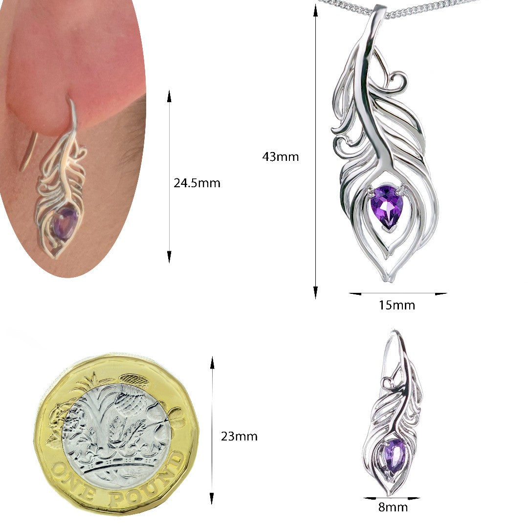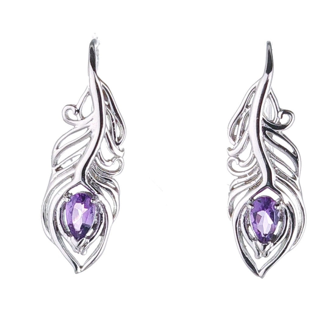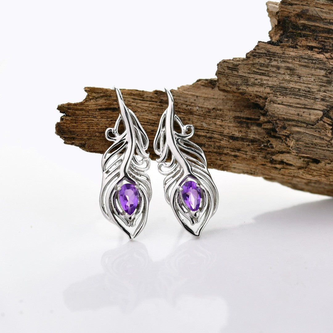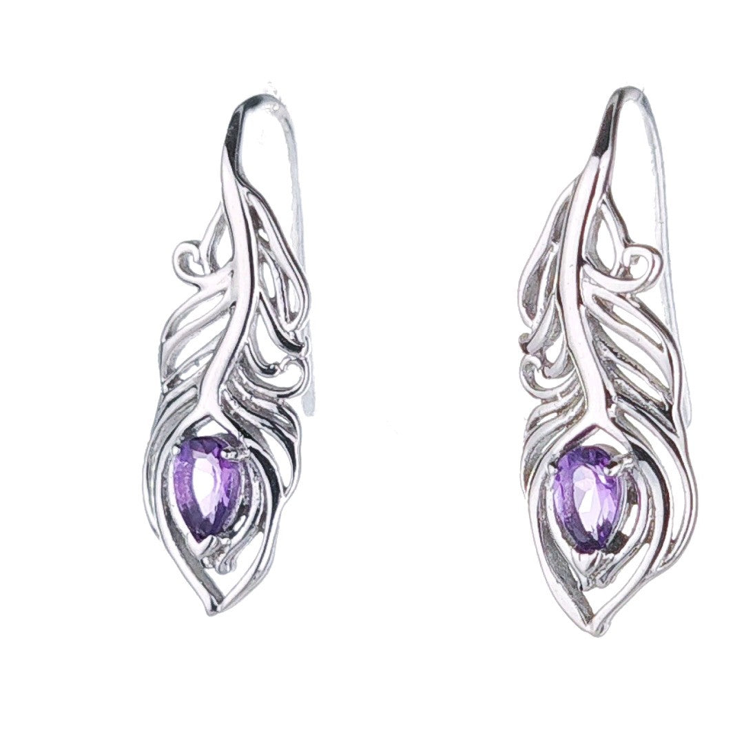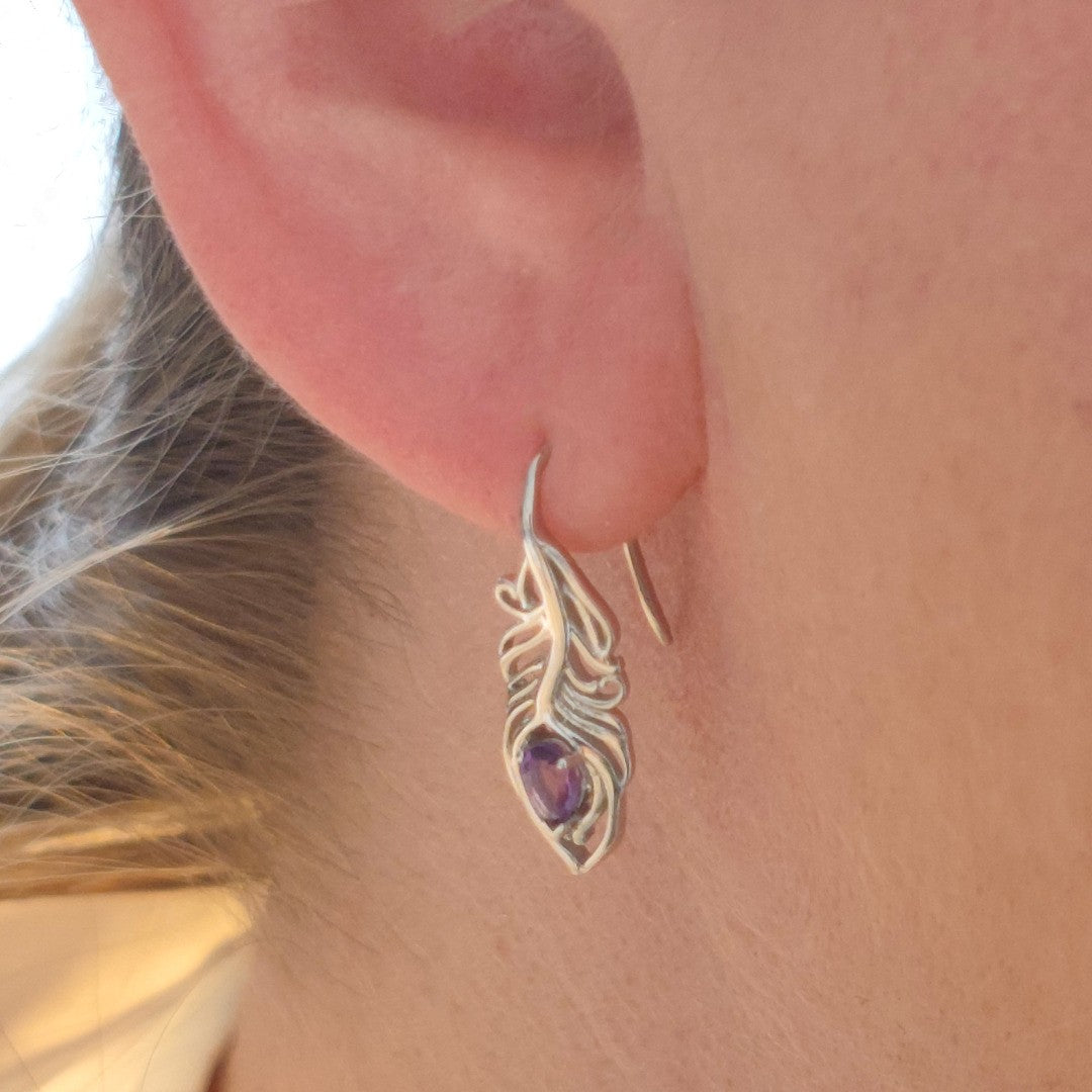 Amethyst Peacock Feather Dangle Earrings Sterling Silver