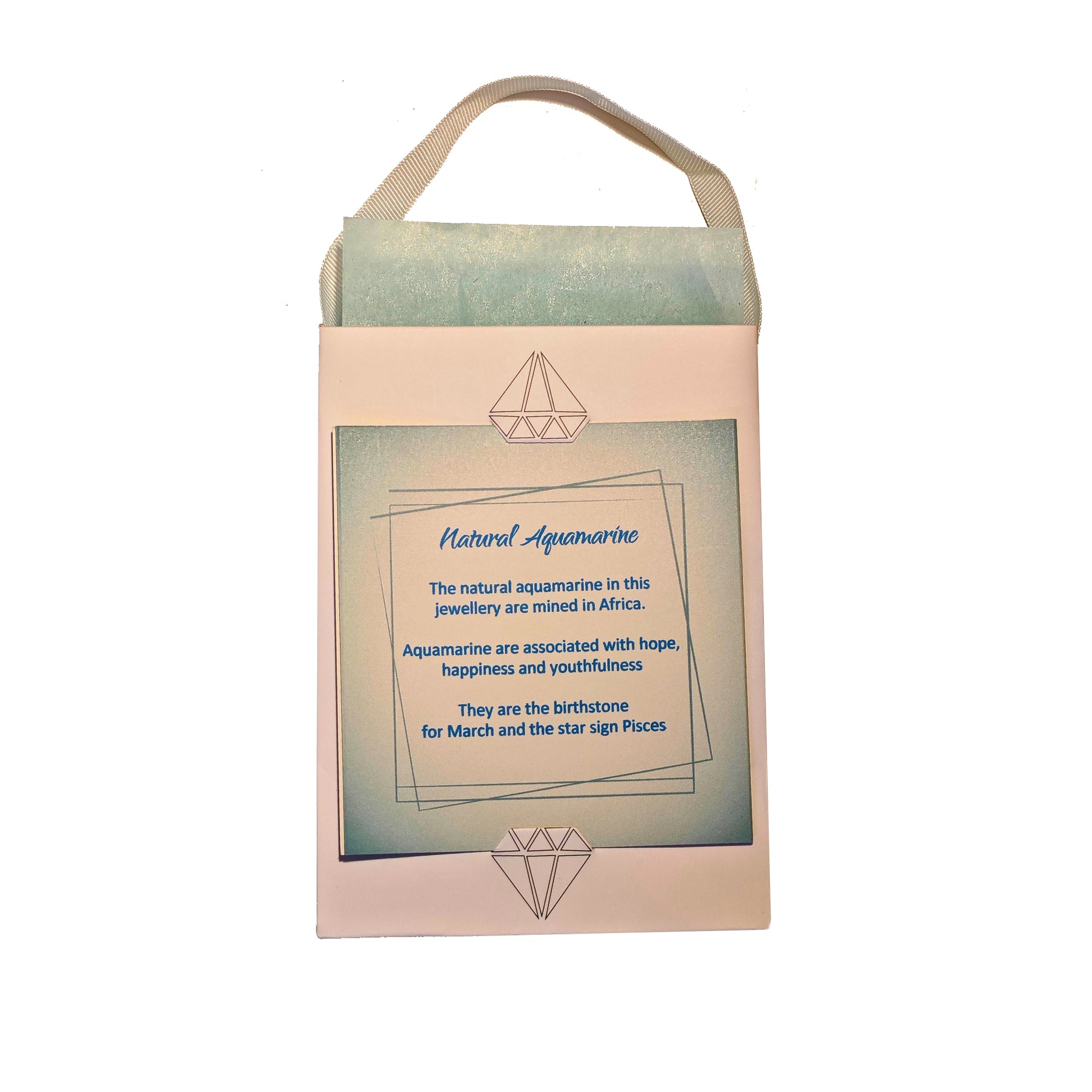 The natural aquamarine in this jewellery are mined in Mozambique.