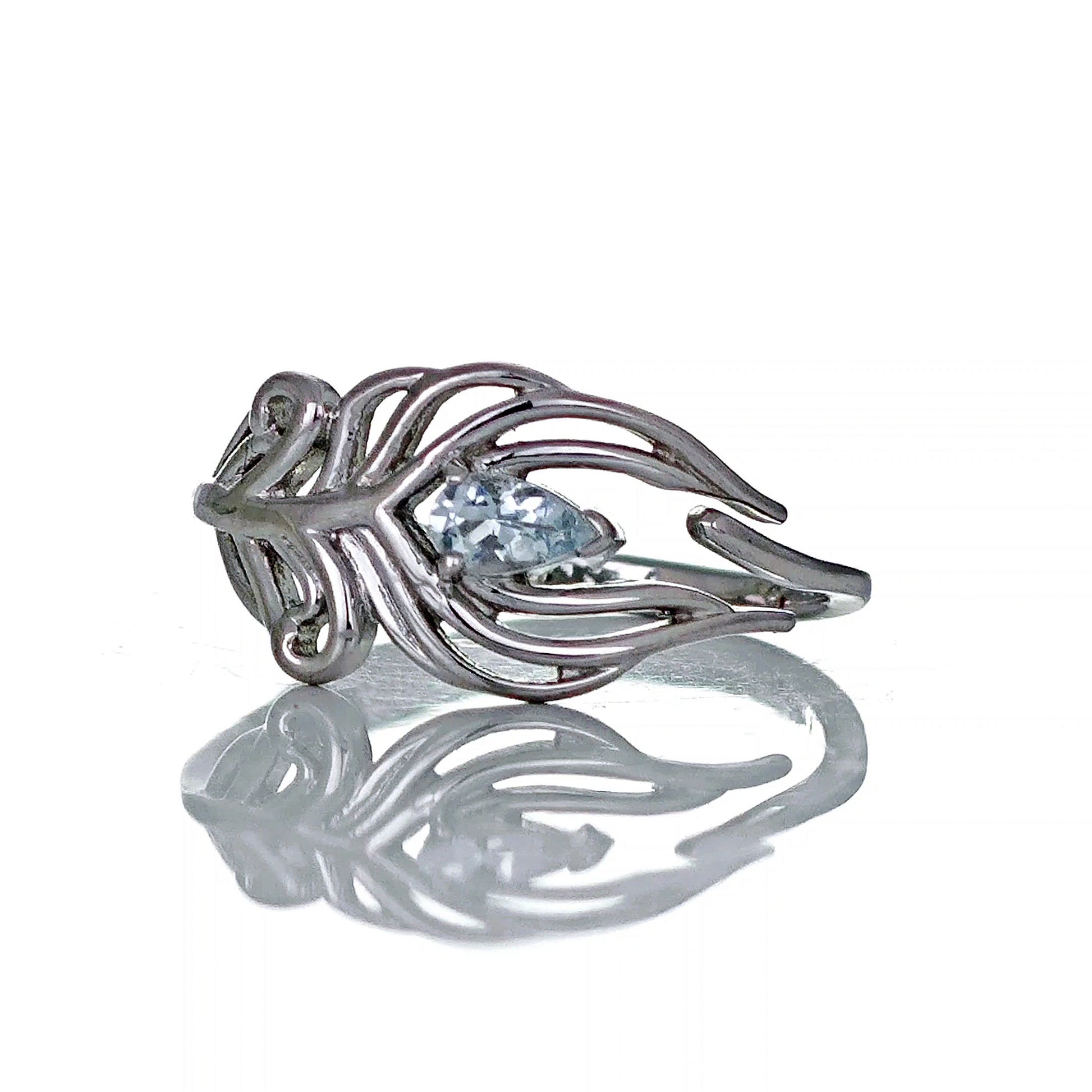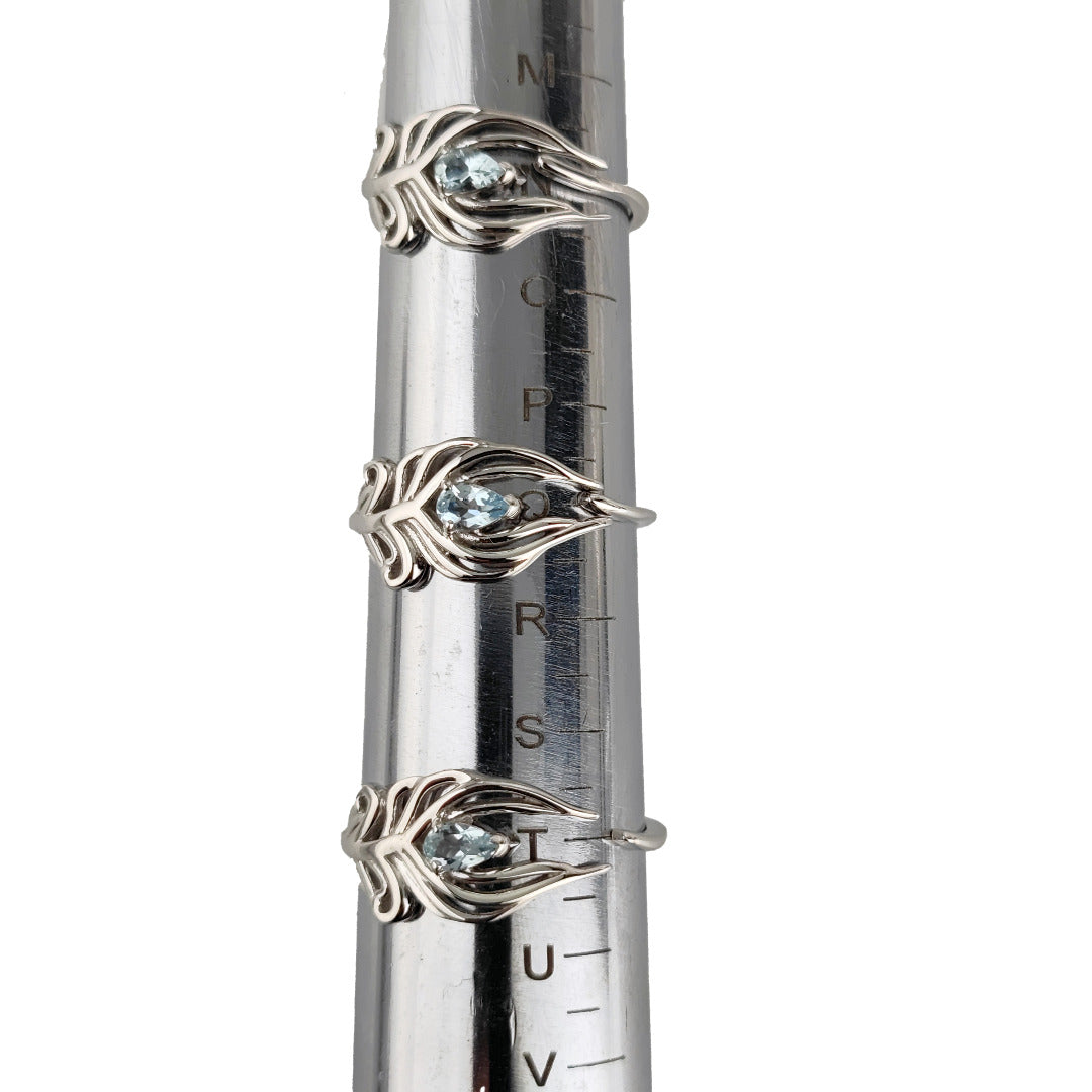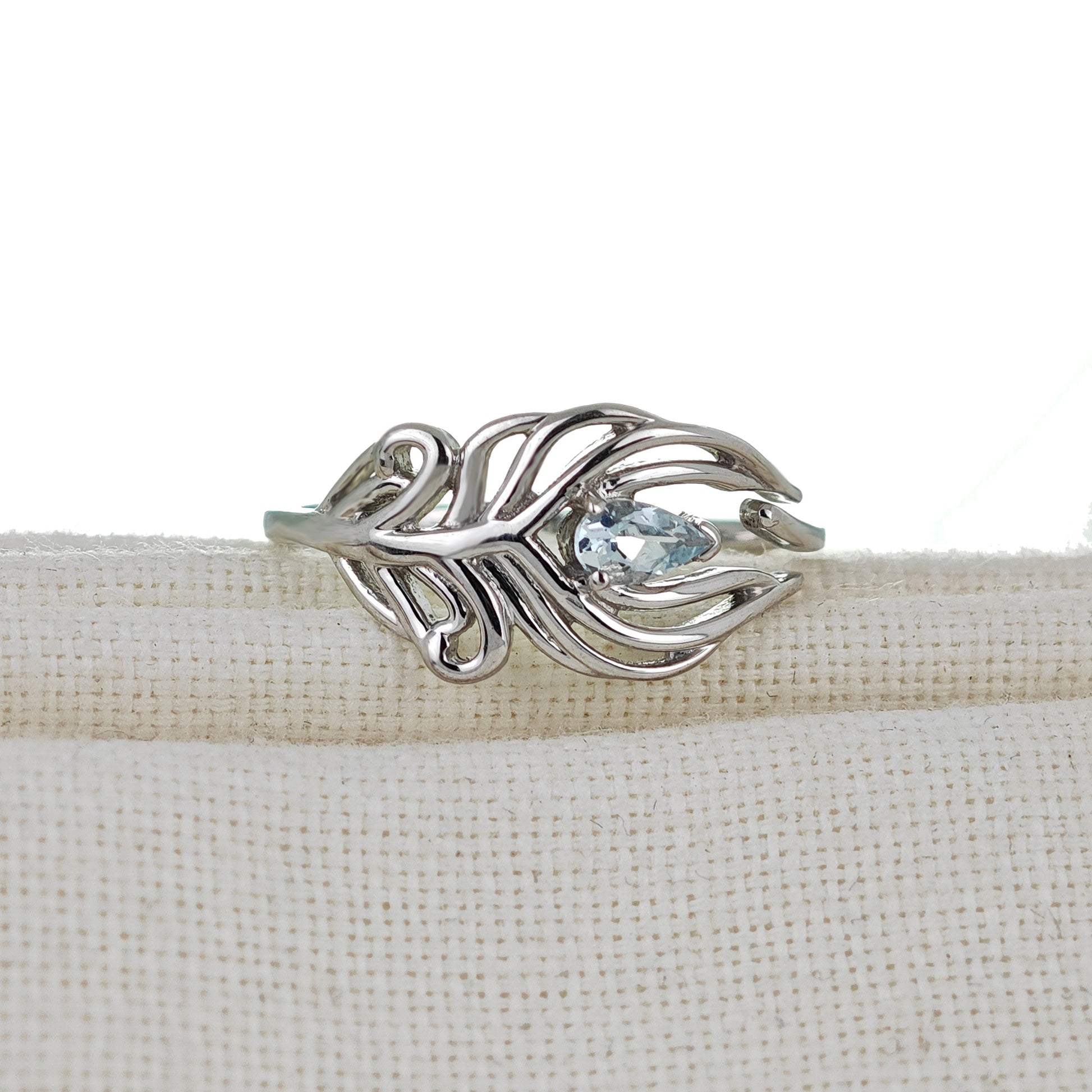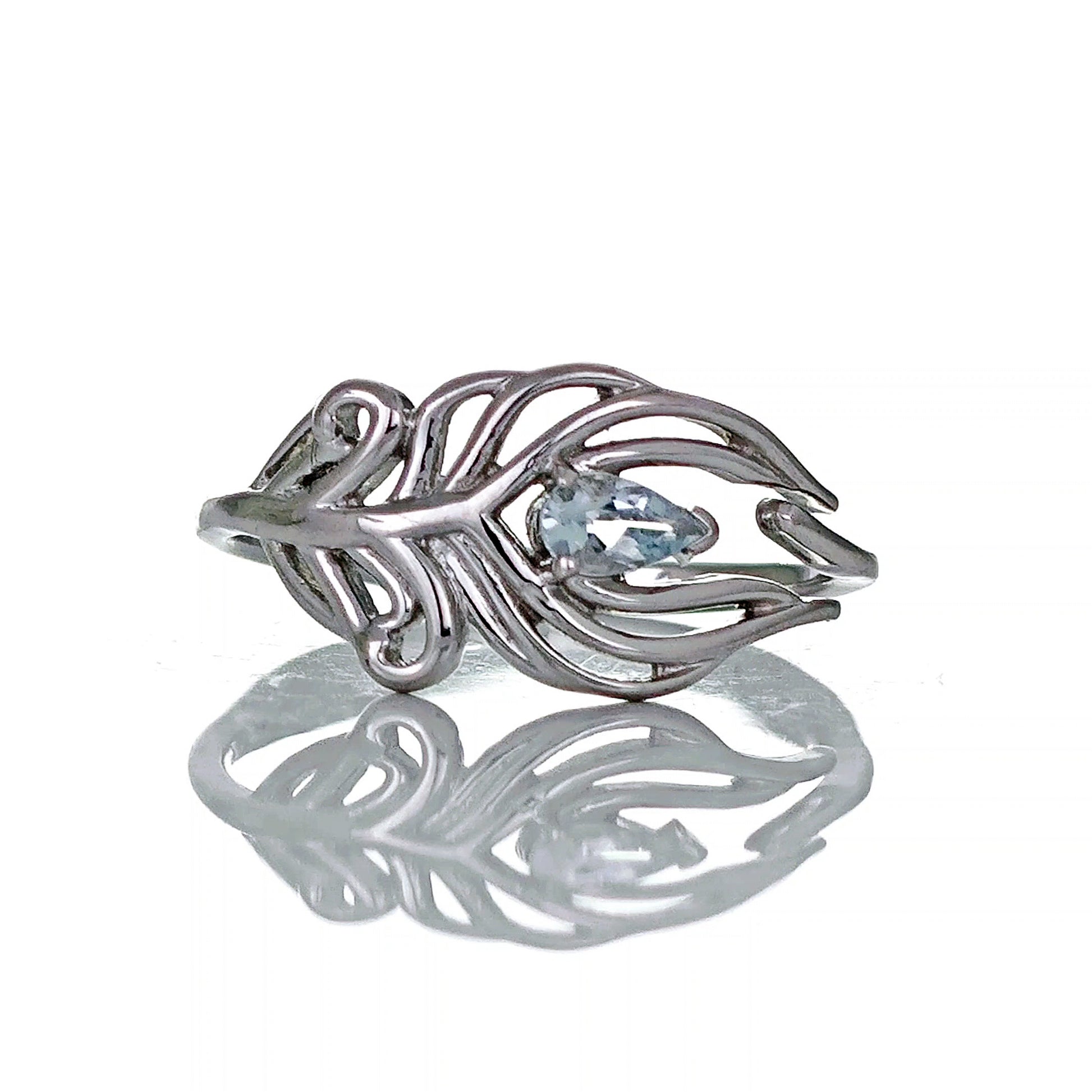 Sterling Silver Statement Aquamarine Ring Peacock Feather design with an eye set with a natural Mozambique blue pear Aquamarine.