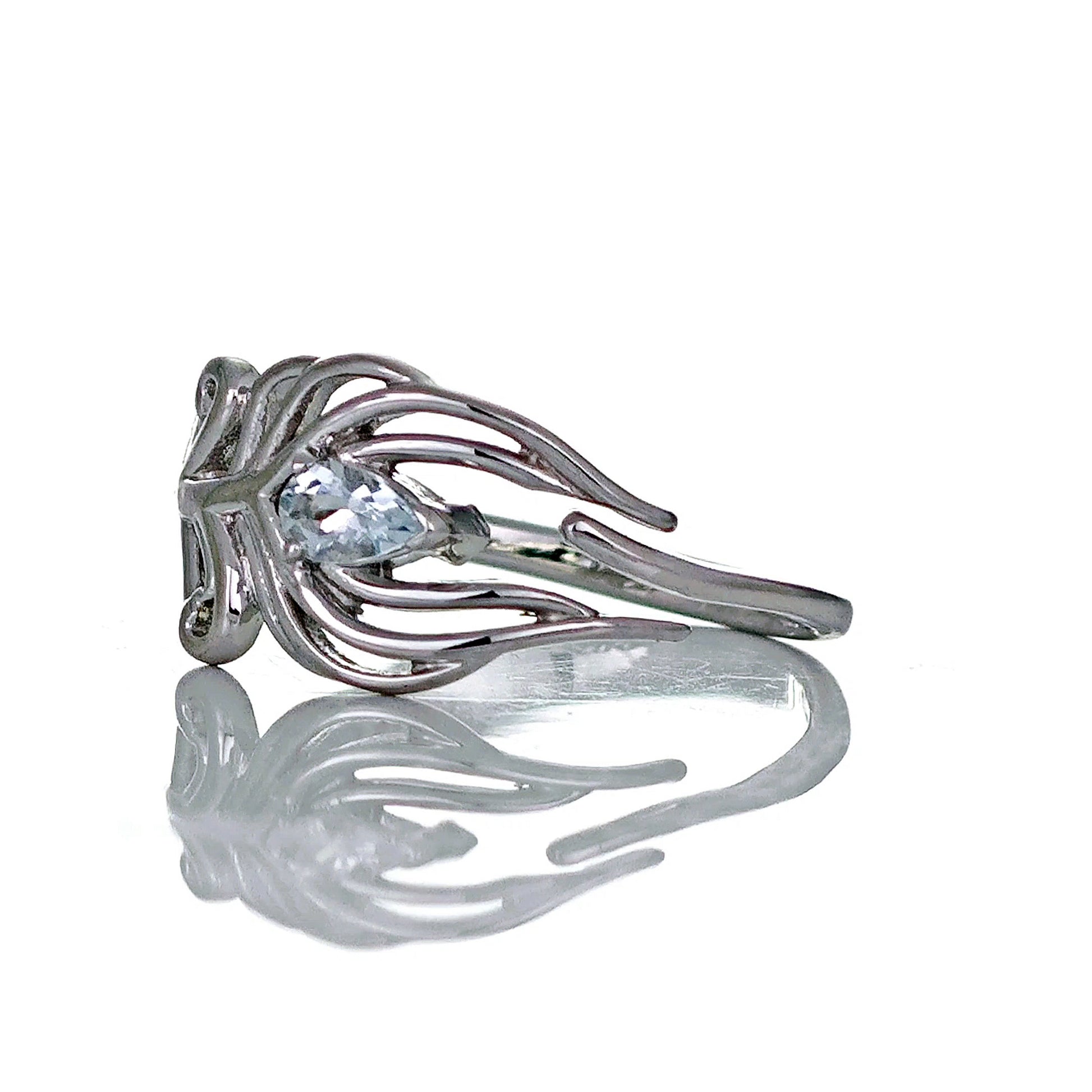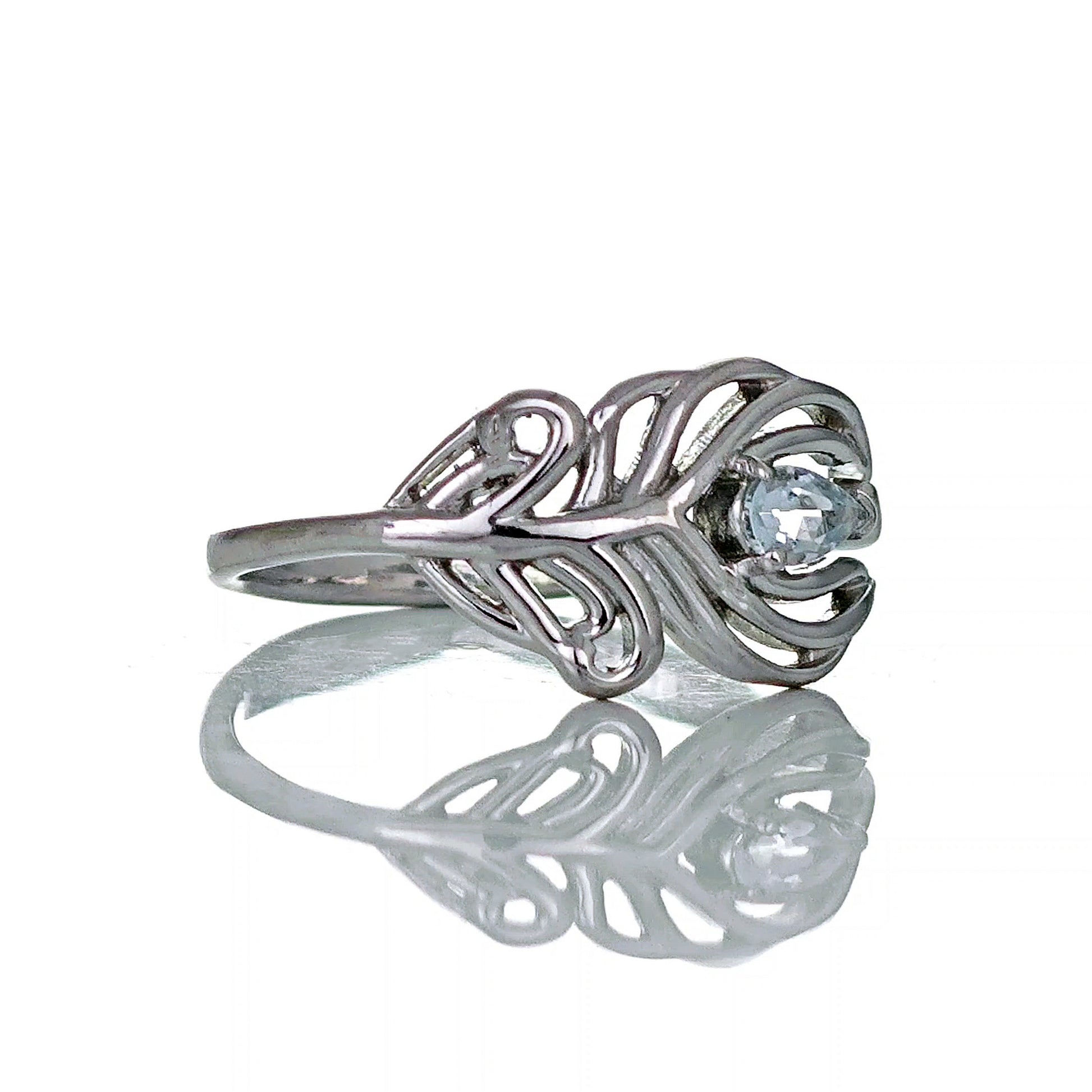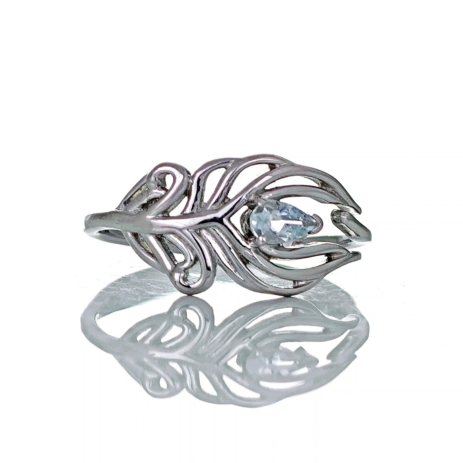 Sterling Silver Statement Aquamarine Ring Peacock Feather design with an eye set with a natural Mozambique blue pear Aquamarine.