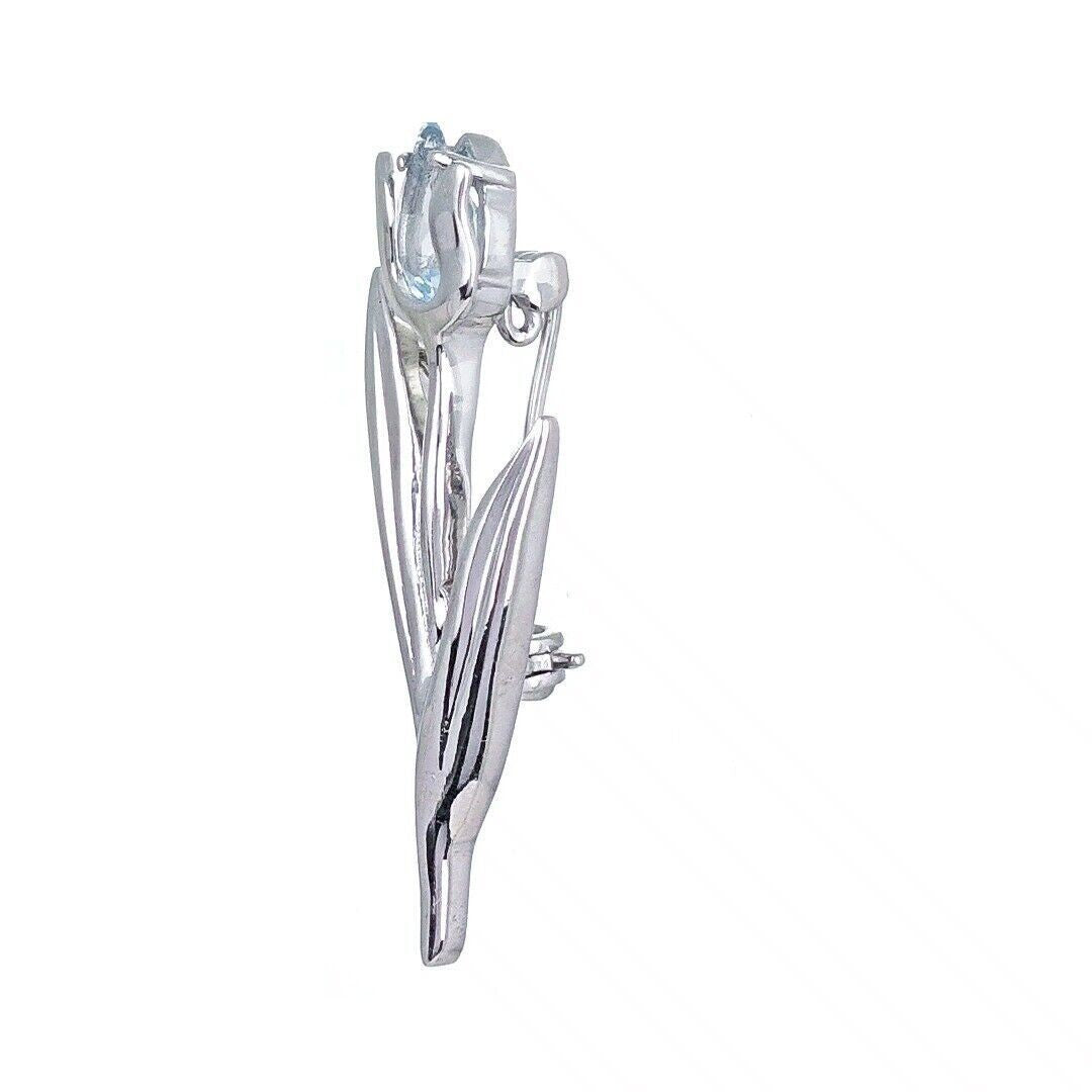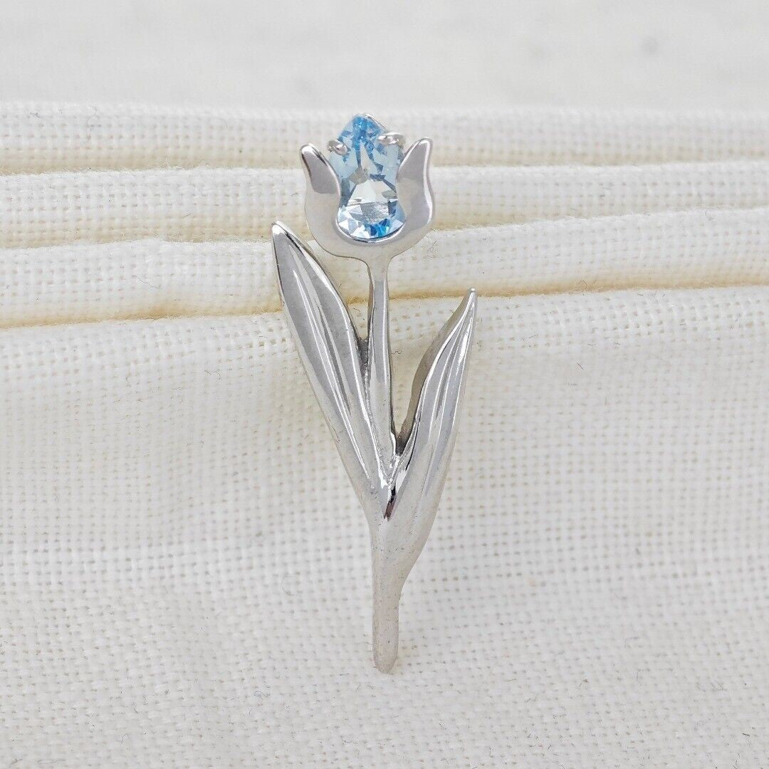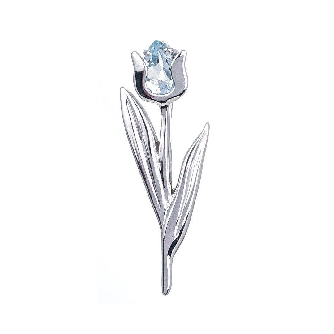 This elegant tulip flower brooch is set with a sparkling blue topaz gemstone. The natural gemstone is from Africa and measures 7 x 5mm, giving the set an approximate 0.76ct stone weight.