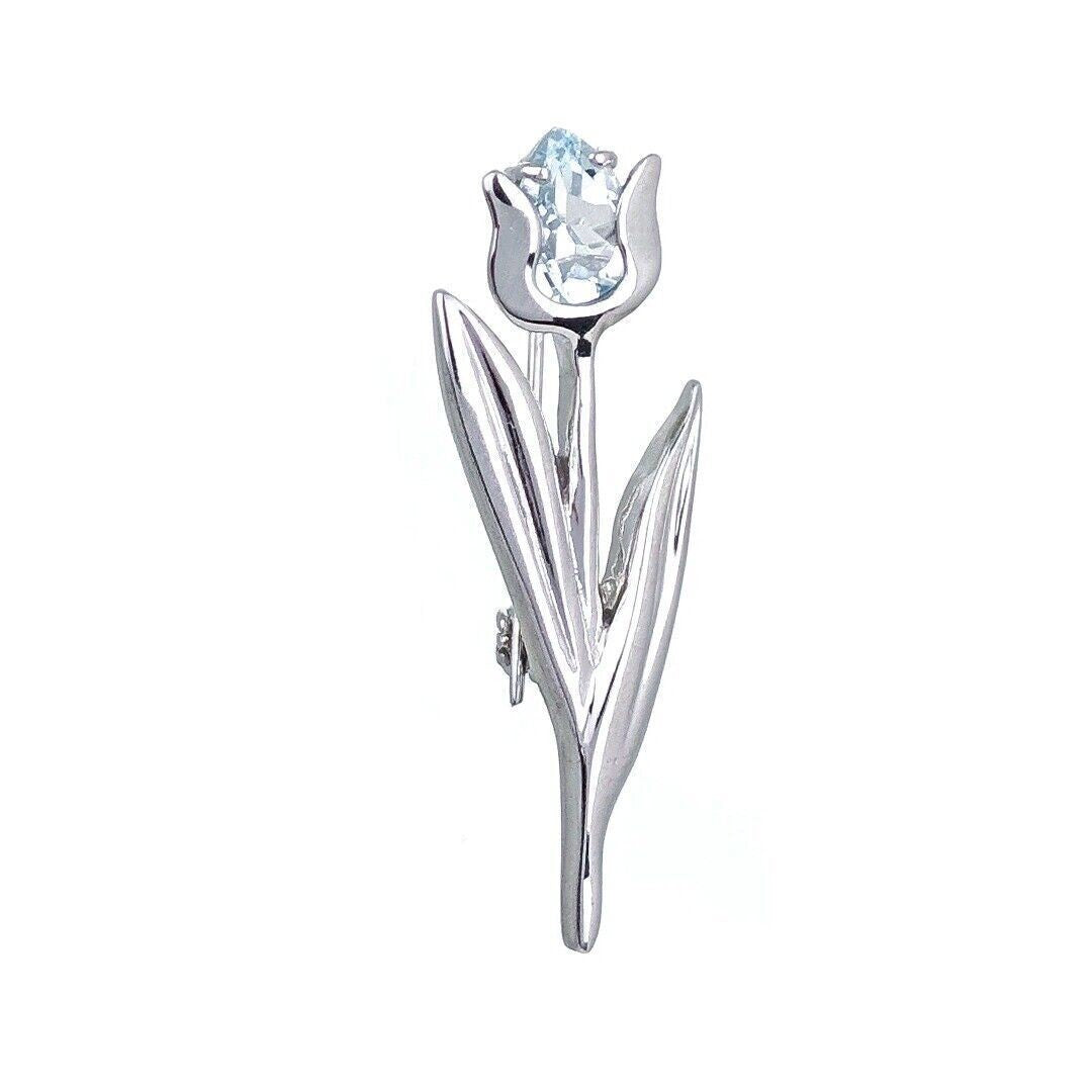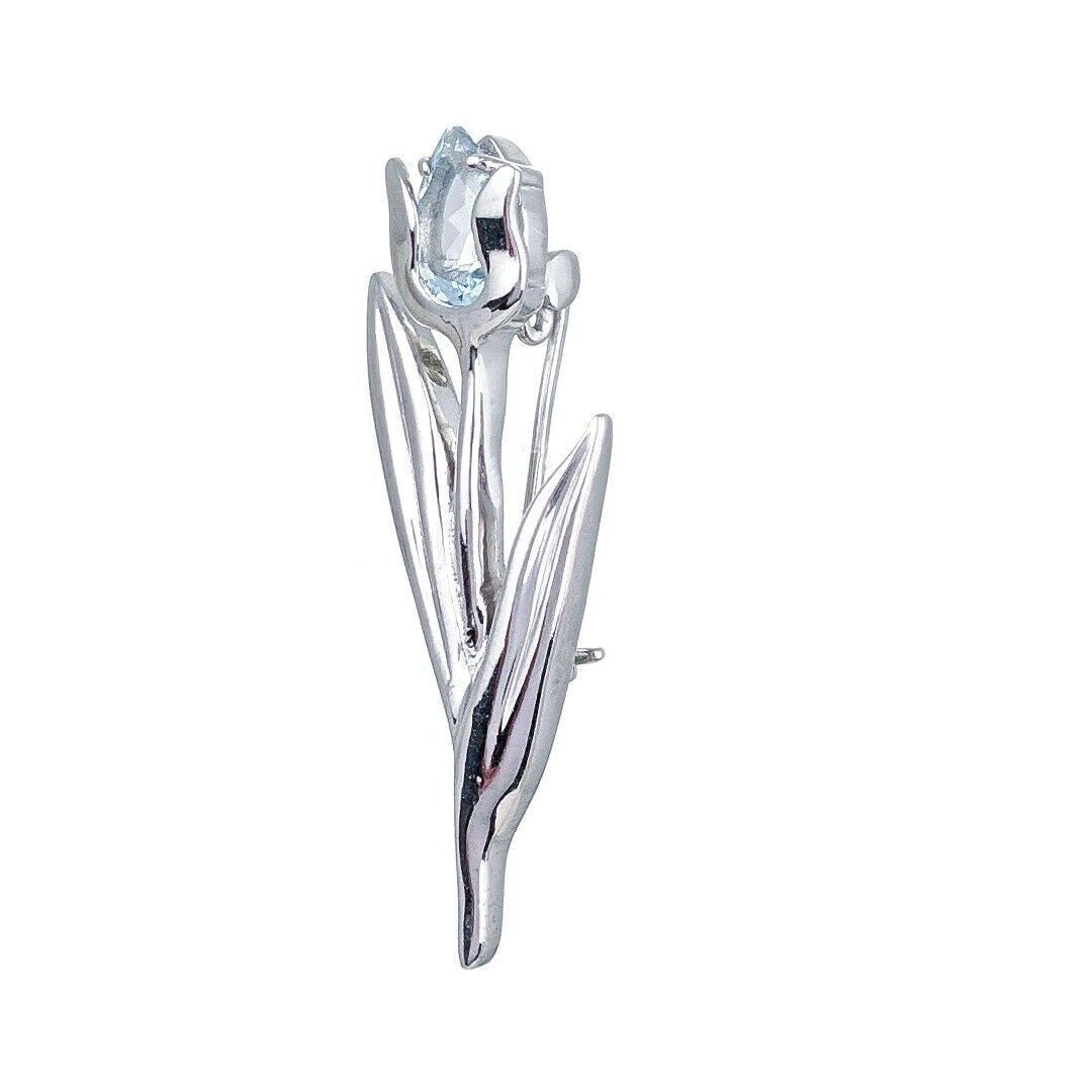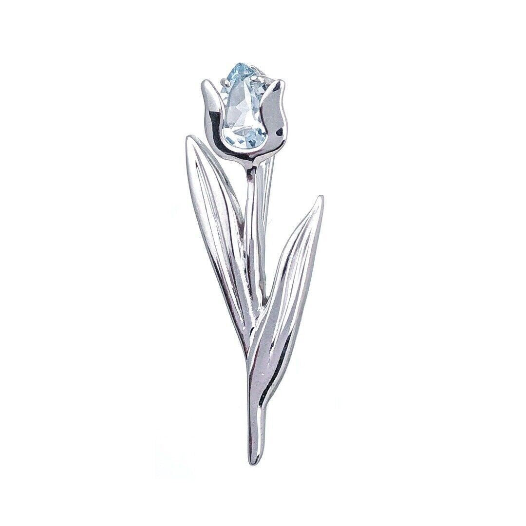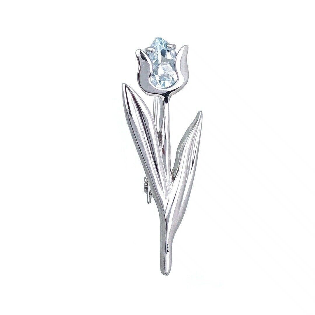 This elegant tulip flower brooch is set with a sparkling blue topaz gemstone. The natural gemstone is from Africa and measures 7 x 5mm, giving the set an approximate 0.76ct stone weight.