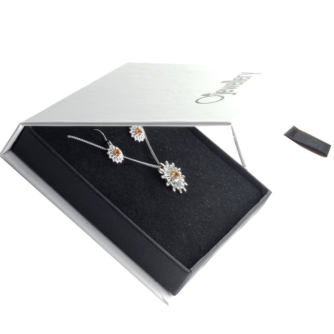It is supplied with an 18 inch sterling silver chain. The pendant, chain and earrings are finished with a commercial grade rhodium plate to give a high quality shine finish.