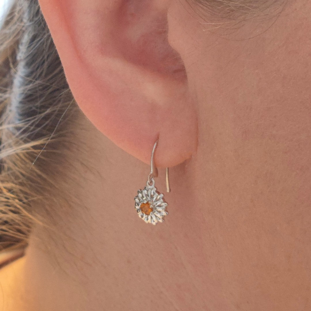 Sun pendant and matching dangle earrings each set with a vivid yellow citrine from Africa. The natural citrine is 4mm round in the pendant and 3mm round in each earring.