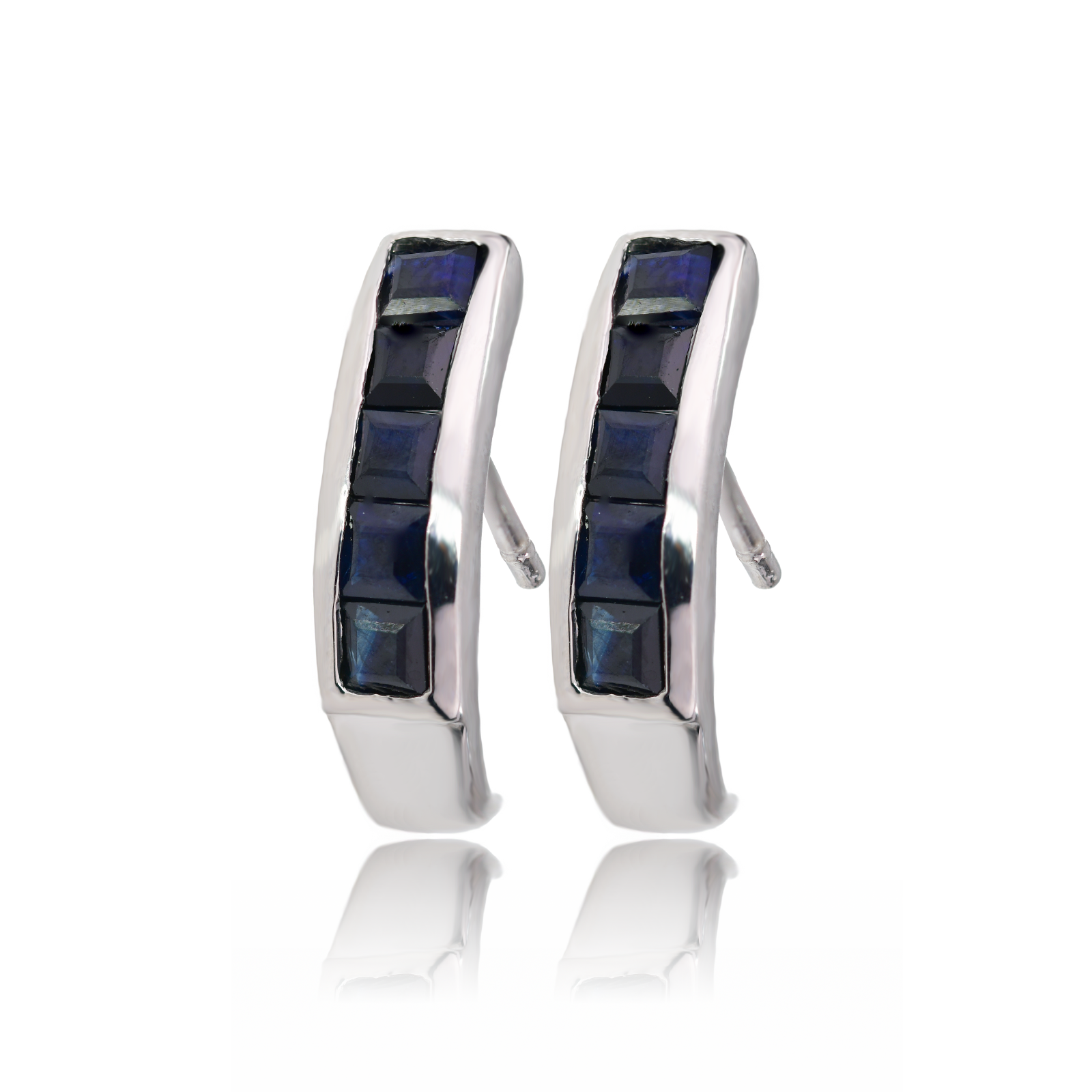 Elegant sterling silver stud earrings finished with a rhodium plate to give a bright shine. They are set with inky blue sapphires and natural near colourless diamonds.