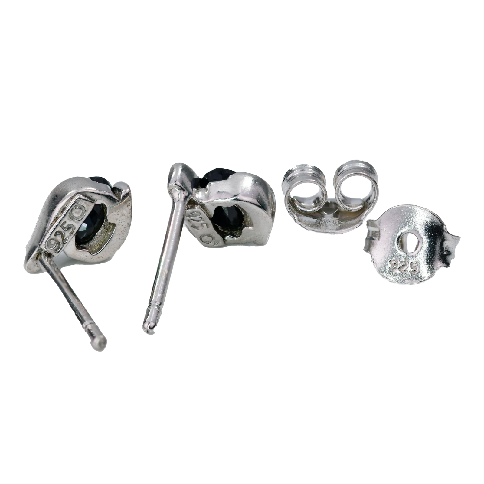 Elegant sterling silver stud earrings finished with a rhodium plate to give a bright shine. They are set with inky blue sapphires and natural near colourless diamonds.