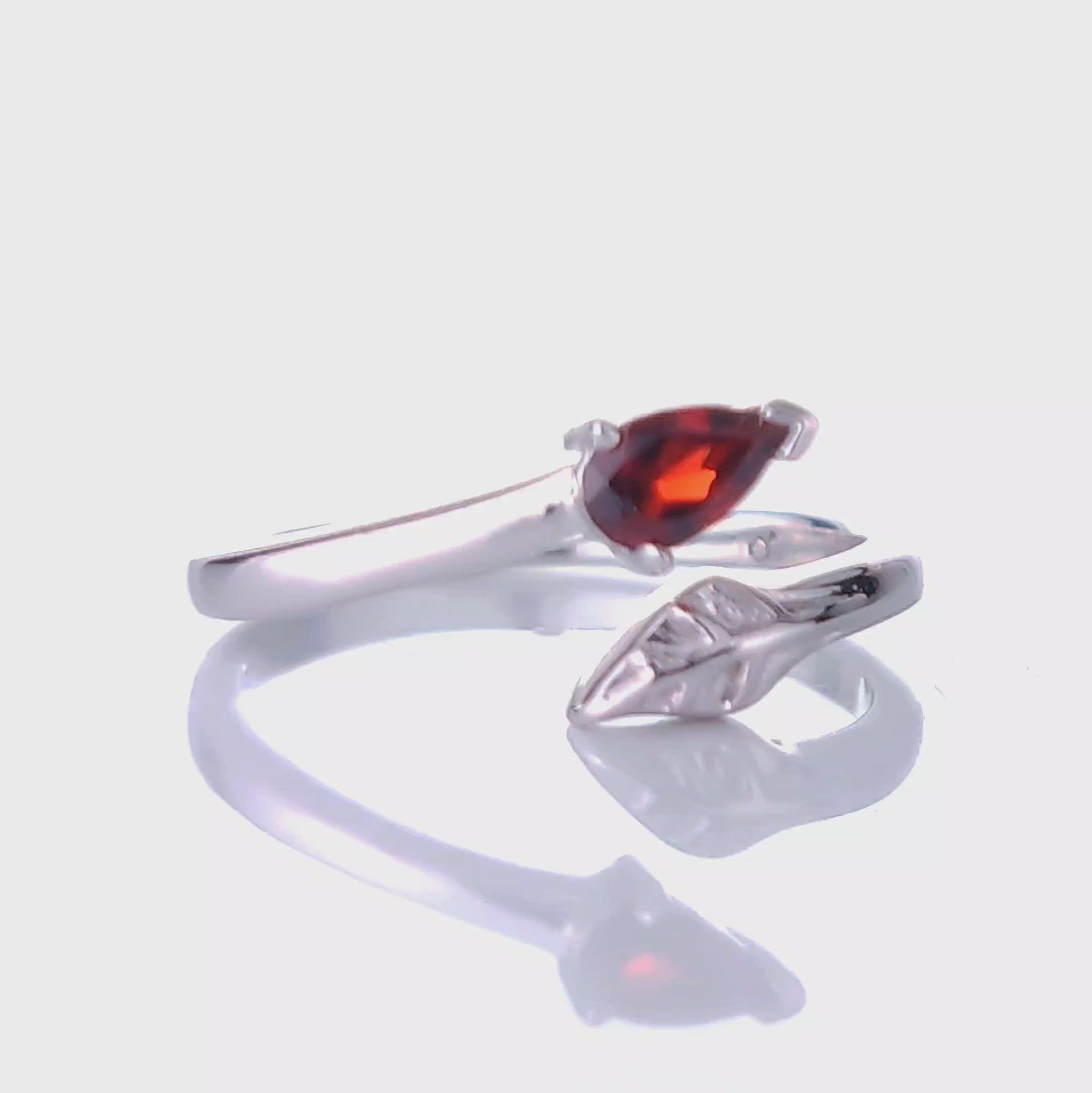 Sterling Silver Garnet Ring Leaf and stone design with a pear shaped natural Mozambique red pear garnet.