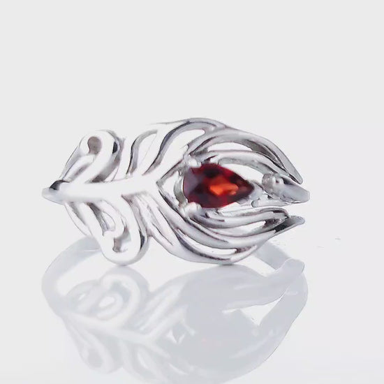 Sterling Silver Statement Garnet Ring Peacock Feather design with an eye set with a natural Mozambique pear red garnet.