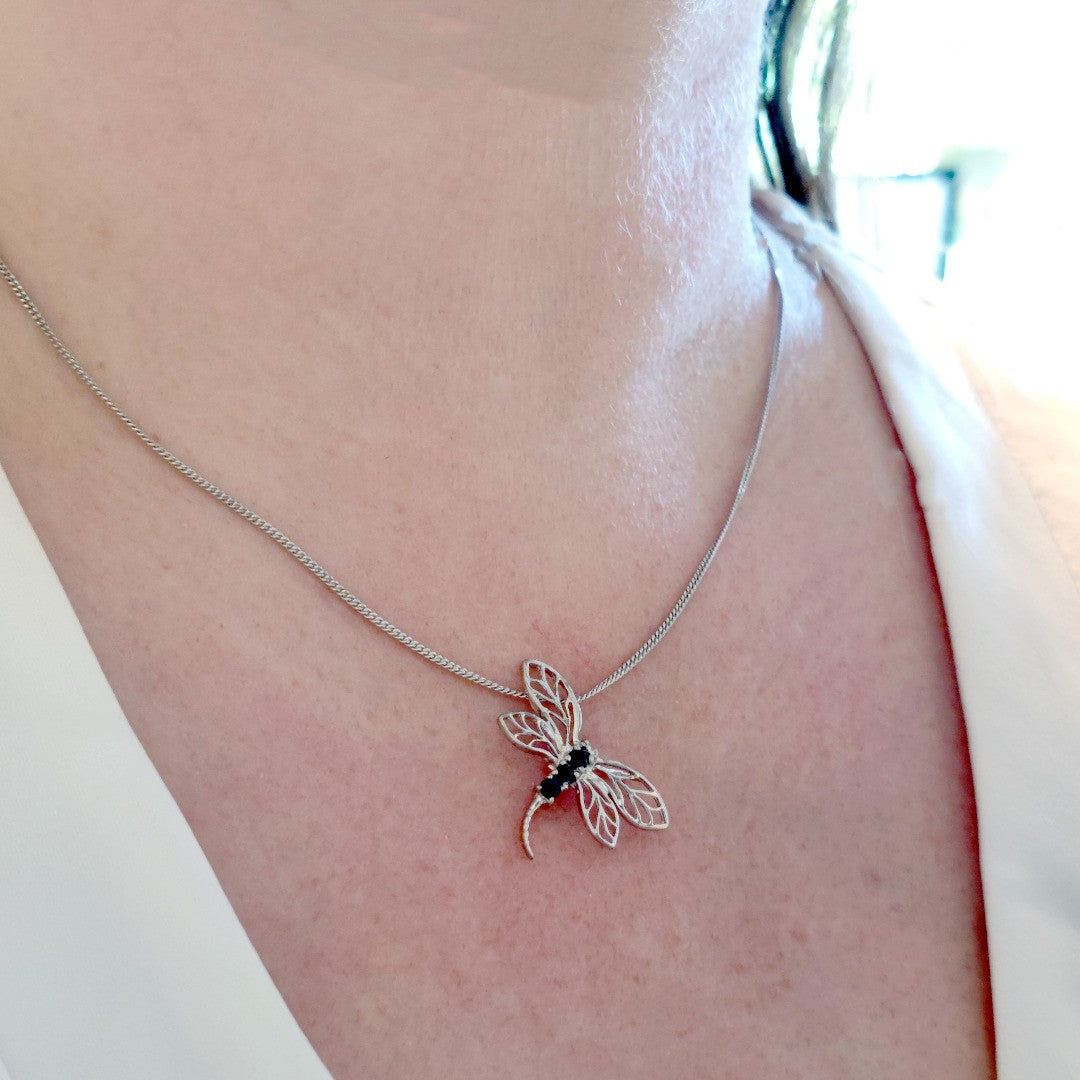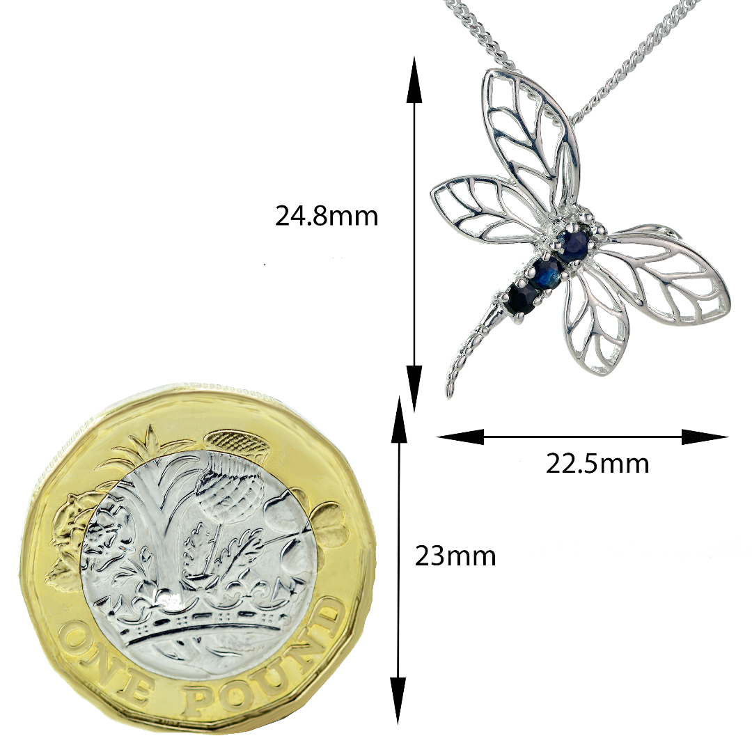 Elegant sterling silver dragonfly pendant set with elegant inky blue sapphires.