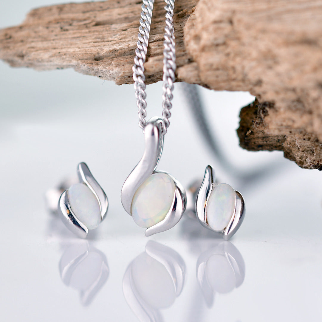 Elegant sterling silver contemporary opal necklace and stud earrings set with elegant natural Australian opals.