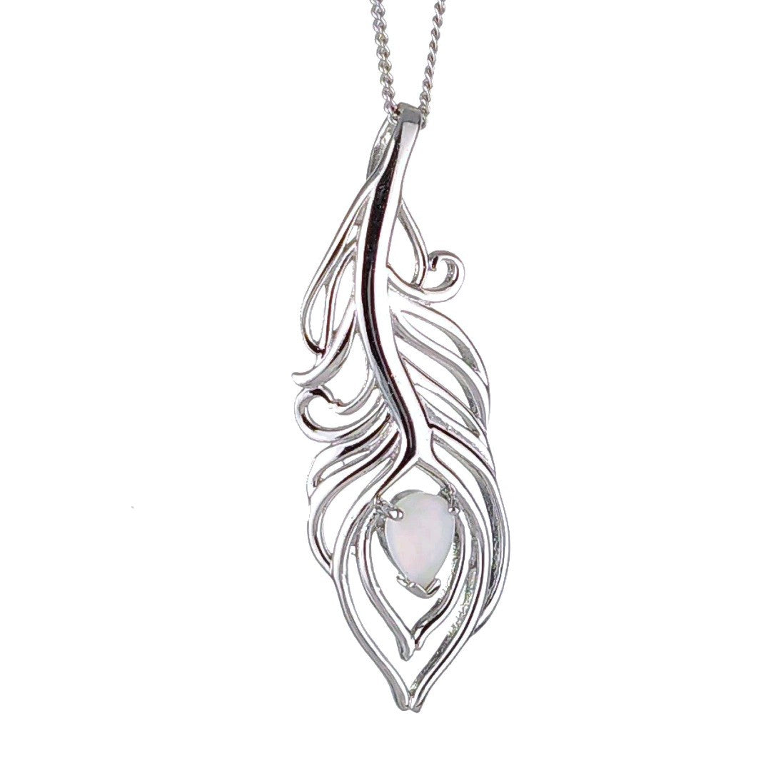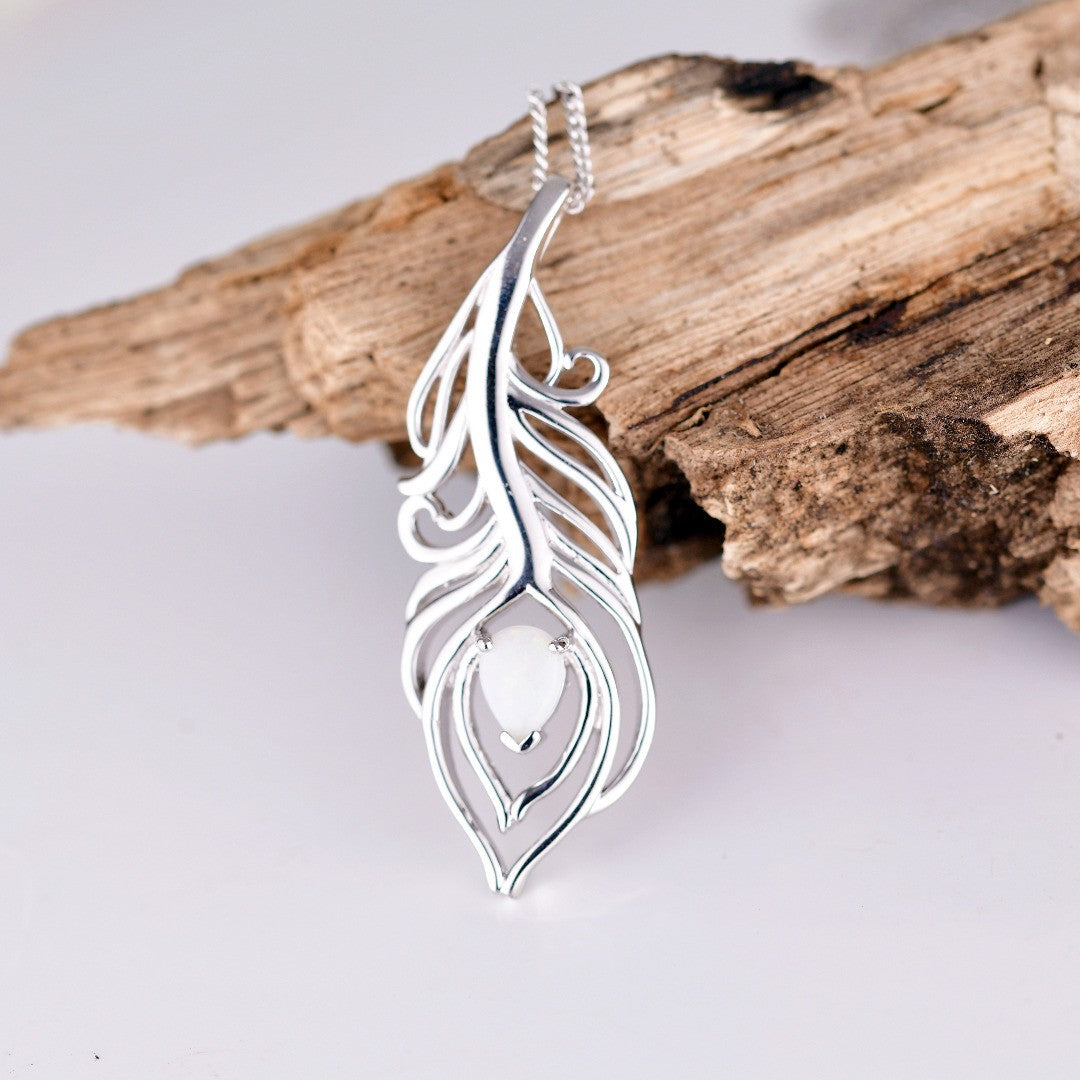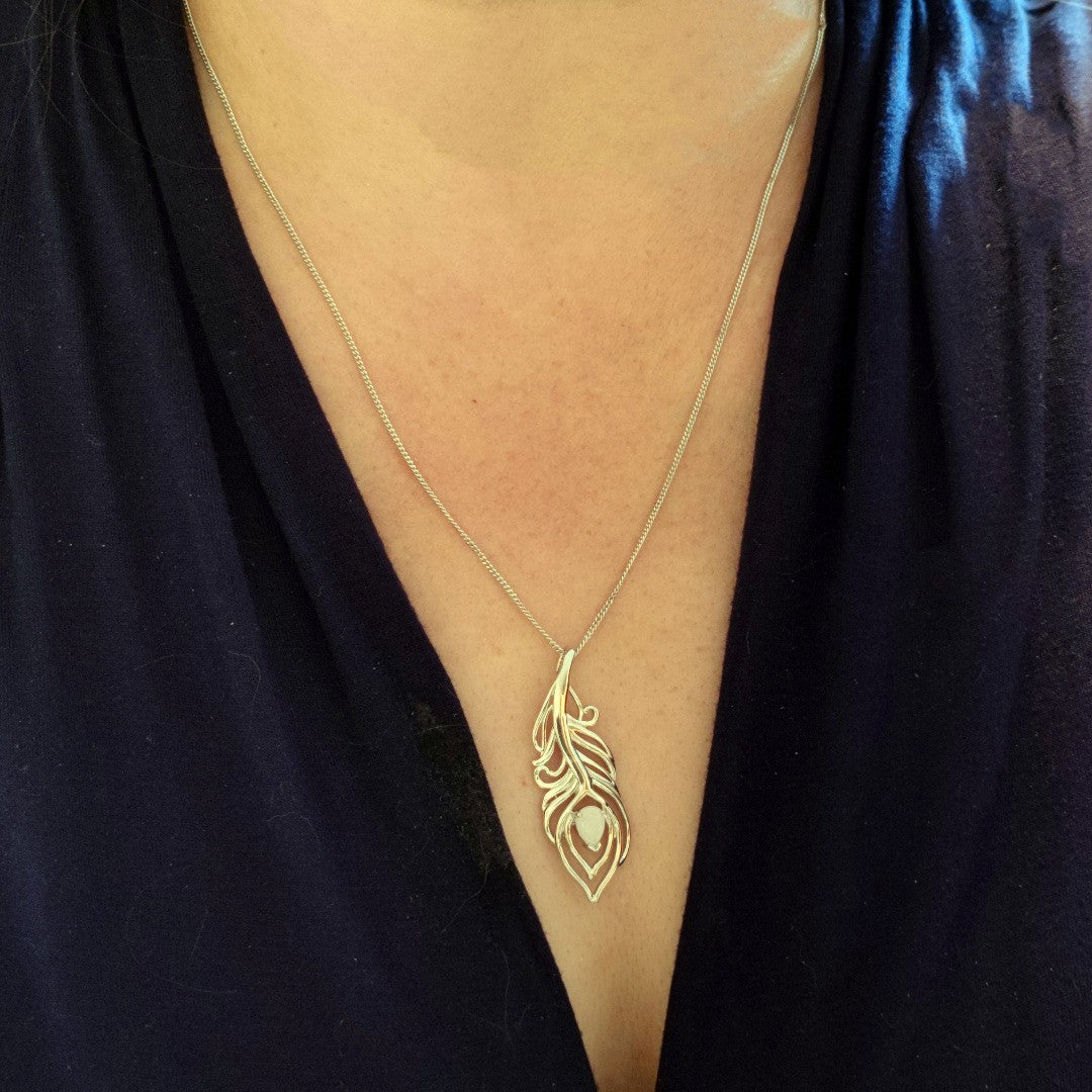 Elegant peacock feather statement necklace set with a pear shaped natural Australian milky white opal. The opal is 7mm long by 5mm.