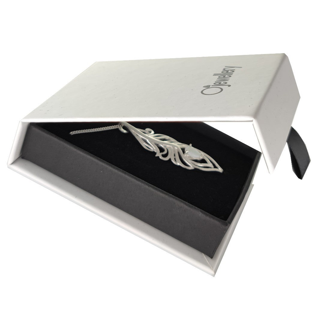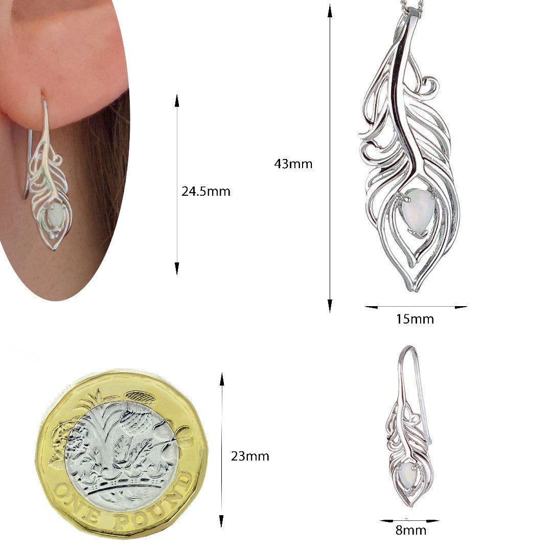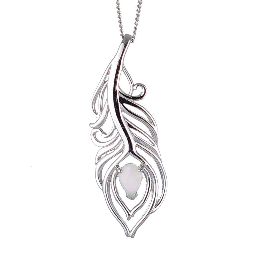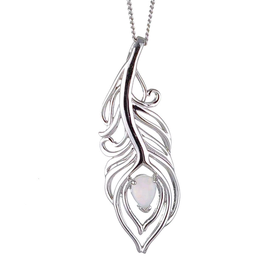 Elegant peacock feather statement necklace set with a pear shaped natural Australian milky white opal. The opal is 7mm long by 5mm.