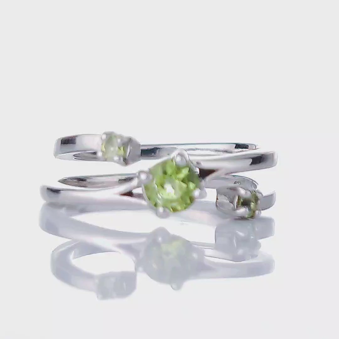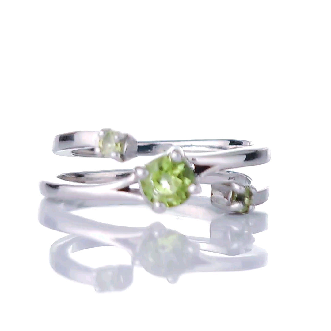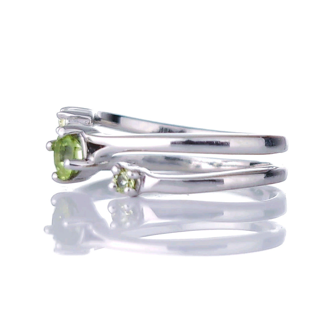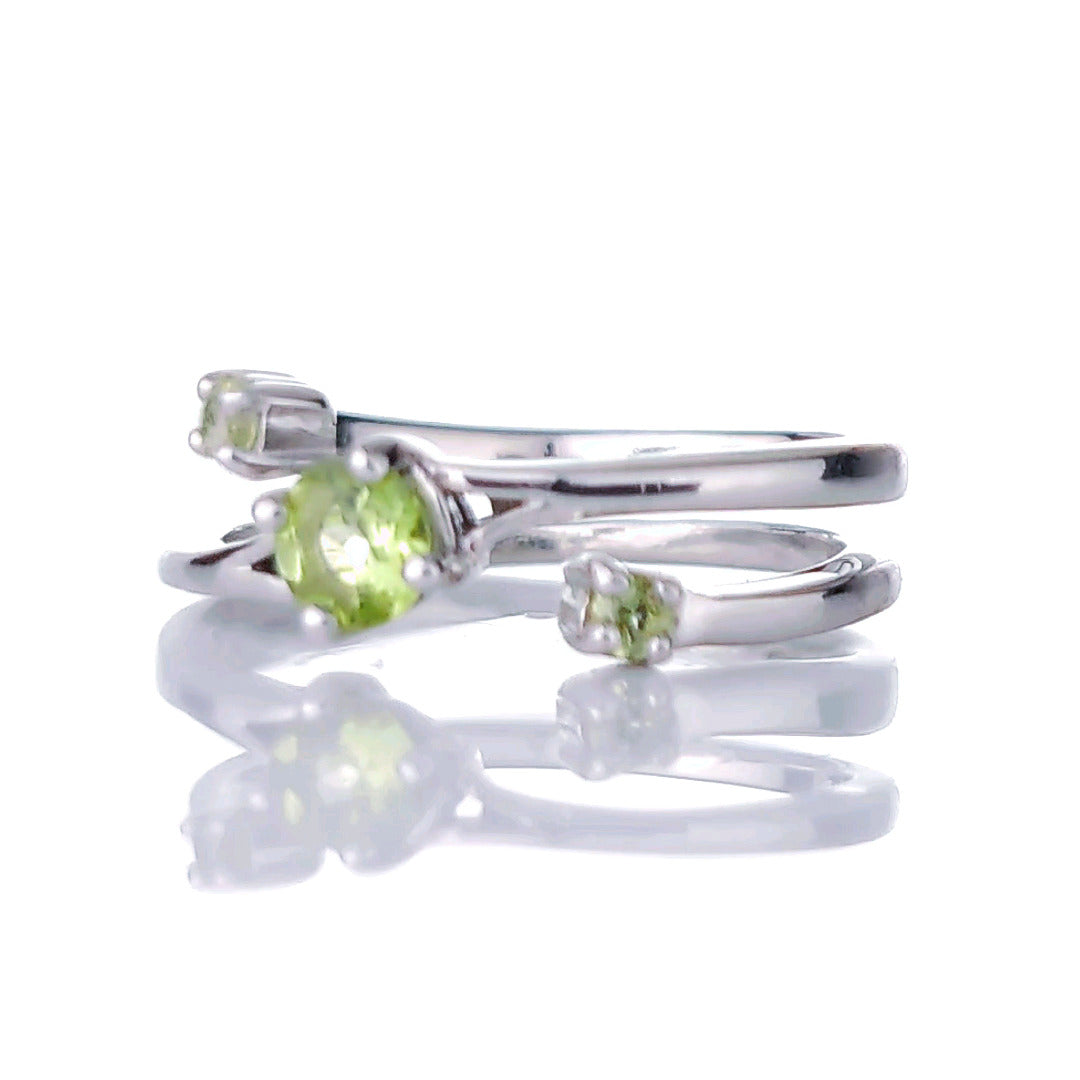 Sterling Silver Peridot Trilogy Statement Double Band Ring. Set with three round natural Arizona USA green peridot