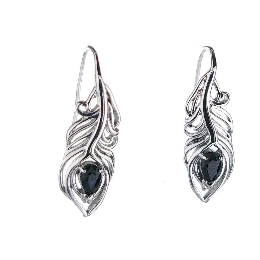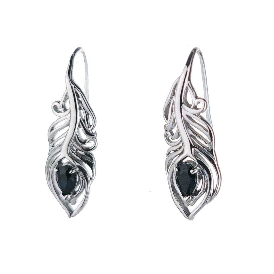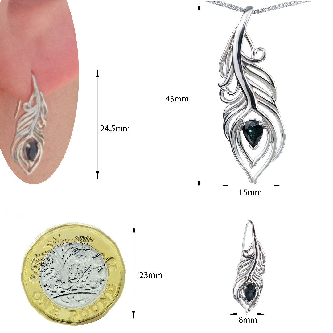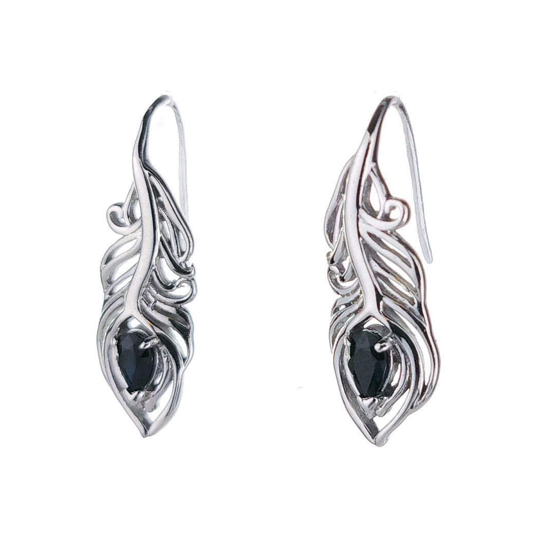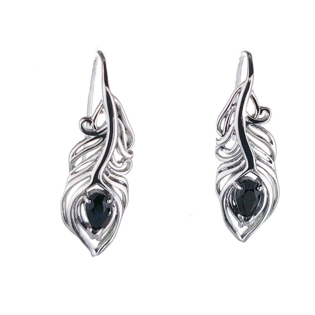 Sterling Silver Sapphire Earrings Dangle Peacock Feather Hook September Birthstone