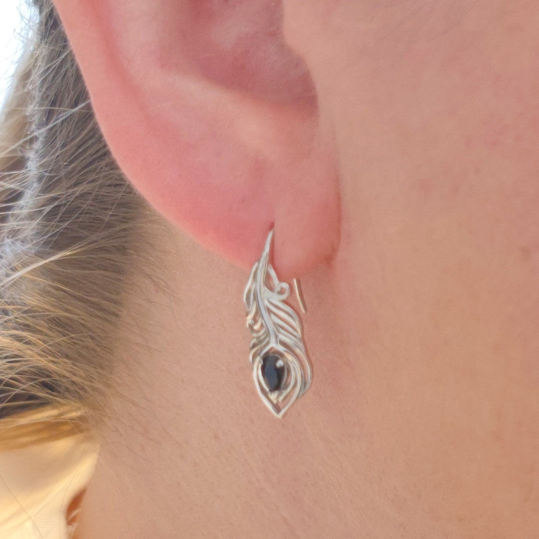 Sterling Silver Sapphire Peacock Feather design dangle Earrings with an eye set with a natural Australian pear inky blue sapphires.