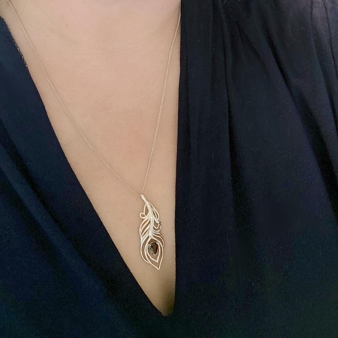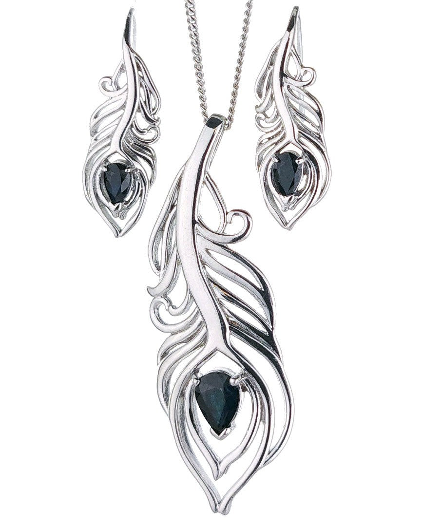Elegant peacock feather statement pendant and matching dangle earrings each set with a pear shaped natural Australian inky blue sapphire.