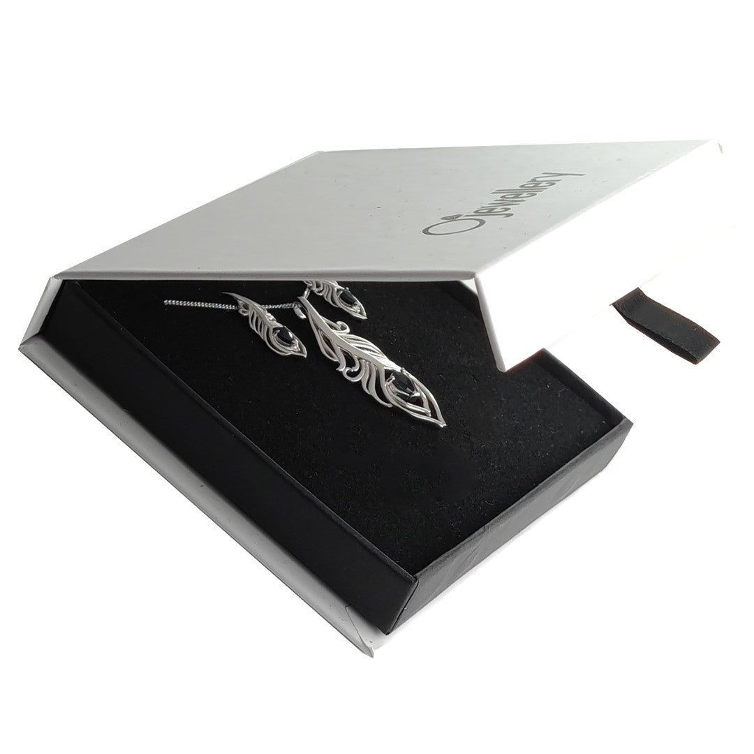 Sterling Silver Sapphire Set Statement Necklace Dangle Earrings Peacock Feather September Birthstone