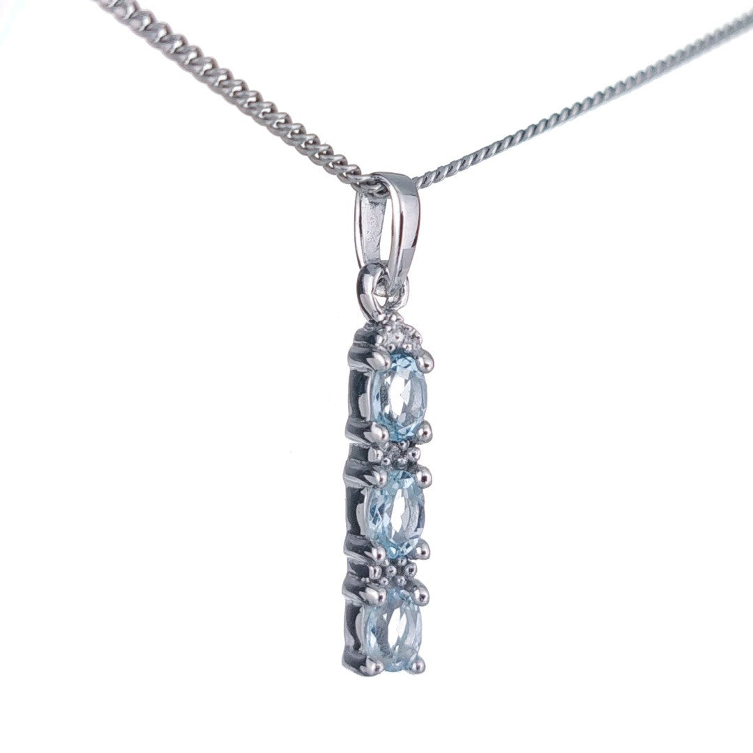 Elegant sterling silver pendant finished with a rhodium plate to give a bright shine. Set with natural African blue topaz and natural near colourless diamonds.