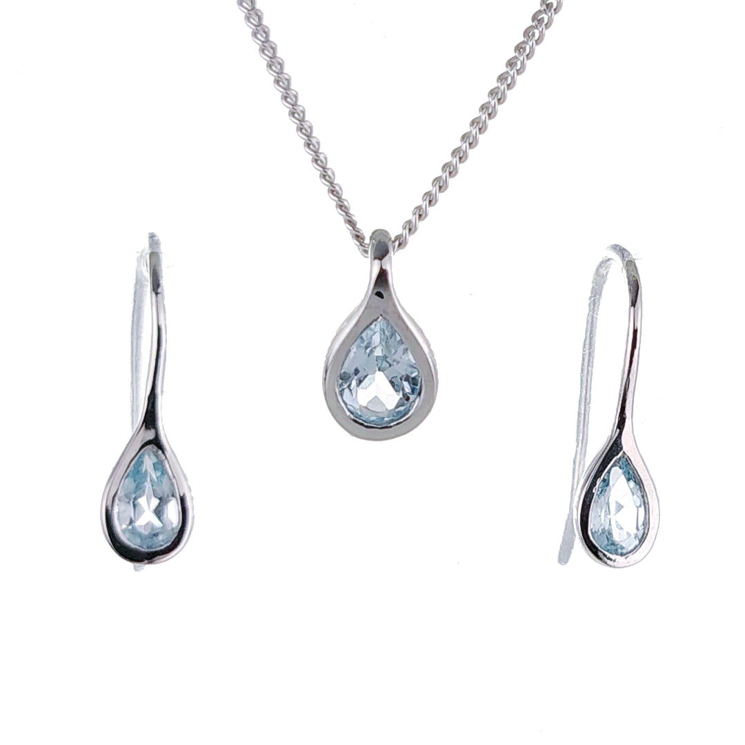 Elegant pear topaz in a rubover setting. Pendant on a chain and matching dangle earrings. Natural African blue topaz 6mm long by 4mm in pendant and 5 x 3mm in each dangle earring giving a total carat weight of 1ct.