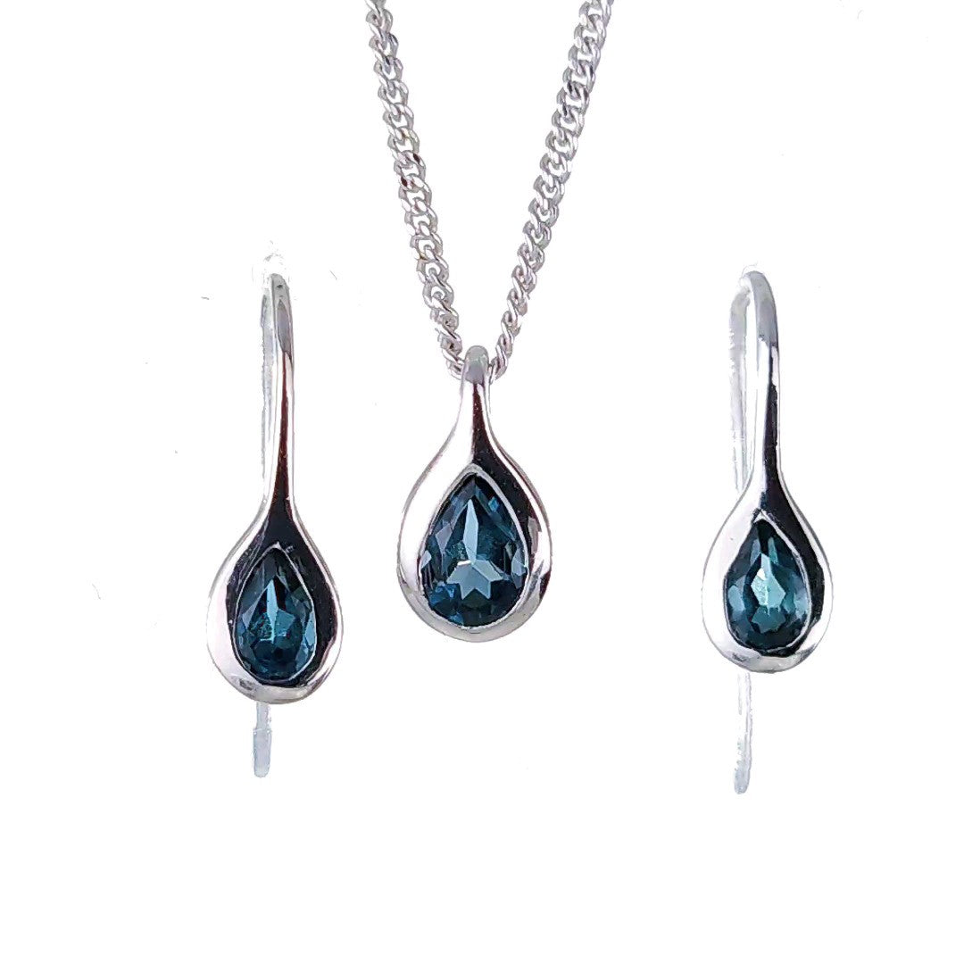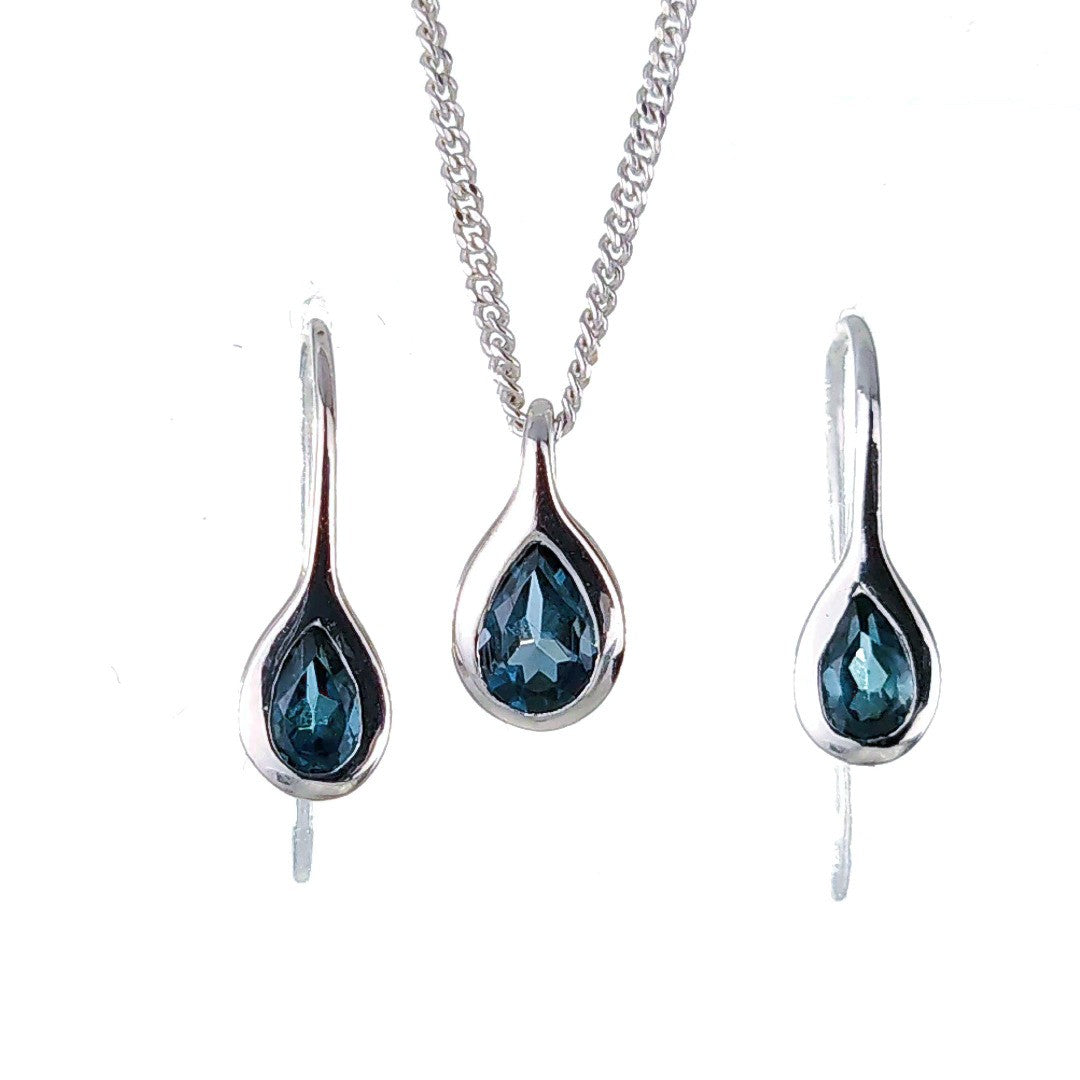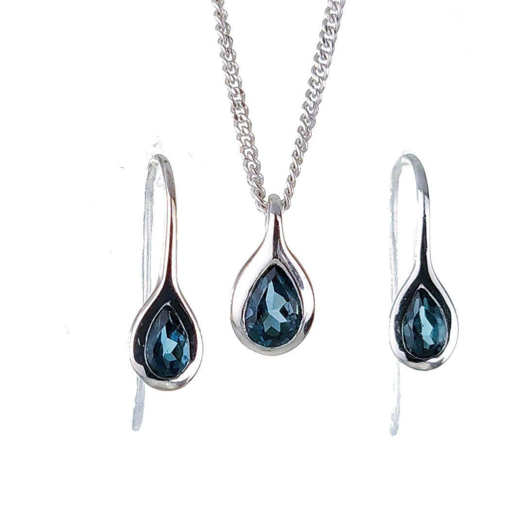 Topaz Necklace Earring Set 1ct Pear London Blue Sterling Silver Boxed Gift