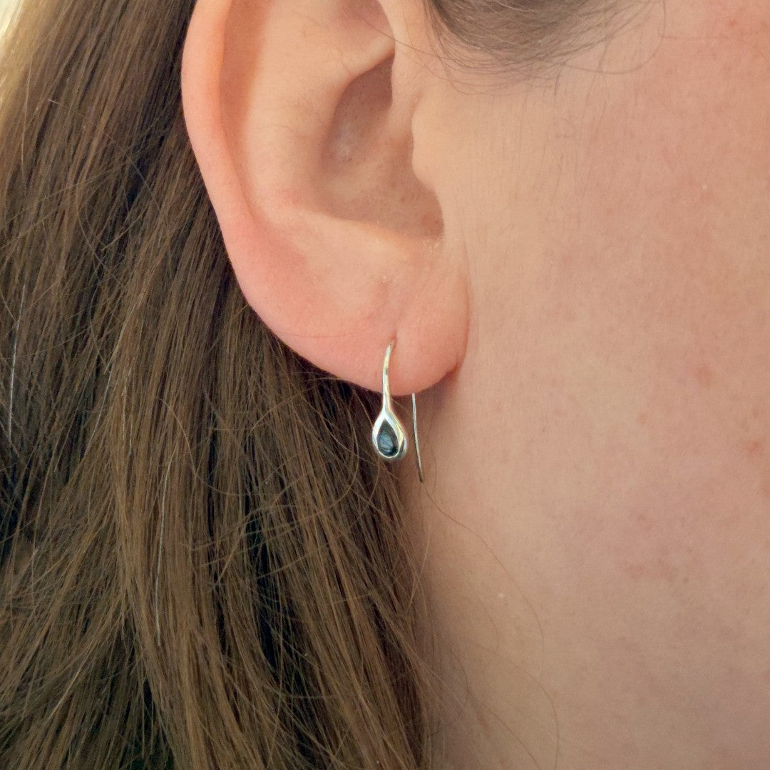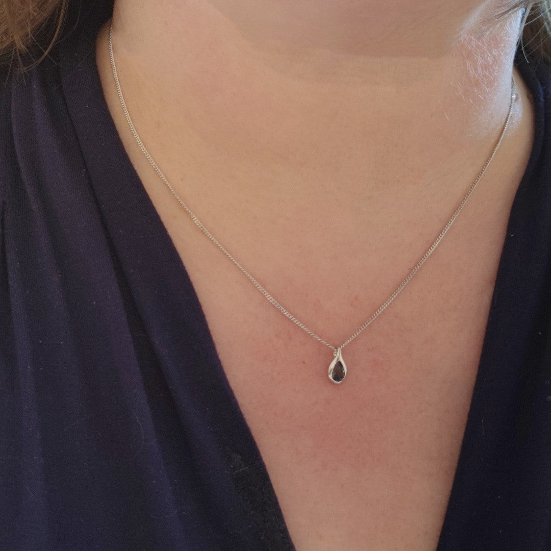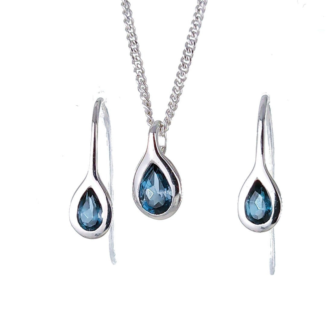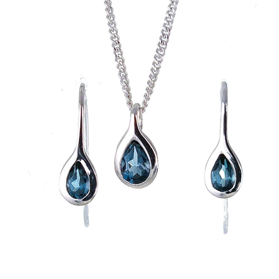Elegant pear topaz in a rubover setting. Pendant on a chain and matching dangle earrings. Natural African blue topaz 6mm long by 4mm in pendant and 5 x 3mm in each dangle earring giving a total carat weight of 1ct.
