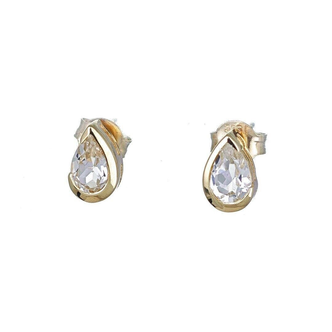 These elegant white topaz pear stud earrings are designed in the UK and feature natural topaz gemstones. The stones are set in a raised rubover setting made of 9ct yellow gold to allow light to the back of the stone and show off its natural sparkle. The stones measure 6x4mm.