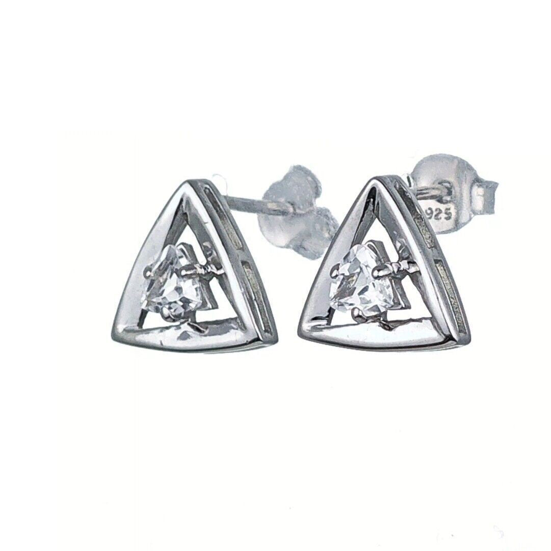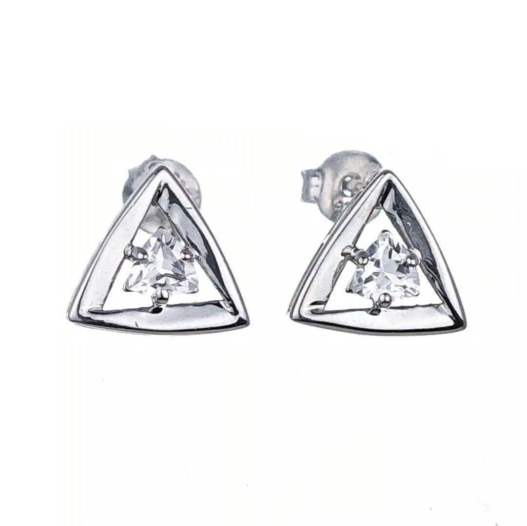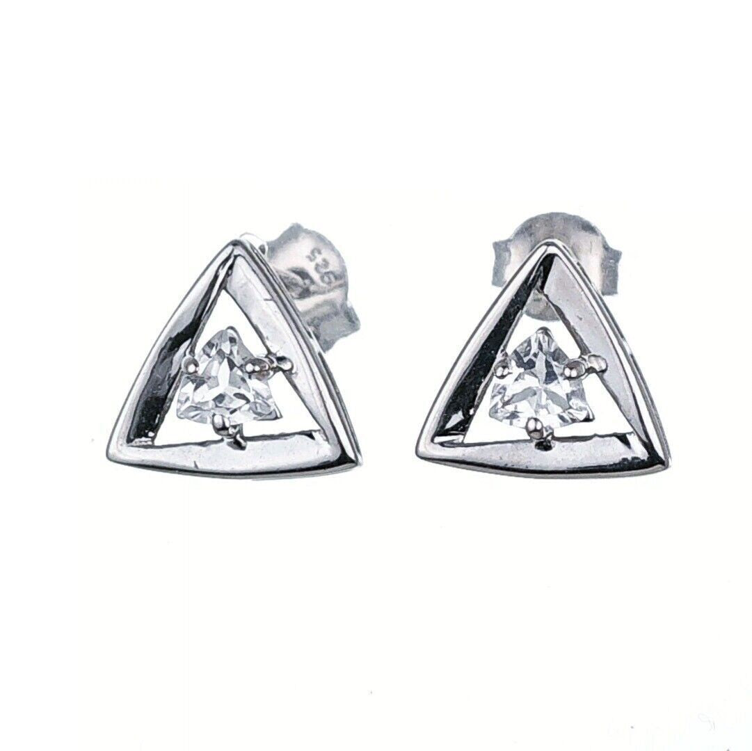 Trillion cut natural stones set in a triangle made of sterling silver. Each stone measures 4 x 4mmWhite topaz are associated with love self esteem and good fortune. They are the birthstone for April.These elegant earrings are suitable to wear for daytime or evening wear.Finished with a commercial grade rhodium plate to give a high quality shine finish.Supplied in an Ojewellery presentation box, within a ribbon handled gift bag, complete with product information authenticity card with space for a gift message and a jewellery cleaning cloth to keep your jewellery in ready to wear condition.Our jewellery packaging is from an FSC chain of custody audited supplier and our very short supply chains mean we are able to trace our natural gemstones back to country of origin.Specification:Fastening: ButterflyEarring Drop: 10.2mmEarring Width: 10.7mmWeight of pair:1.9gStones Natural African White Topaz trillion cut 2qty 4 x 4mm