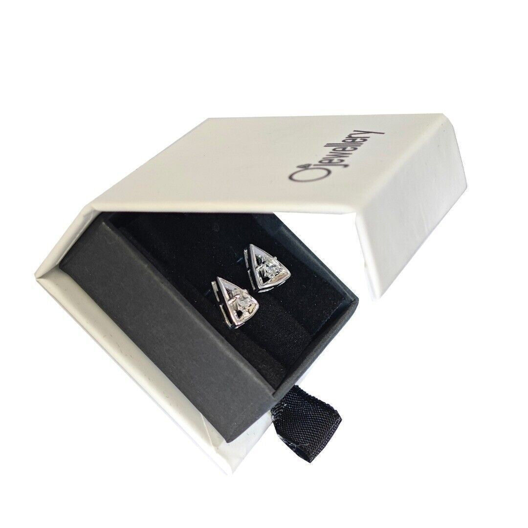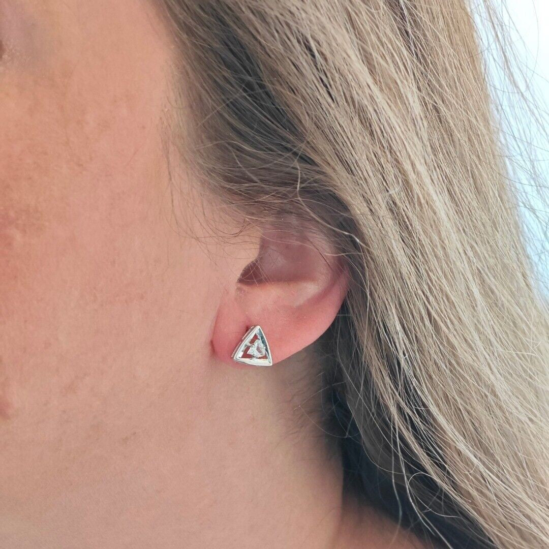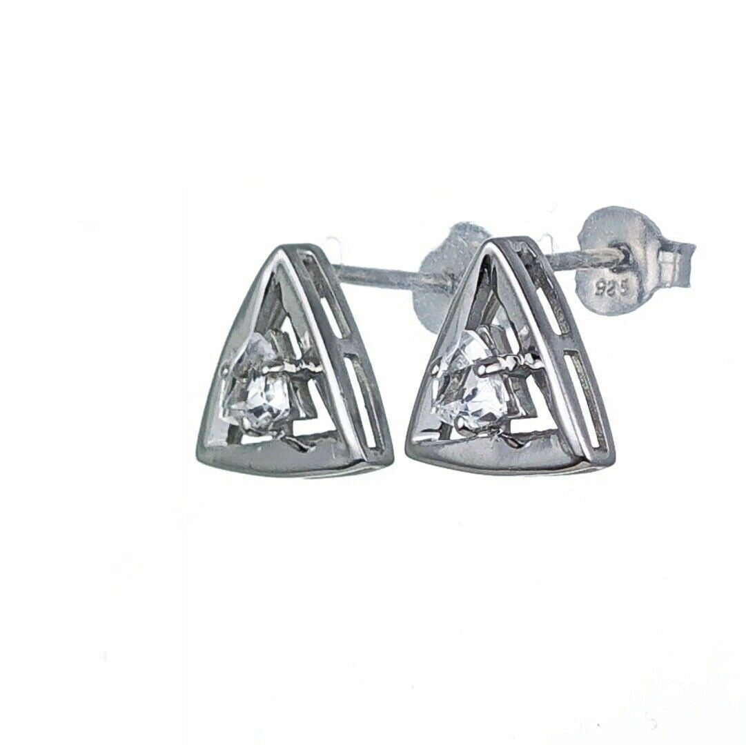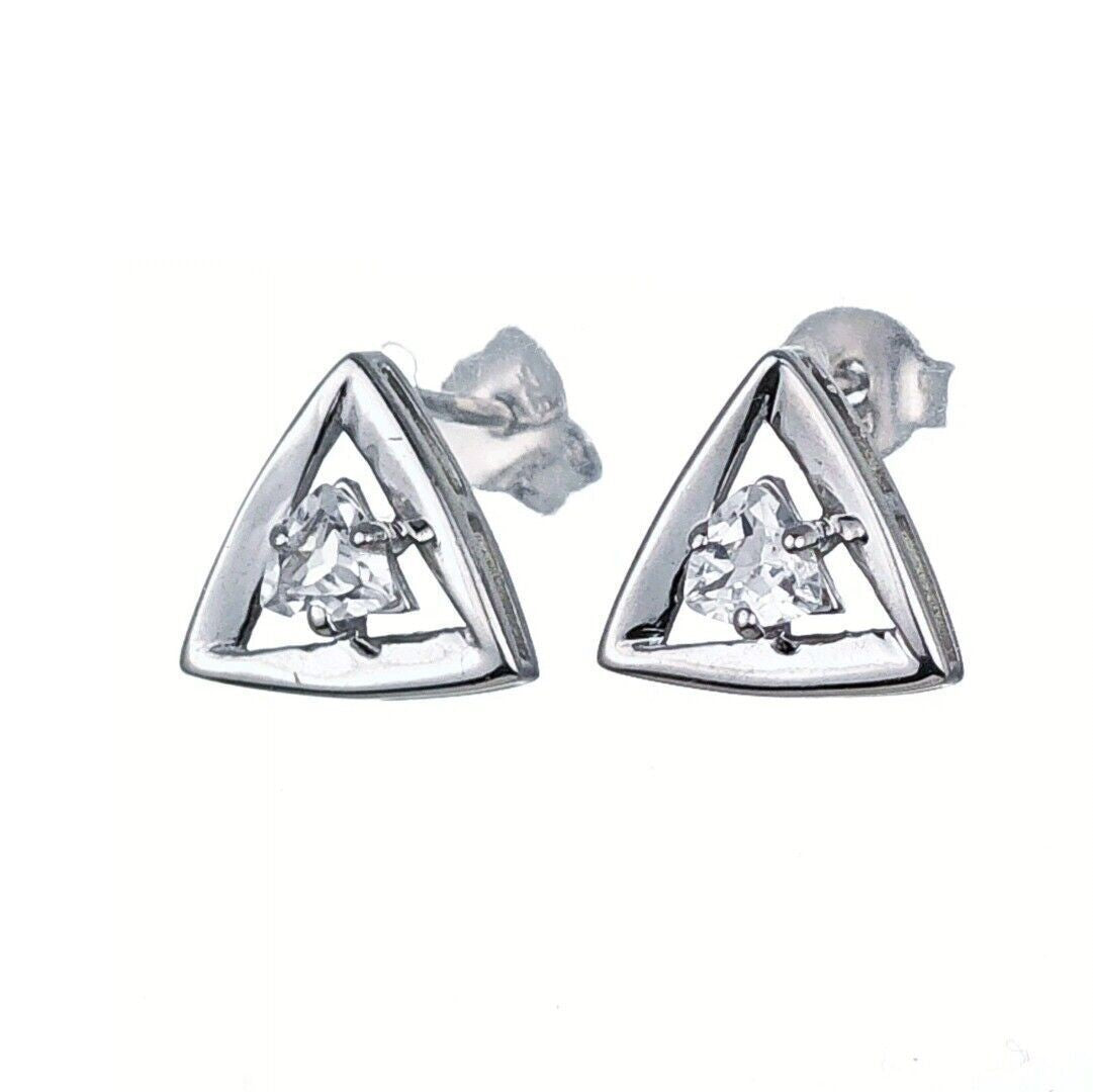 Trillion cut natural stones set in a triangle made of sterling silver. Each stone measures 4 x 4mmWhite topaz are associated with love self esteem and good fortune. They are the birthstone for April.These elegant earrings are suitable to wear for daytime or evening wear.Finished with a commercial grade rhodium plate to give a high quality shine finish.Supplied in an Ojewellery presentation box, within a ribbon handled gift bag, complete with product information authenticity card with space for a gift message and a jewellery cleaning cloth to keep your jewellery in ready to wear condition.Our jewellery packaging is from an FSC chain of custody audited supplier and our very short supply chains mean we are able to trace our natural gemstones back to country of origin.Specification:Fastening: ButterflyEarring Drop: 10.2mmEarring Width: 10.7mmWeight of pair:1.9gStones Natural African White Topaz trillion cut 2qty 4 x 4mm