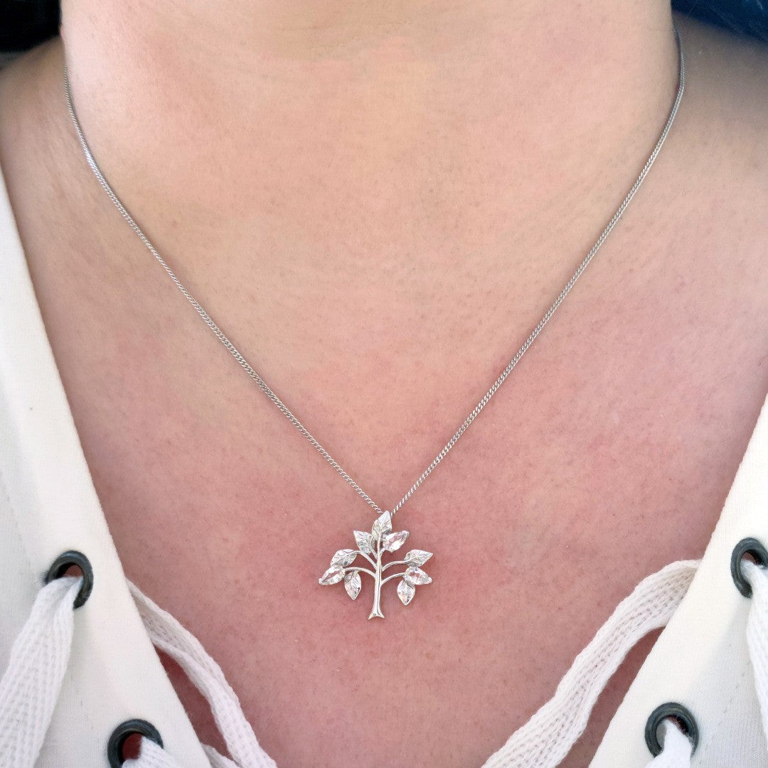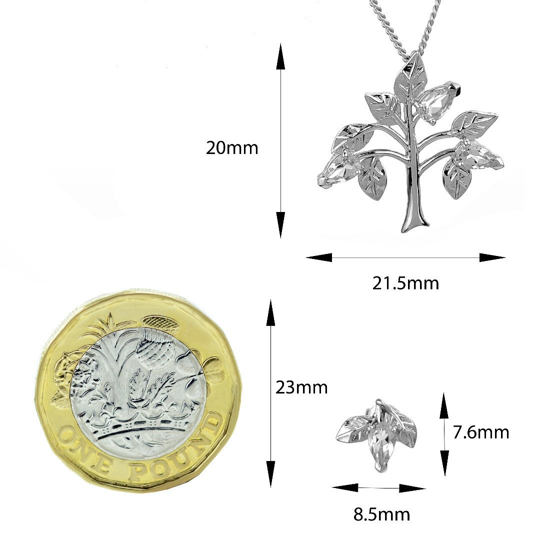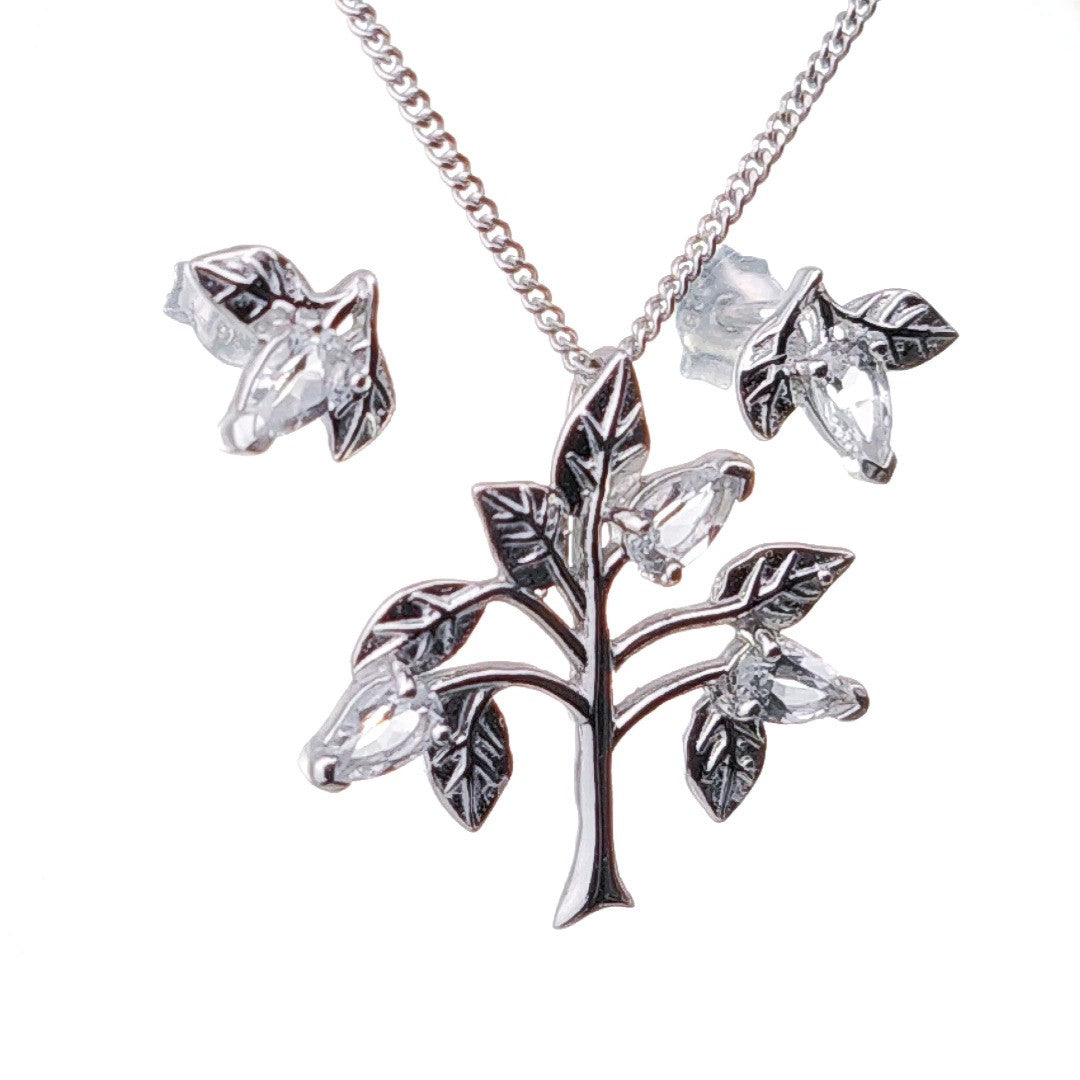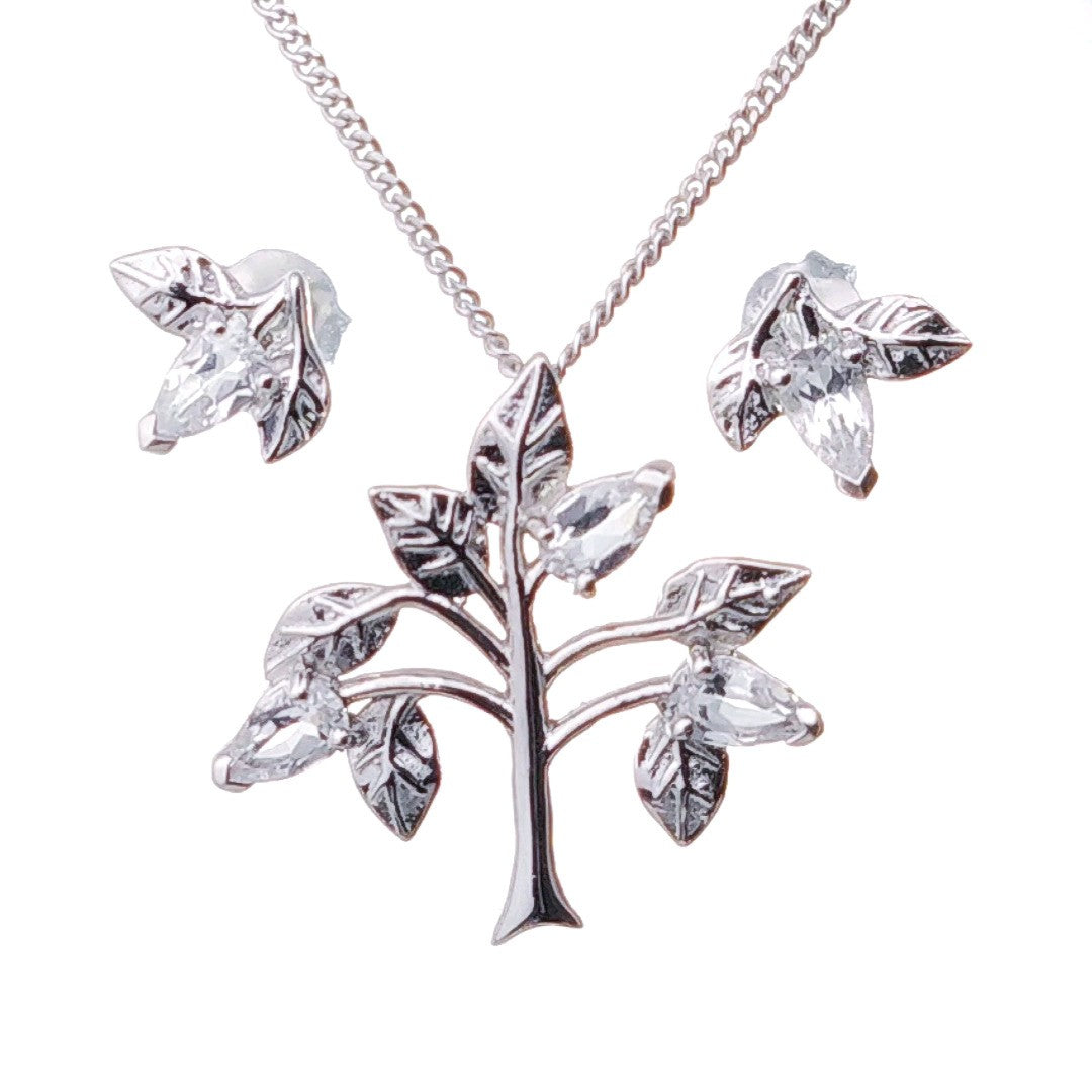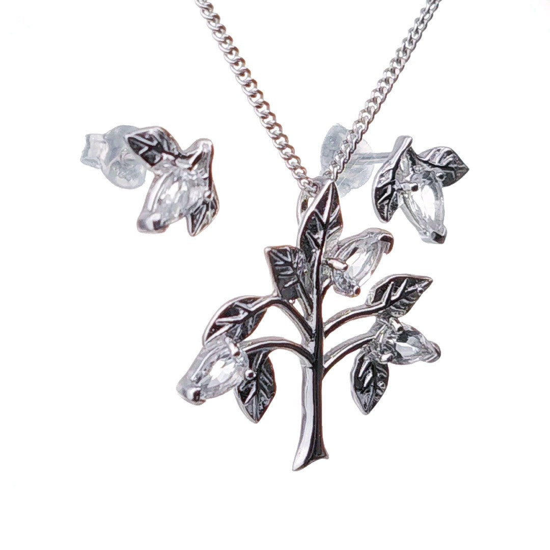 White Topaz Necklace Earring Set 1.25ct Pear Tree of Life Leaves Sterling Silver