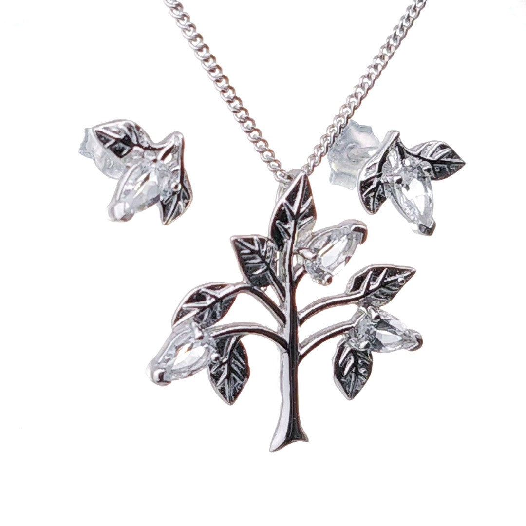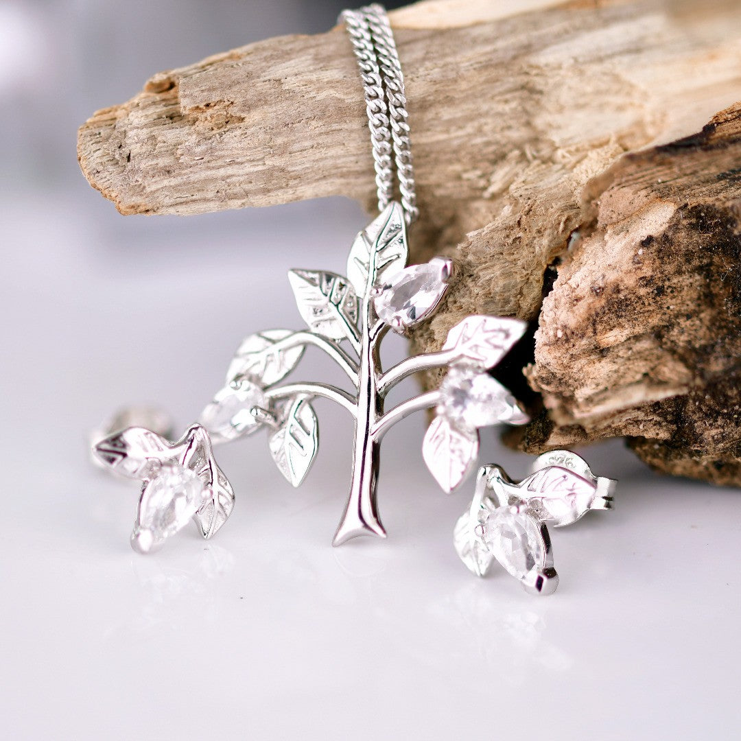 Elegant Tree of Life trilogy stone pendant set with three natural African sparkling white topaz and matching topaz stud earrings. The five topaz are 3mm x 5mm giving a total carat weight of 1.25ct.