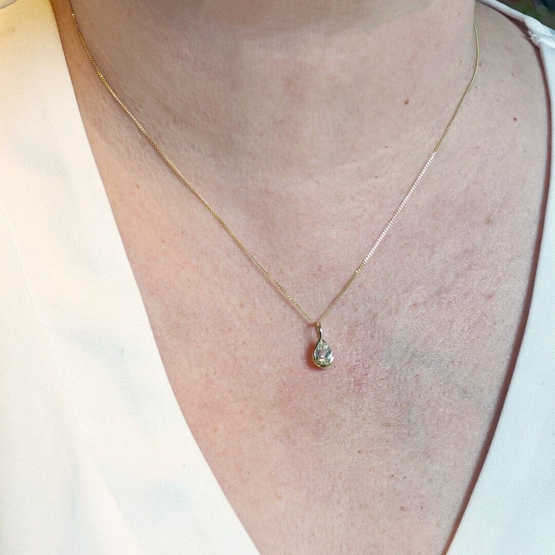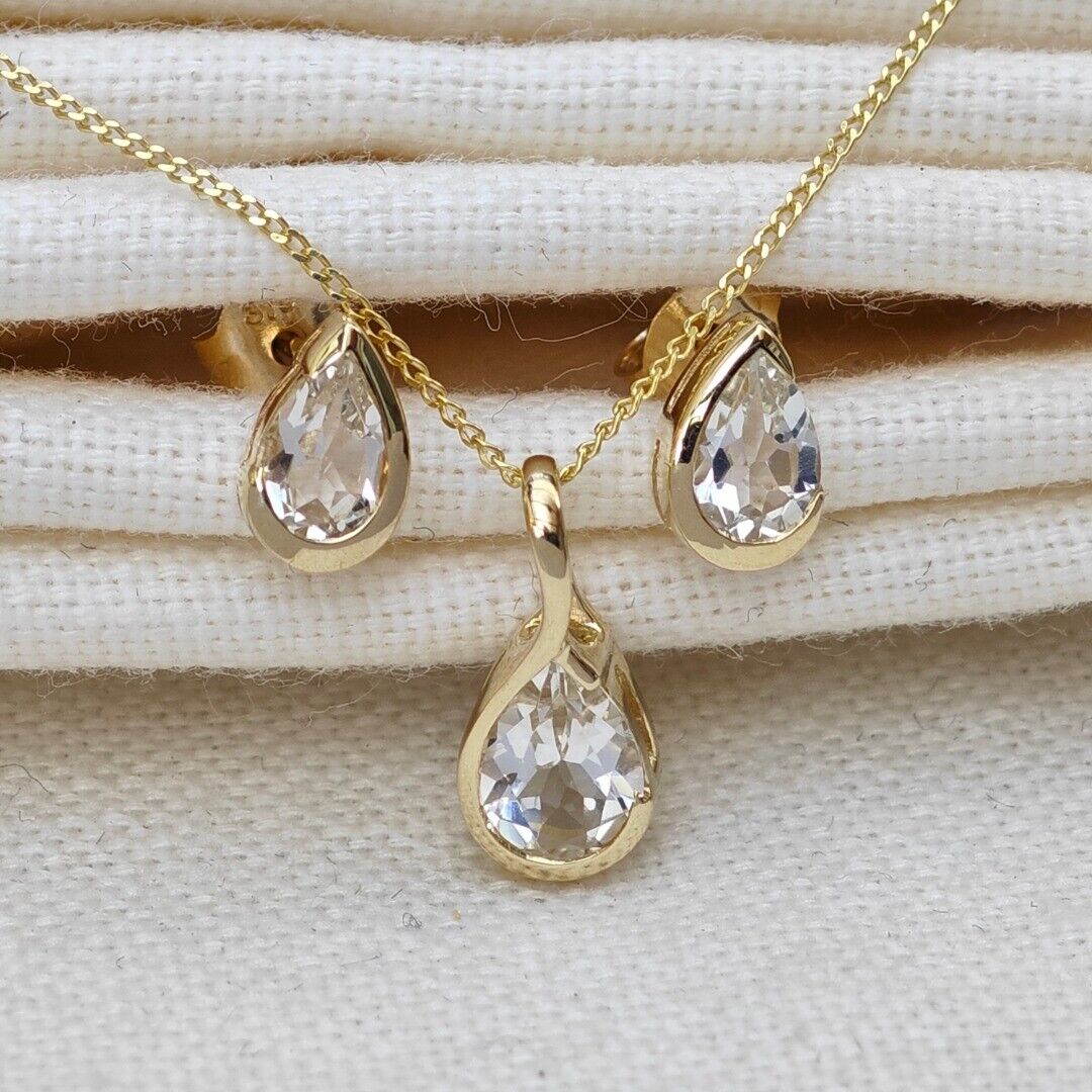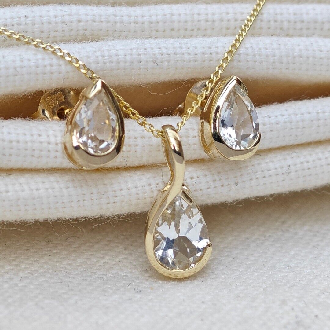 This elegant topaz pear pendant and earrings set is designed in the UK and handmade. It features natural topaz gemstones. The stones are set in a raised rubover setting made of 9ct yellow gold to allow light to the back of the stone and show off its natural sparkle.