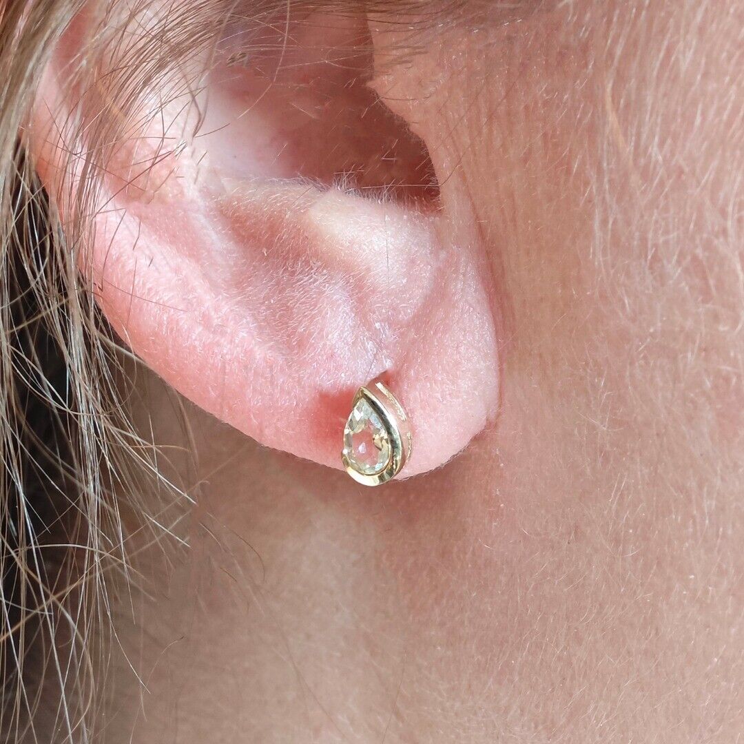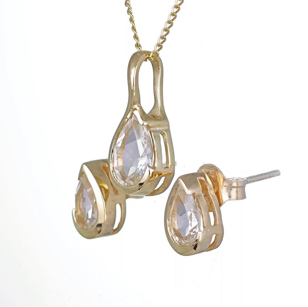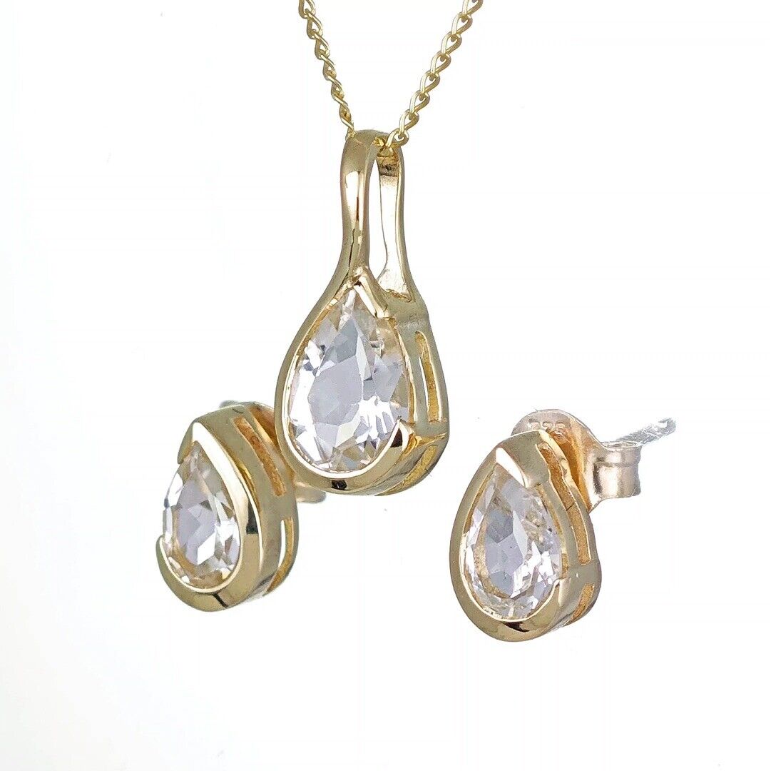 This elegant topaz pear pendant and earrings set is designed in the UK and handmade. It features natural topaz gemstones. The stones are set in a raised rubover setting made of 9ct yellow gold to allow light to the back of the stone and show off its natural sparkle.